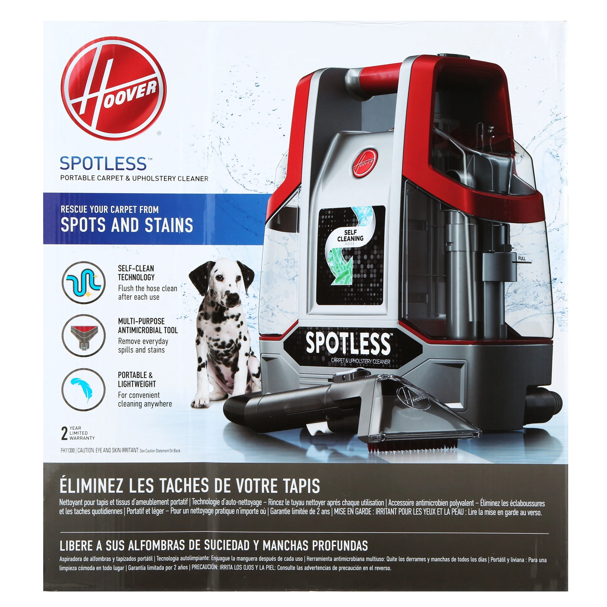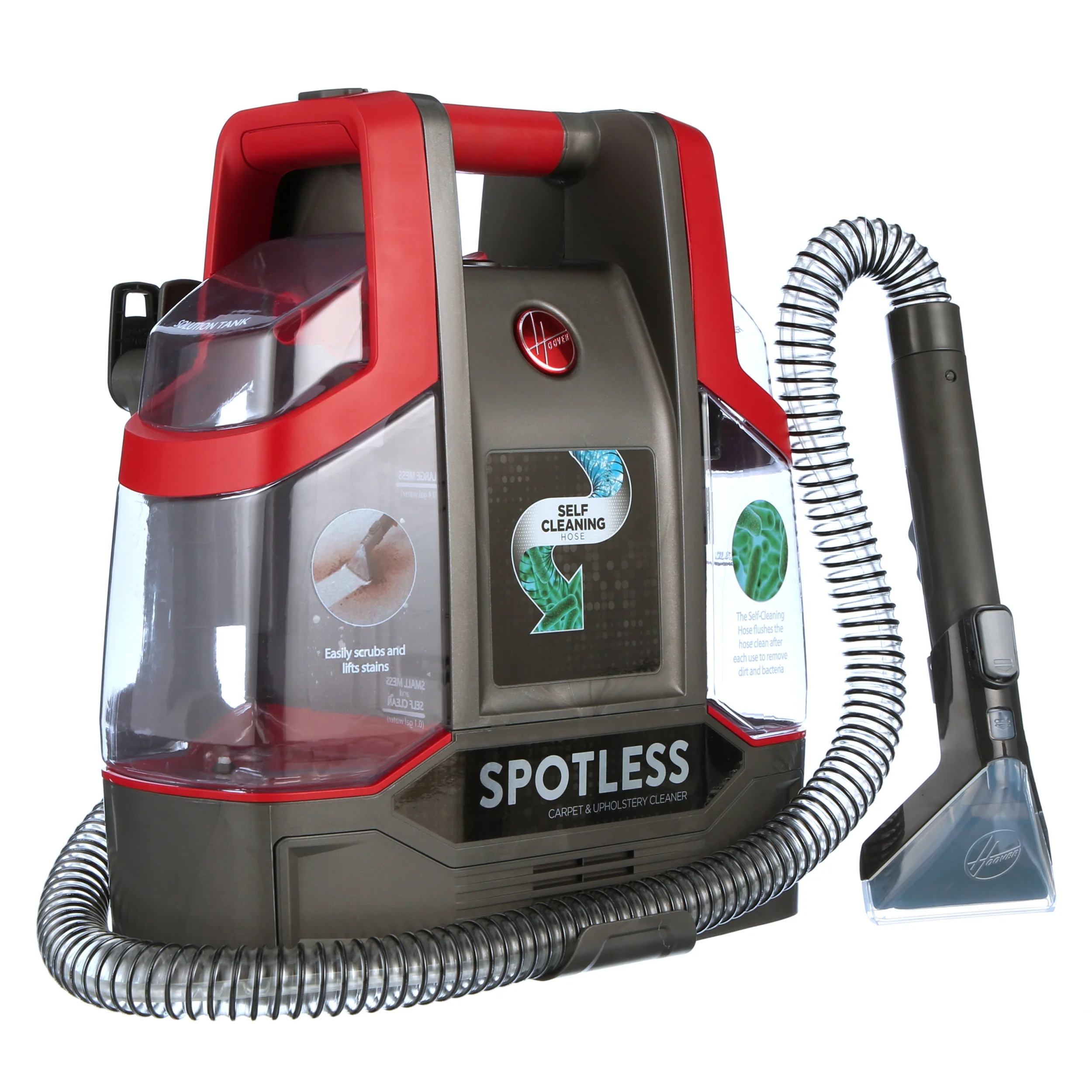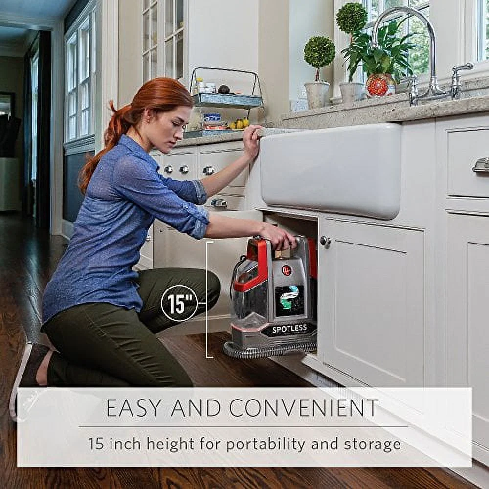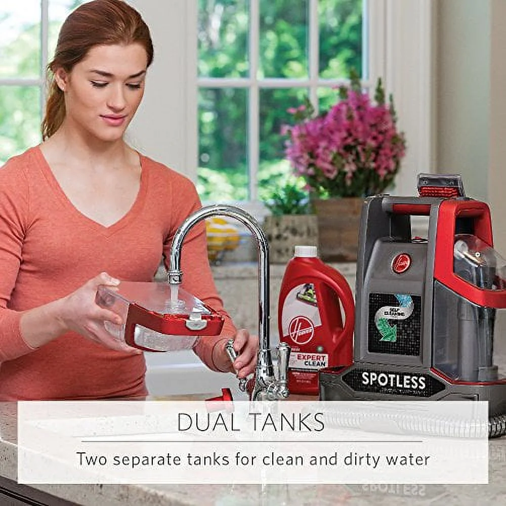 PORTABLE CARPET CLEANER MACHINE: Featuring a lightweight design, the Hoover Spotless Carpet Cleaning Machine is perfect for cleaning stains wherever and whenever they happen. CONVENIENT DEEP CLEAN: This spot and upholstery cleaner machine sprays and scrubs to remove everything from pet messes to everyday mishaps. With a 5 ft hose, it can easily reach spots and stains on carpet, upholstery, stairs and more. SELF-CLEANING TECHNOLOGY: The Spotless automatically flushes the hose after every use to remove dirt so it’s always ready for the next mess. DUAL TANK DESIGN: This Hoover carpet cleaner machine features a dual tank system so it’s easy to fill, empty and rinse. Includes rubber nub tool and trial size solution. PAIR WITH HOOVER CLEANING SOLUTION: For a bright, refreshed home, use the Spotless with a Hoover carpet shampoo solution. Tackle pet messes with our Pet formula or clean everyday stains with our Everyday solutions Hoover Spotless Portable Carpet & Upholstery Spot Cleaner Machine, 5 oz. Pet Solution, Tropical Breeze Scent, FH11300