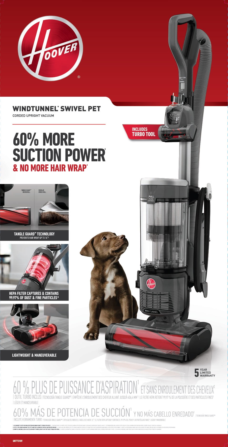 60% MORE SUCTION POWER*: Engineered to clean from hard floors to carpet with advanced suction power. * As compared to UH75110V using ASTM F558 measuring air watts through the nozzle NO MORE HAIR WRAP: Tangle Guardâ„¢ brush roll prevents hair wrap up to 16 inches**. **Per Hoover Hair Wrap Test FCTP-0300P. LIGHTWEIGHT & MANEUVERABLE: Easily clean all areas of your home with this portable and lightweight vacuum. MORE CLEANUP IN FEWER PASSES3: Clean more efficiently by picking up dirt and debris faster. 3 As compared to UH75100V using ASTM F2609-11 measuring surface litter pick-up ABOVE FLOOR CLEANING: Clean hard to reach areas easily with the built-in extension wand, and specialty tools for cleaning upholstery and stairs.