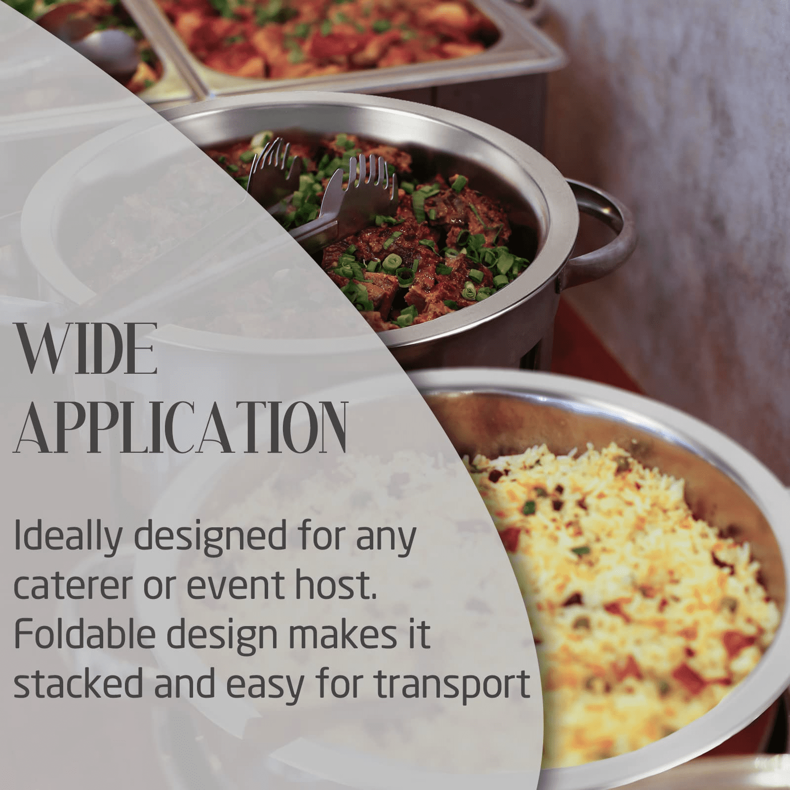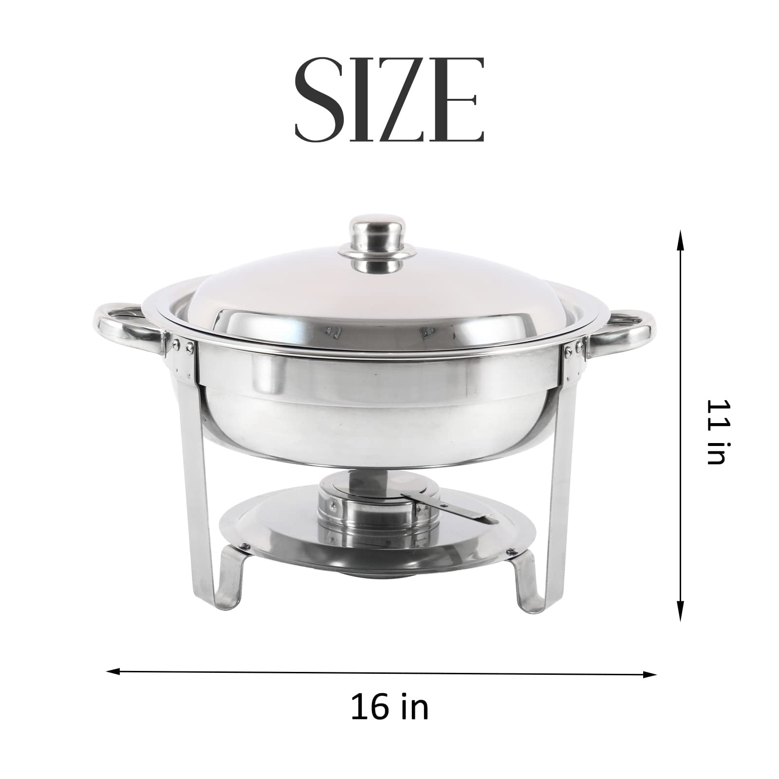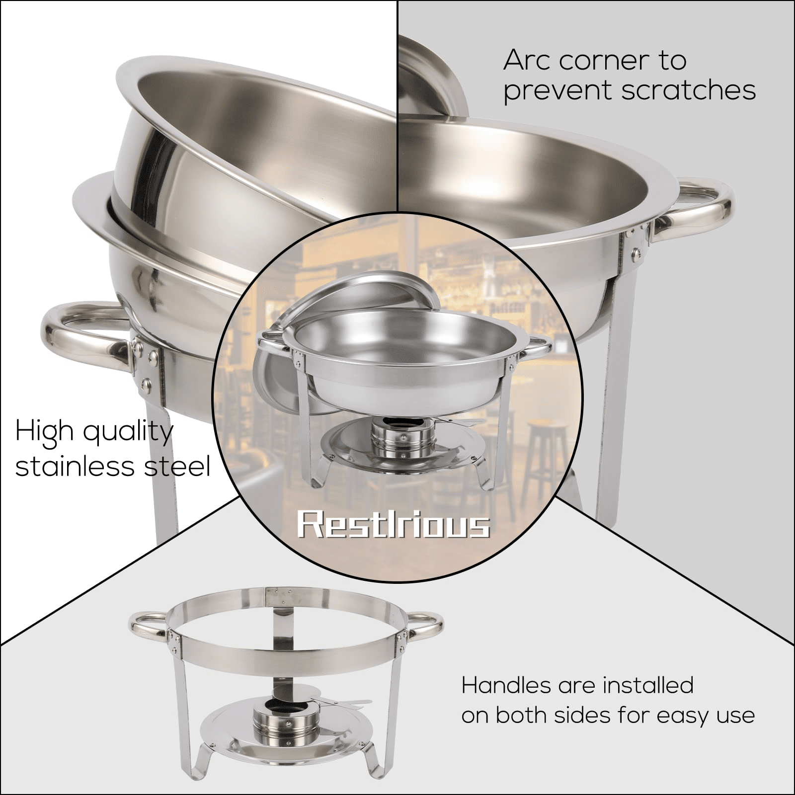 Good Helper for Catering – Made with high-quality thickened stainless steel, Restlrious chafing dishes maintain the food’s perfect serving temperature within hours. It can keep the food warm and refreshing, just like someone just turned the stove off. The large capacity of 4.8-quarts perfectly accommodates the food the guests need Glass Lid Design – Designed with clear-viewing glass lid, this round chafing dish is made easily for you to pay attention to the food inside while keeping warm. Besides, it’s convenient to clean every corner of both the inner and external part with a round design. Two handles on the sides help on moving the chafer easily Complete Chafer Set – This full-size buffet set includes everything you need to successfully cater a banquet. There are 2 packs in total which come in one order. Each pack includes 1 round water pan and 1 round food pan, 1 foldable frame, 1 lid, and 1 fuel holder. No sharp edges, rust-proof and corrosion-resistant Luster Your Banquets – Whether it is a hotel buffet or a family dinner, this chafer will make your guests full of praise. The bright polished mirror finish will sparkle and reflect the surrounding ambient lighting for an elegant visual effect. Widely used to buffets, hotel breakfast and brunch areas, wedding, parties, banquets and any events Even Heat Distribution – This durable chafing dish maintains foods at just the right temperature and can keep food hot or cold for hours. The height of the base frame is 7.5″and can be folded down to help you with easy storage and maintenance. Stackable pans are designed for easy transport and space-saving
