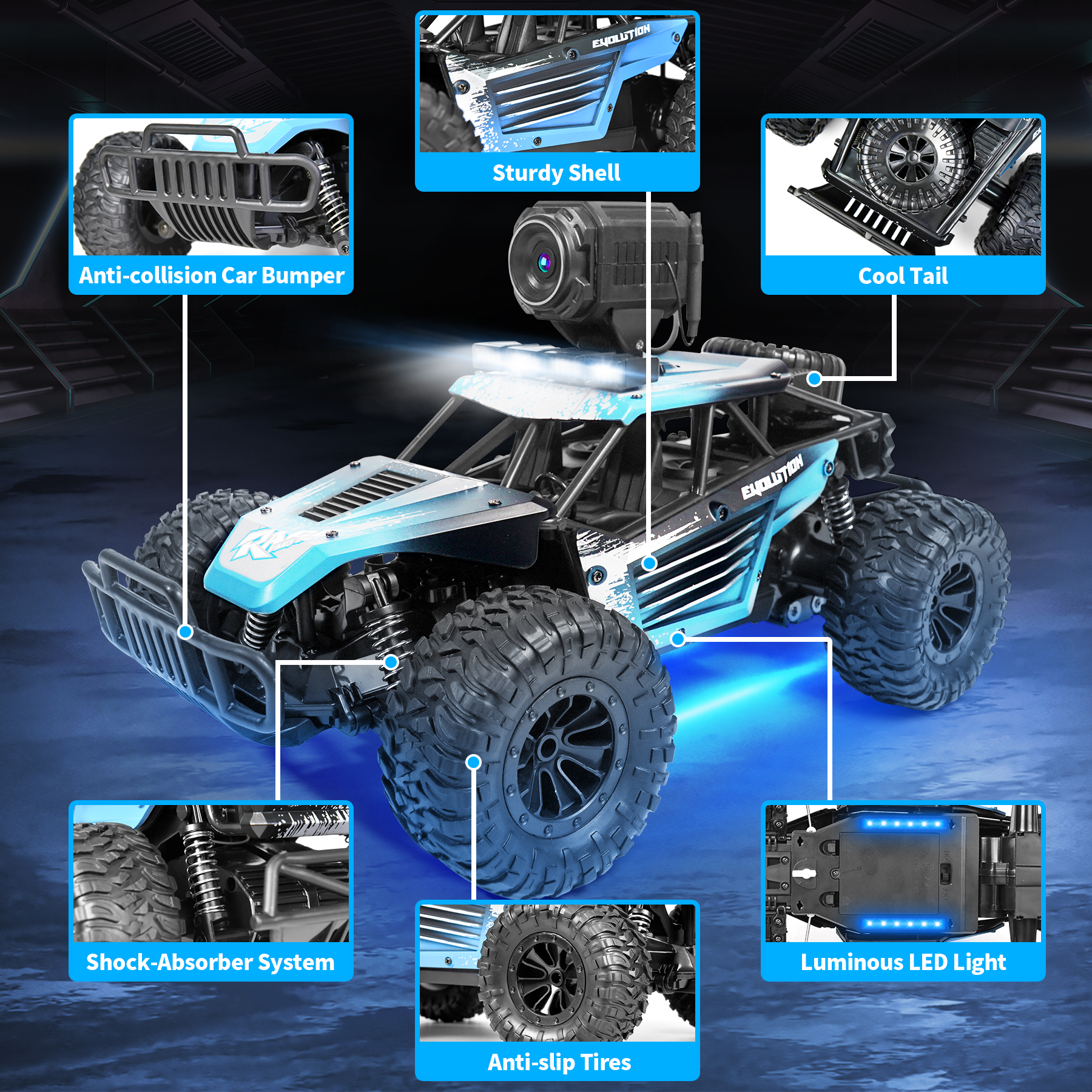【1080P HD & 45°Adjustable Camera】The remote control car is equipped with 1080P HD wifi camera and 263FT real-time transmission, all the time, you can view clear photos and videos from phone APP. And 45°adjustable angle bringing you a different visual experience. Enjoy the good times for you and your family, friends. 【Dual Remote Control Mode】This rc car supports mobile phone APP remote control, so you can drive this truck with two modes: 2.4Ghz radio remote control( radio control range up to 165ft) amd Mobile phone App driving, it allows you racing them with your friends at the same time.And 1:16 full scale makes it more real. 【2 Packs Batteries & 60 Mins Running】The RC Car is equipped with TWO 7.4V 1000mAh hard case rechargeable batteries!it will be more powerful ,safer and durable. uniquely designed & constructed for high performance RC Racing. Increase the runtime of your RC unit with a battery that will go the distance! Speed is up to 15-20 KM/H with the two powerful motors. Enjoy in the exciting racing driving! 【Strong Shock Absorbers & Superior Build Design】This RC car comes with four independent suspension springs, advanced anti-skid tires, shock absorbers and anti-collision beam, high speed throttle response ,sensitive steering , this can be very effective in preventing the car from crash resulting in unnecessary damage. 【Various Terrains High Performance Gift Car】】With 1:16 scale big size and it made of safety, non-toxic, anti- collision and anti-impact material.you can go various terrains like road, highway, shallow sand and mud. The truck can be played on at any occasion, such as party, travel etc. Easy to play and fun for indoor and outdoor. A great gift for all ages of children and adults.