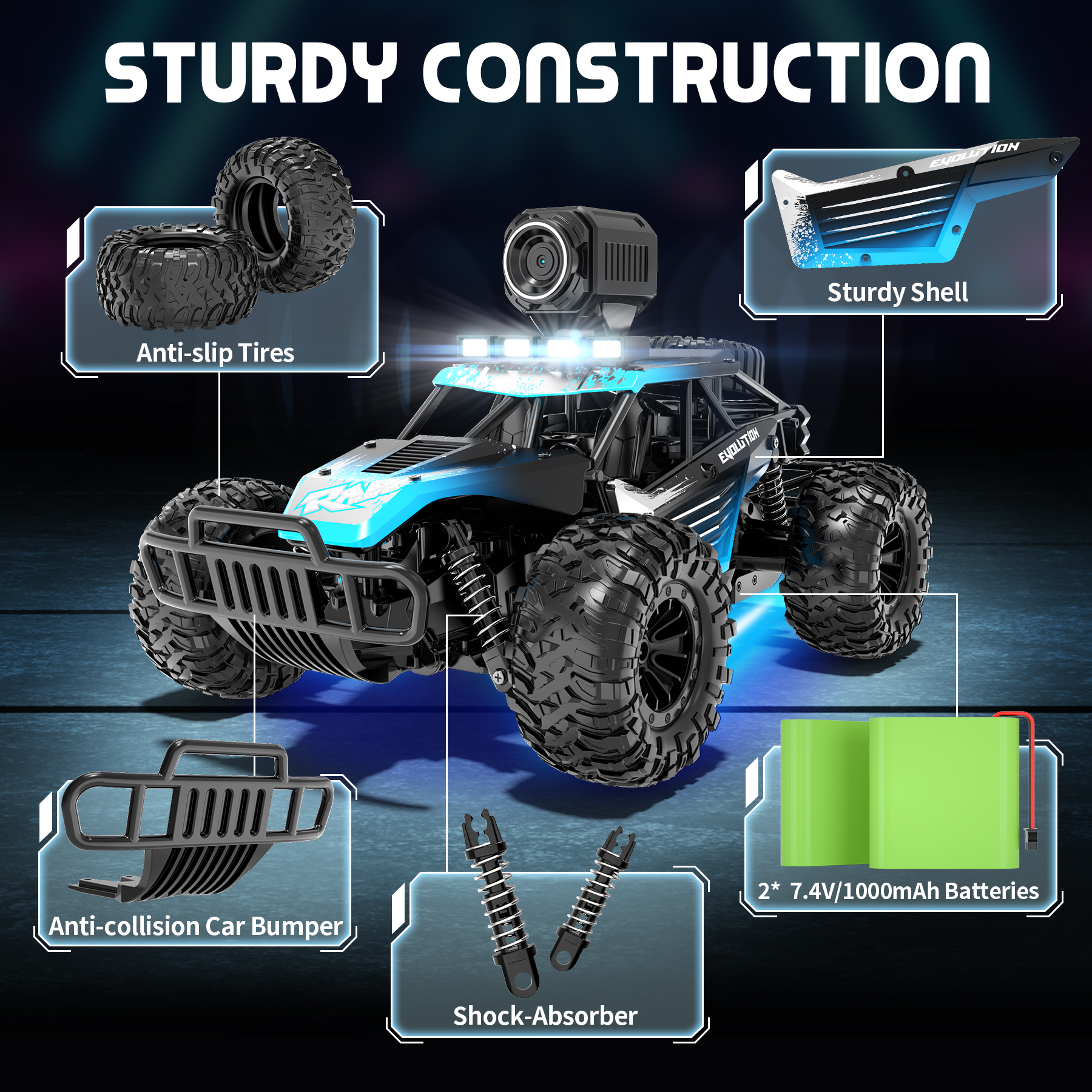 Hosim Radio Control Cars with Adjustable Camera, Blue, 3.12 lbs 1080P HD FPV Camera: Capture stunning photos and videos with the high-definition camera, providing a clear view through the phone app Dual Remote Control Model: Operate the car using either a 2.4GHz radio remote control (with a range of up to 165ft) or a mobile phone app for versatile driving options PVC Rubber Wheels: Designed for excellent off-road performance, these wheels are soft, elastic, shockproof, and antiskid 4 PCS Independent Suspension Spring: Features an anti-shock function that protects the body and internal electronic components from damage Two 7.4V 1000mAh Rechargeable Batteries: Enjoy up to 60 minutes of runtime with powerful, safe, and durable batteries designed for high-performance racing Strong Shock Absorbers & Superior Build Design: Equipped with advanced anti-skid tires, shock absorbers, and an anti-collision beam for enhanced durability and performance