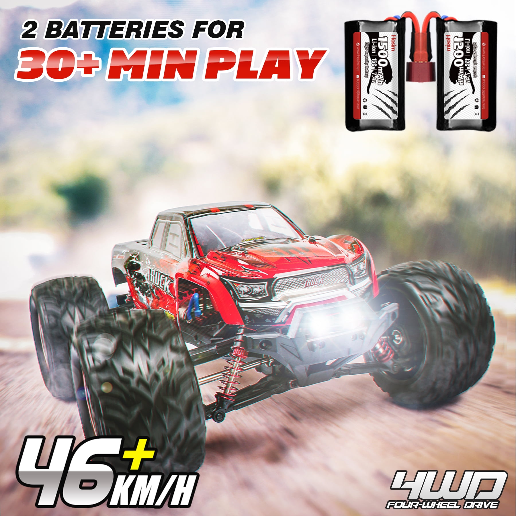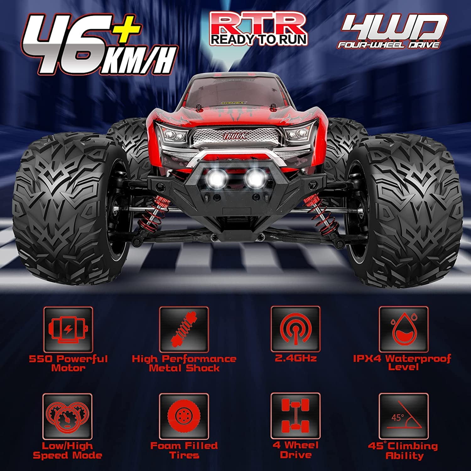 【2 Packs 1500mAH Batteries & Double Battery Connector 】— The Radio Control Cars equipped with 2 packs batteries and a special double battery connector, The 7.4V Rechargeable Battery Pack features a high capacity rating of 1500mAh. Increase the runtime of your RC unit with a battery that will go the distance!the rc car for boys and adults will run for up to 30 minutes at a time! 【Hobby Grade 550 Powerful Motor】— Built-in a type of 550 Brushed motor which can perform 16000 revs per minute ,It reaches speeds of up to 30 mph (46+ kmh), 1:12 Scale big size rc cars for boys and adults,the four wheels of full proportional super-fast rc monster truck consist of bouncing spring materials which give support to unexpected dropping and the unstable surface of the ground,the rc monster trucks make you enjoy the toy rc eletric car for a longer period of time; 【2.4Ghz Accurate System & 2 Different Speed Mode】—The radio control cars come with a range of up to 80m/262 ft and 2.4Ghz highly responsive steering and throttle, you can racer with your friends or kids at the same time.furthermore, the rc car has full speed (46+ kmh)and half speed mode(23 kmh), perfect for children of different ages; 【IPX4 Waterproof & Perfect Gift Choice】The electronic speed controllers (ESC) / Receiver of this hobby grade RC truck has several protective functions such as Splash-proof. And the rc offroad cars can go both off-road and on-road environments with premium anti-skid heavy duty wheels. all metal sealed ball Bearings are special designed for tough environments and any rugged roads.