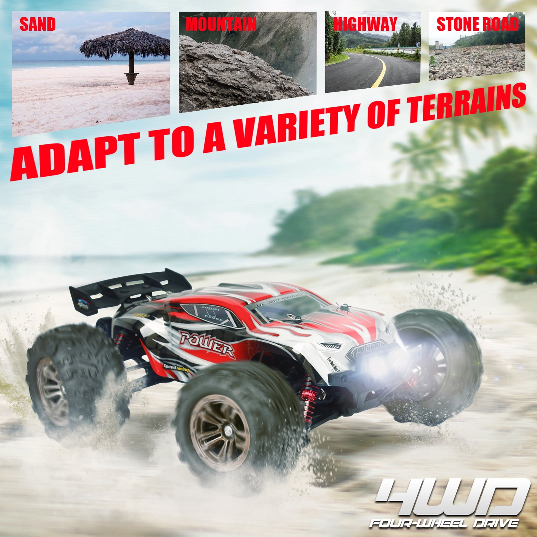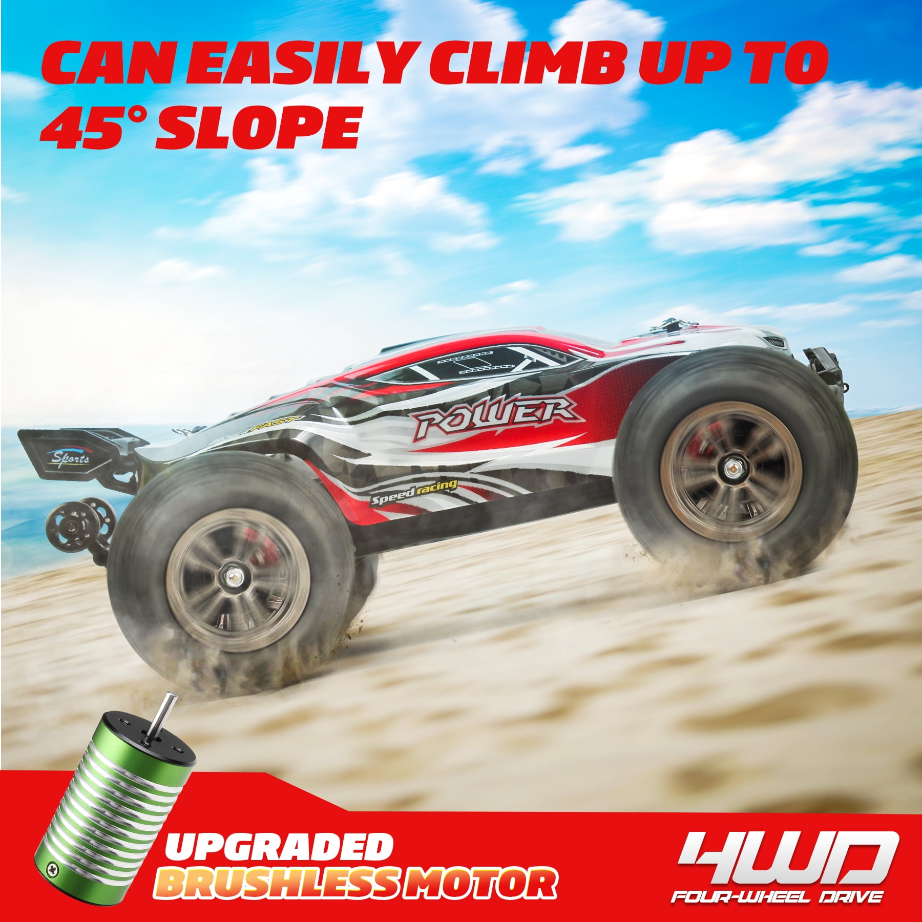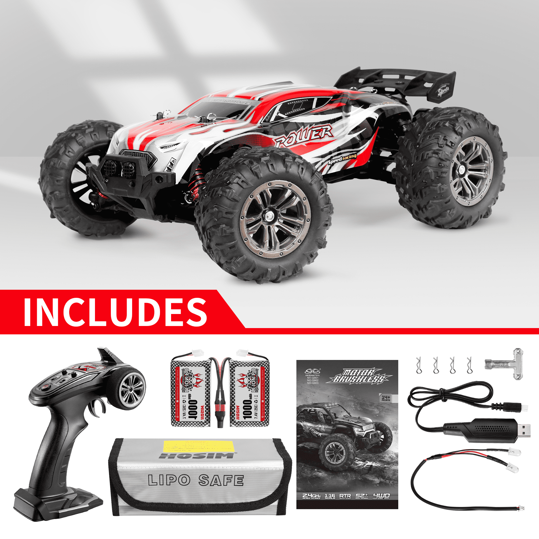 52KM/H Amazingly Fast with 4 Wheels Drive Remote Control Car 2845 Brushless Motor,xtreme Brushless RC power, designed stiff and fast The RC Car is equipped with two Li-Po 7.4V 1000mAh rechargeable batteries and a special double battery connector.Uniquely designed & constructed for high RC Racing performance. IPX4 Waterproof and 1/16 Realistic Scale with Auxiliary Wheel 2.4Ghz Accurate System & 2 Different Speed Mode