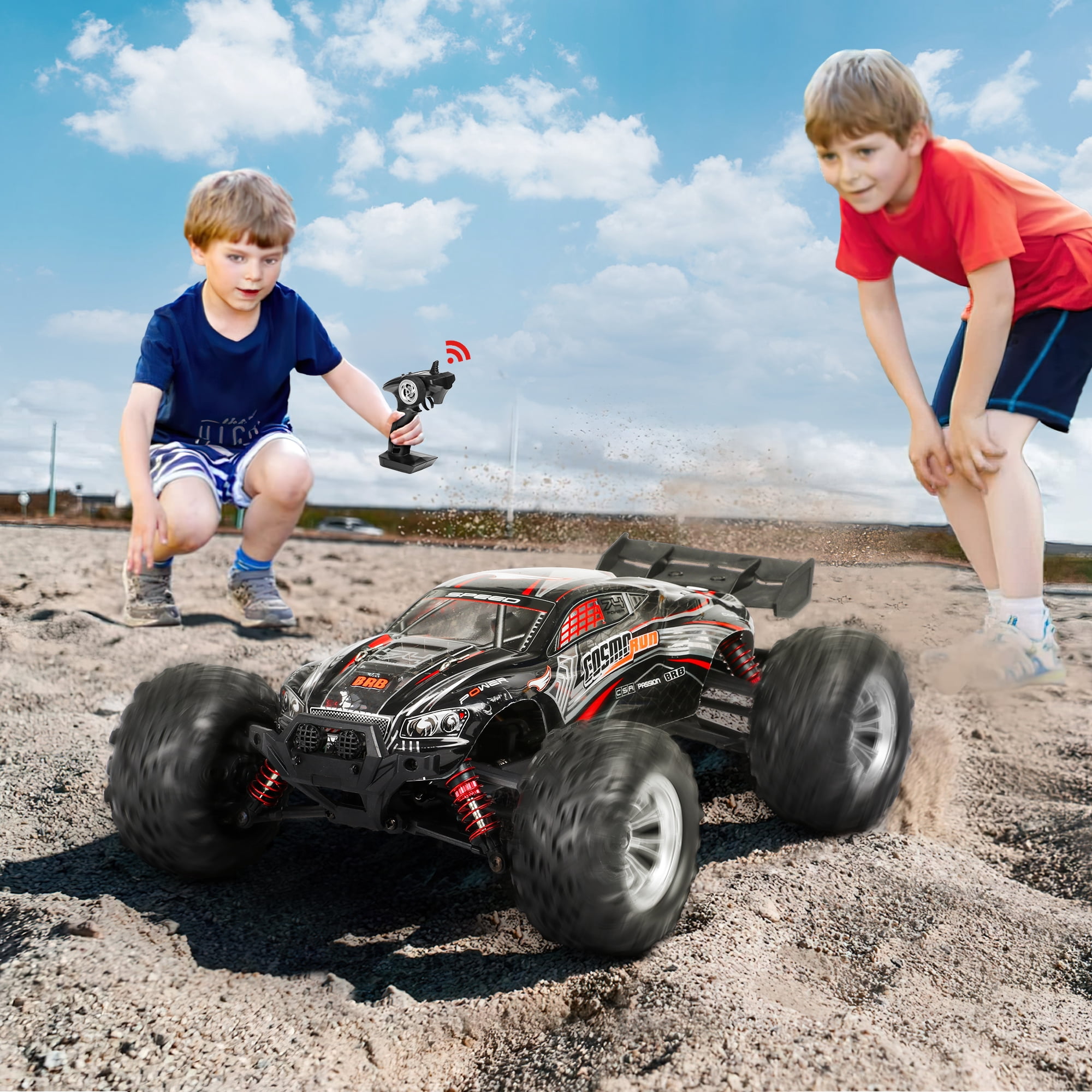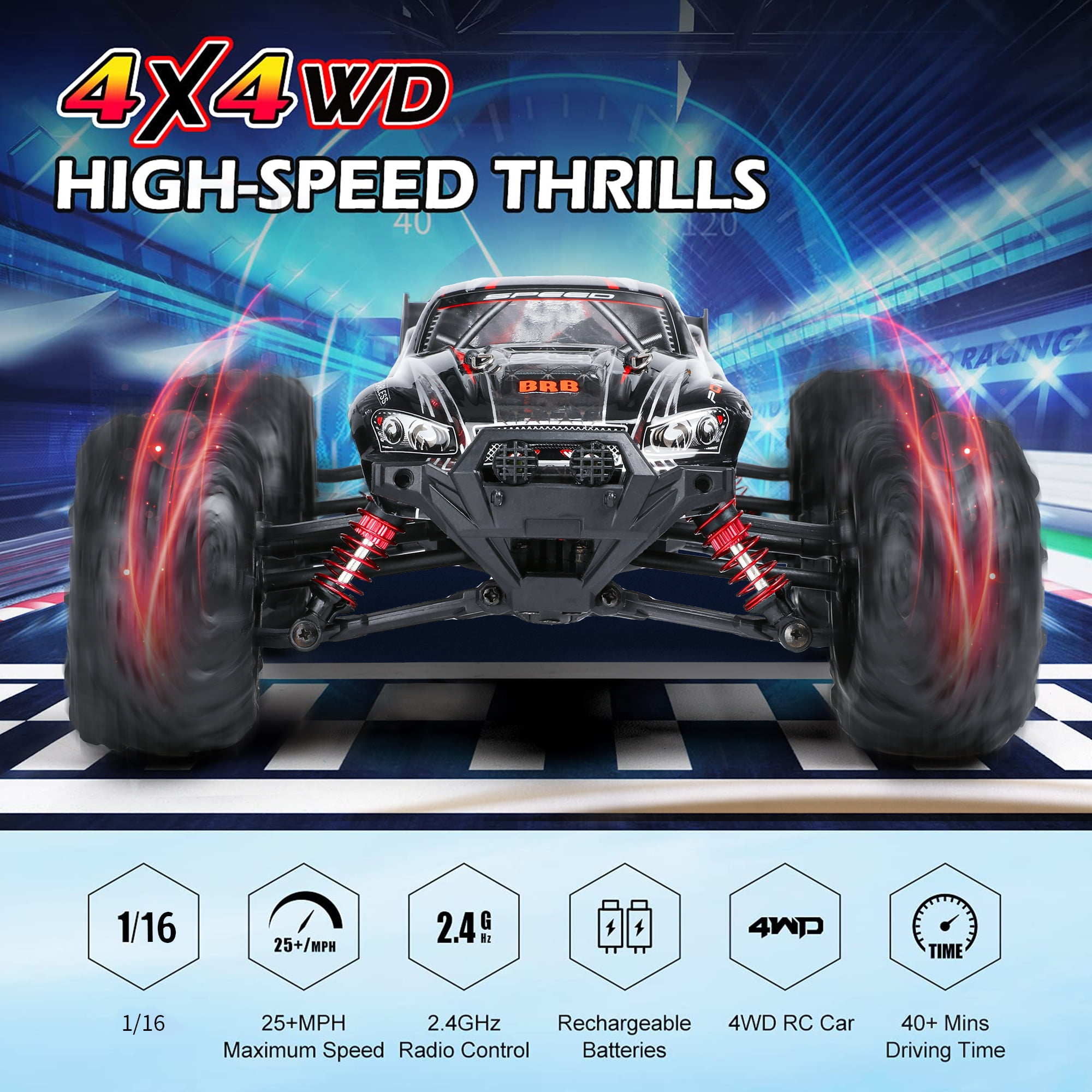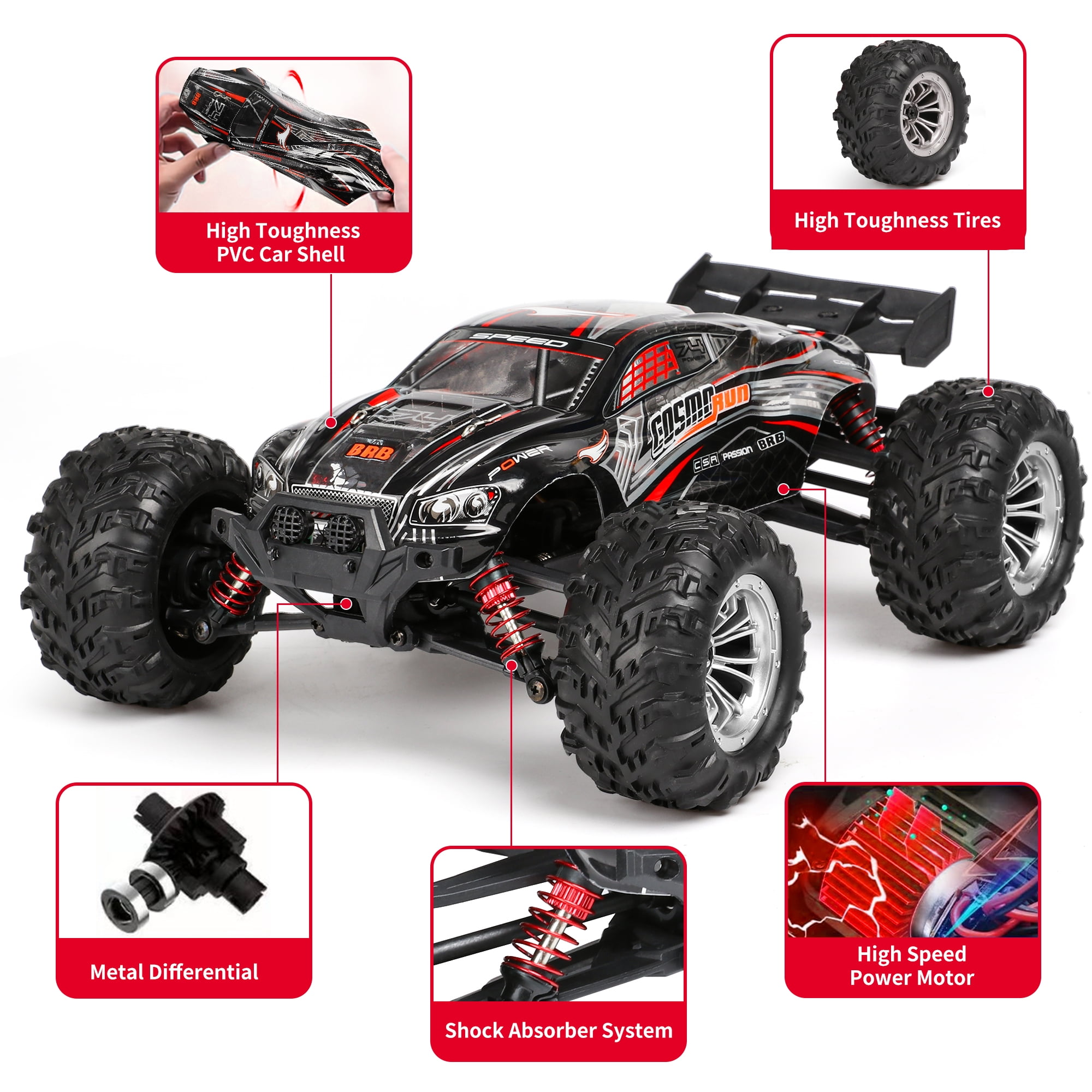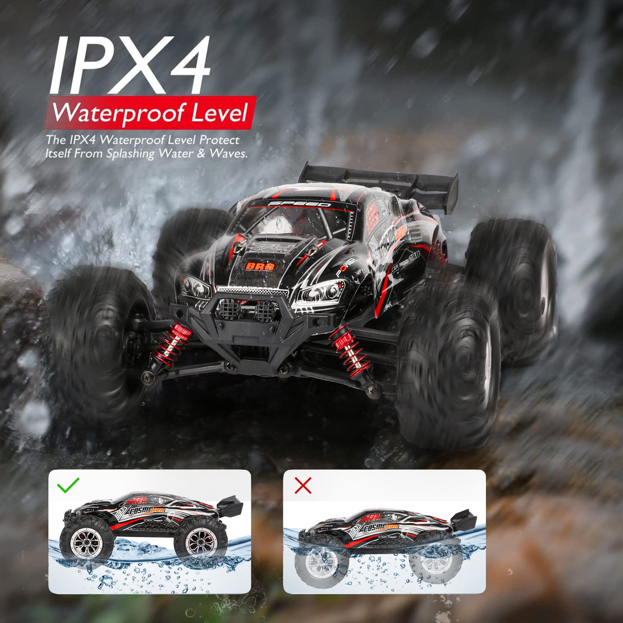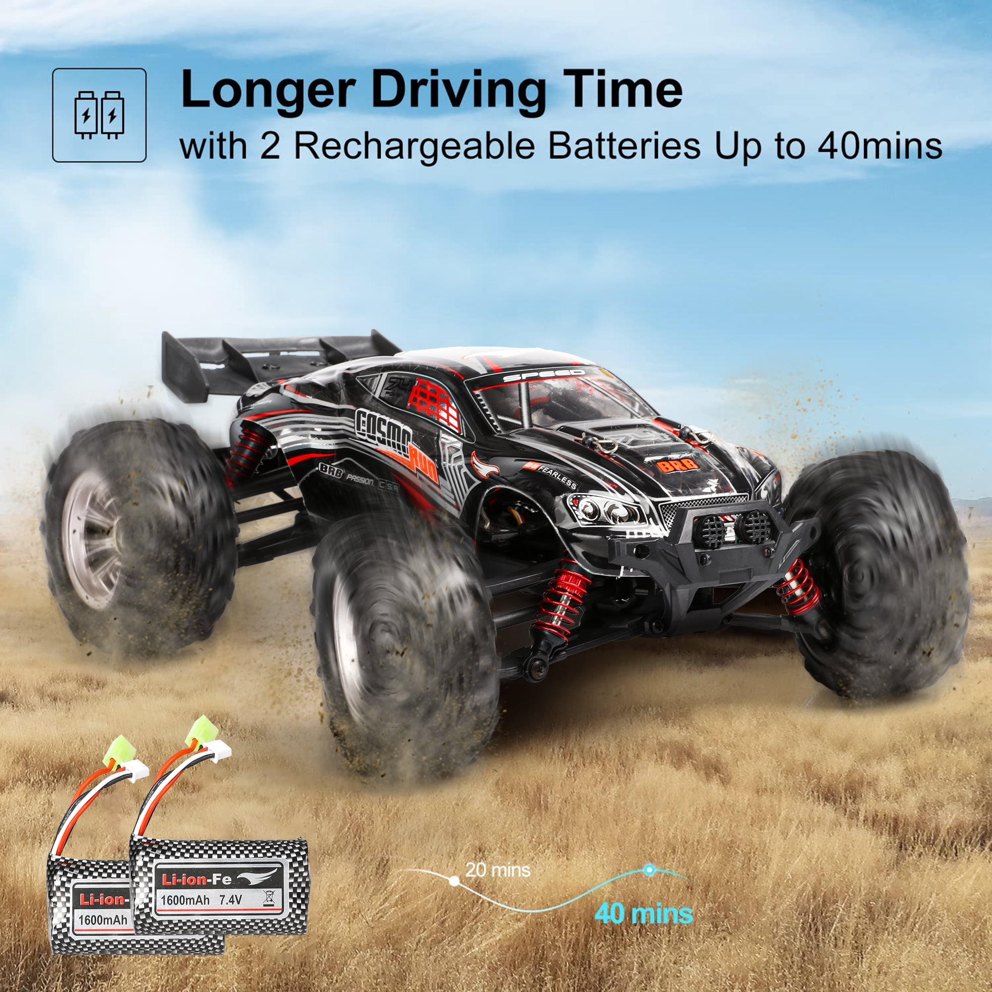 【1:16 Fast RC Truck】The rc cars for adults with a powerful motor, the rc trucks can reach a faster speed.The motor lasts 2-3 times longer and consumes only 1/3 of the power of a brushed motor. 【4X4 & 36+KM/H Super Fast】:The fast rc car can reach 36+km/h,which makes the car race faster than others.The remote control truck adopts 4-wheel drive and 4 independent suspension spring shock absorbers and an alloy drive shaft. 【Badass Reinforced PVC Car Shell】: Other than guarantee the outstanding function of this off-road vehicle, we went great length to deliver you cool visual experience with the whole custom-design graffiti including the skeleton at the top of car shell. 【IPX4 Waterproof & 2.4GHz Non-Jamming】The 2.4GHz remote controller has a fast response time and no delay. Whether indoors or outdoors, it can control the remote control monster truck sensitively and has an anti-interference function. And the rc trucks for adults also have IPX4 waterproof performance. 【Ideal Gifts Toys for Adults & Kids】:This remote control car for adults has two headlights and four high tenacity tires. And the fast remote control cars will add a lot of fun for you and your family. It is the great birthday and Christmas gifts for boy & kids over 8-12 years old, adults and off-road enthusiasts.