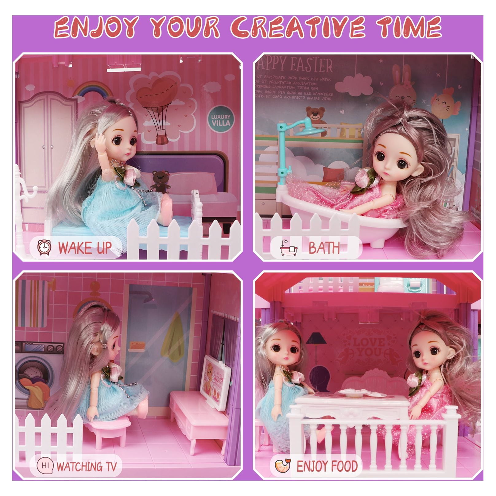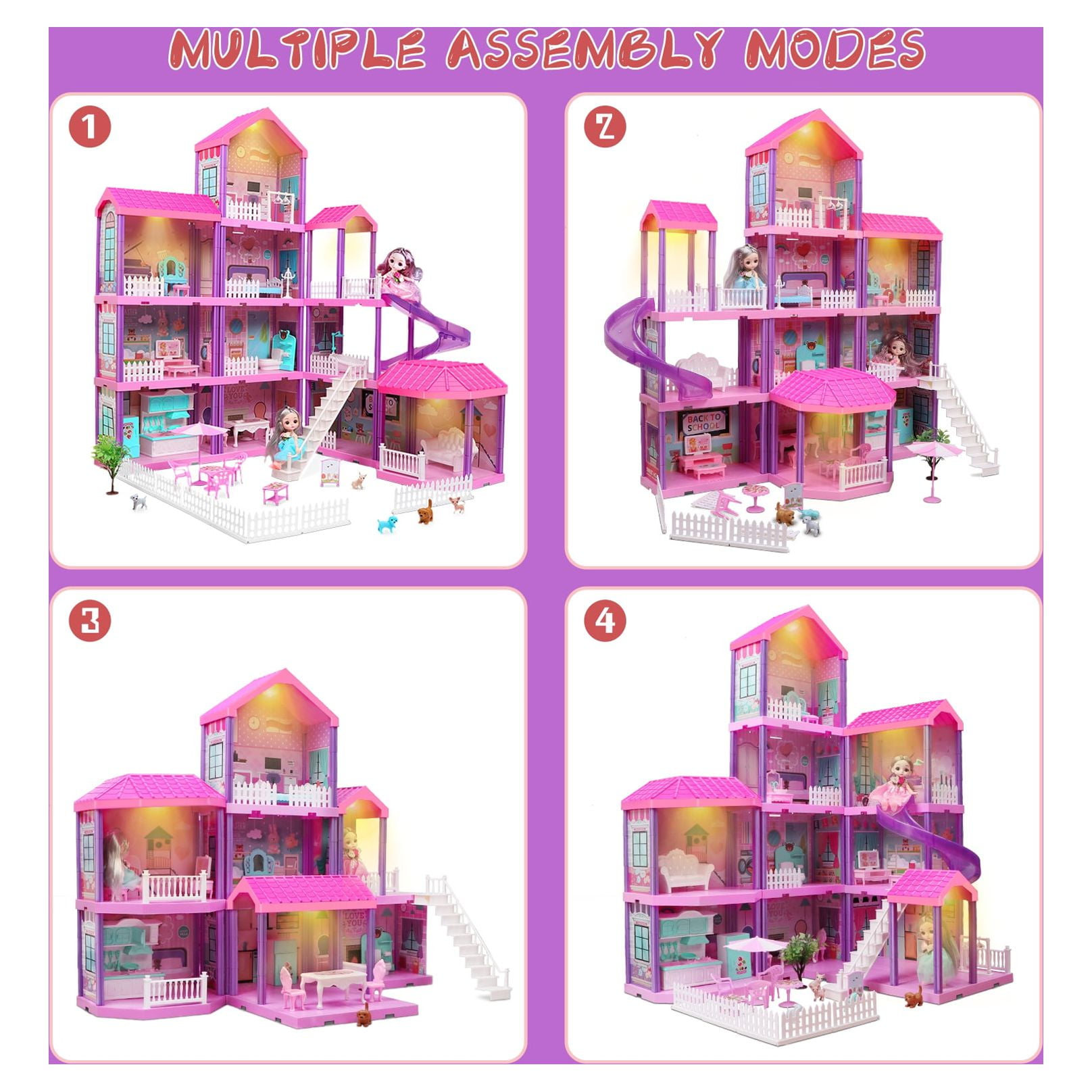 Huge 3 feet dollhouse for girls has 4 stories and 11 room, doll house playset size: 28*27*36In. Many exquisite dollhouse furniture, giving kids more creative possibilities. Upgraded dolls figures, with multi-angle twisting and bending joints, which can complete a variety of human movements. Equipped with 4 warm lights (including batteries) make the doll houses for girls warmer and more comfortable at night. The princess dollhouse kits are made of non-toxic and durable ABS material,which is environmentally friendly, durable, moisture, and does not fade. Smooth seams with no sharp or rough edges.
