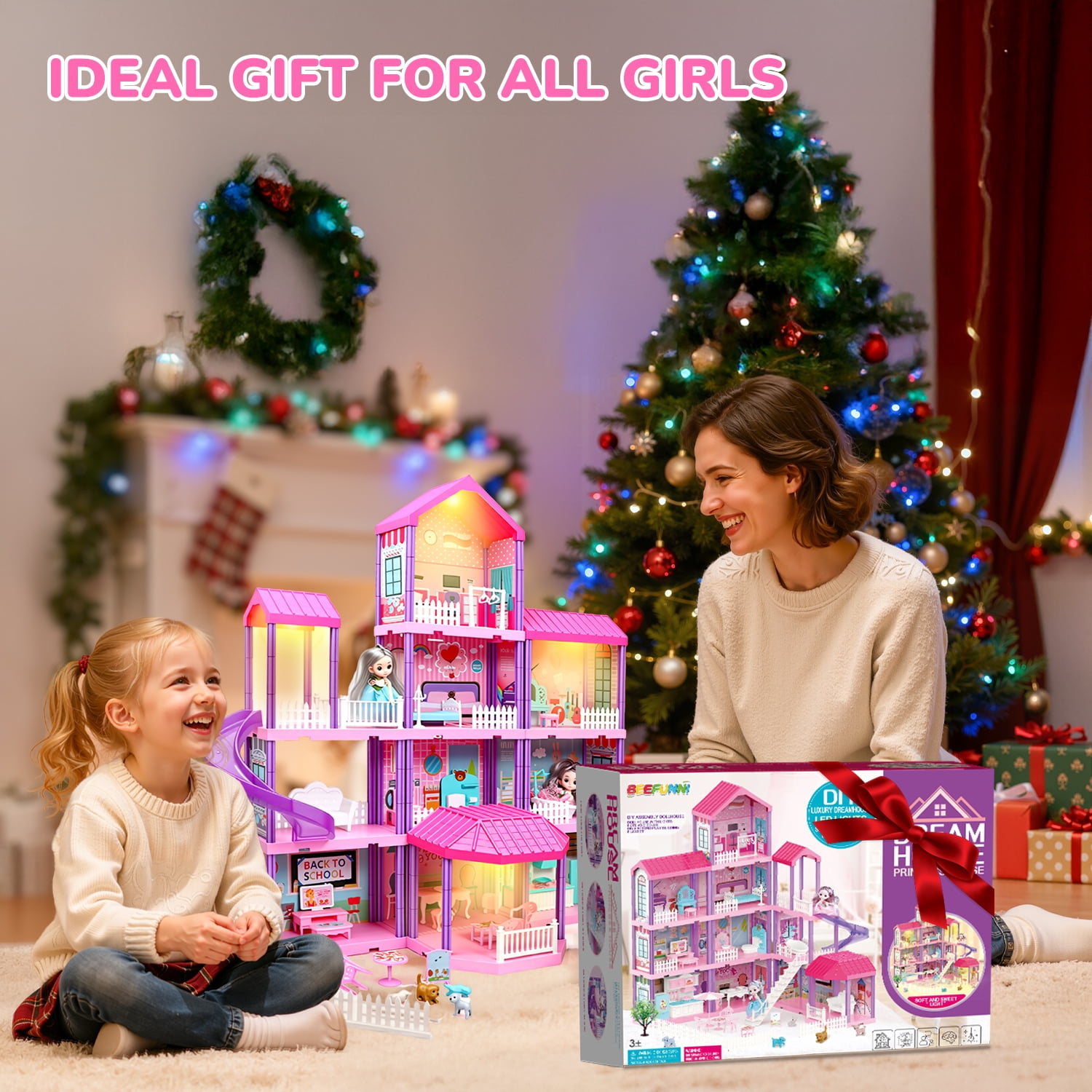 Hot Bee GORGEOUS DOLLHOUSE – GREAT GIFT FOR LITTLE GIRLS ! Description Perfect Christmas or birthday gift for girls kids/toddlers age 3,4,5,6,7,8. At Christmas, you can also put the dollhouse as Christmas decorations and your Christmas village together to become the perfect decoration under the Christmas tree. 11 ROOMS OPEN DESIGN DOLLHOUSE Full-featured dollhouse for girls, including living room, bathroom, dining room, bedroom, kitchen and other rooms, with fully furnished. The miniature house kit equips many exquisite dollhouse furniture, giving kids more creative possibilities. Children can move and arrange freely according to their preferences. Have an outdoor activity area and a slide, allowing the dolls to enjoy the leisure courtyard time. Children can invite friends to role-play together. They will be immersed in this dream journey. WHAT CAN YOU GET? Specifications: Room: 11 Warm Lights: 4 Pack(including batteries) Material: Premium ABS+Plastic Recommended Age: 3+ TIP: All furniture and accessories are shown in the pictures Doll Size: 5.9 inches Key Feature