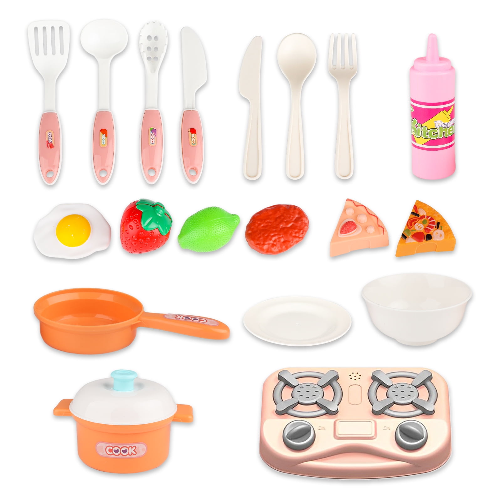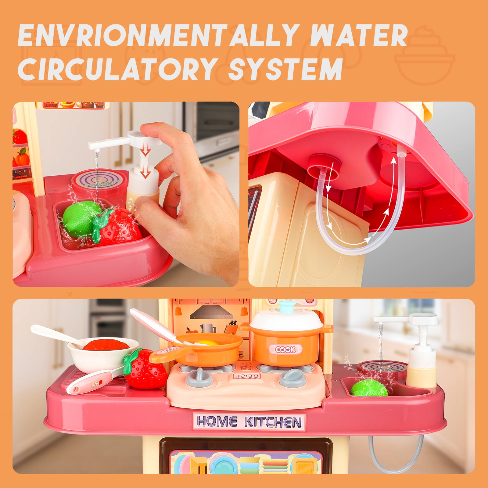 ????All-in-one Mini Kitchen Set for Children: This charming mini kitchen playset boasts an interactive electronic play stove, a real water flowing play sink, a variety of pretend play food and utensils, along with multiple other kitchen accessories. Also features diverse storage spaces to keep kitchen items neatly organized, such as oven, cupboard and shelves. ????Interactive Stovetop with Lights and Sounds: The interactive stovetop brings your cooking to life with realistic lights and sounds. Just place a pot or pan on the stove, and it activates glowing lights and makes authentic stove sound effects. Enjoy a more engaging cooking experience with this fun addition to your kitchen. ????Sink with Water Circulation System: The integrated play sink enables children to wash their pretend play foods and dishes. Simply push the button behind the faucet and out flows the water, fostering environmental consciousness from an early age with the water recycling feature. ????Encourages Imaginative Play: With this comprehensive kitchen playset, kids can role-play as master chefs. Parents can also join the fun by playing along as their eager guests, boosting children’s creativity and hands-on skills during these delightful play sessions. ????High-Quality and Kid-Safe: This interactive kitchen playset is crafted from child-friendly materials that are both durable and safe. Perfect for birthday gifts, Christmas or other holiday gifts