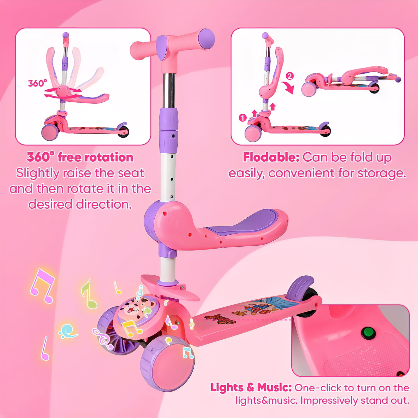 Hot Bee Pink Kids Scooter with Adjustable Seat, Foldable Design, Music and Lights, LED Wheels, Outdoor Activities Toy for Girls/Boys Aged 2 3 4 5 6+, Birthday Gift for Girls 3+