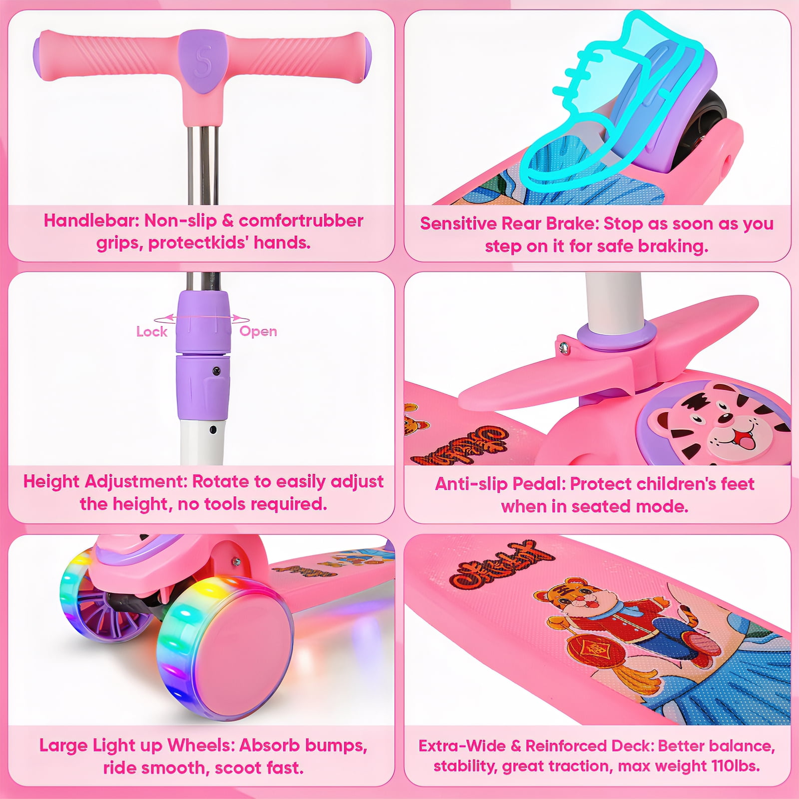 Hot Bee Pink Sit-and-Scoot Scooter, the perfect outdoor toy choice for your little ones aged 2-8! This upgraded kids scooter offers a unique combination of sitting and standing, providing endless fun and excitement. With its adjustable handlebar and wide anti-slip deck, this scooter ensures a comfortable and secure riding experience. Thanks to its foldable design, this scooter can be easily transported and stored, making it perfect for trips to the park or family vacations. Our scooter is not just a fun toy; it’s also a valuable tool to enhance your child’s coordination, balance skills, and overall physical development. Get your little one moving and having fun while boosting their coordination and balance skills with Hot Bee Pink Sit-and-Scoot Scooter! Full of Fantastically Fun and Super Safe Features!