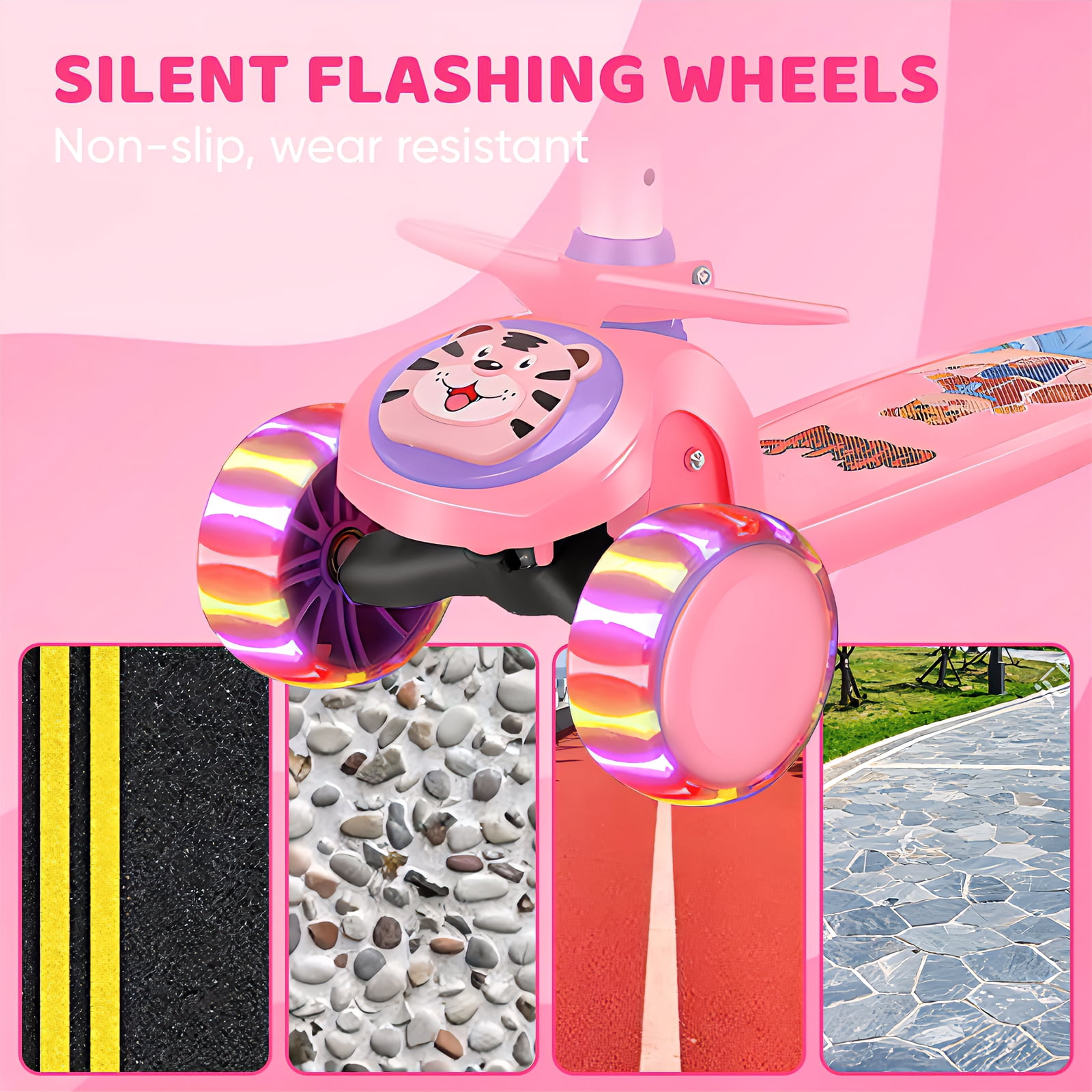 The scooter is designed with an adjustable seat and handlebar, allowing for easy customization to suit your child’s growing height. This ensures a perfect fit as your child gets taller and provides optimal comfort for a smooth and enjoyable riding experience. Constructed with high carbon steel and PP material, this scooter is incredibly durable, built to withstand the test of time. Its reinforced frame and stable design have been rigorously tested to safely support weights of up to 110lb, providing parents with peace of mind and ensuring long-lasting performance. The scooter outdoor toy features a rotatable and foldable saddle, offering your child the option to sit or stand while gliding around. This innovative feature adds a delightful element of fun, allowing for a dynamic and versatile riding experience that can be customized to your child’s preferences. Immerse your child in an exhilarating adventure with the scooter’s vibrant lights and cheerful music. The captivating and colorful lights enhance the excitement, particularly during nighttime rides. The joyful tunes further amplify the overall enjoyment, making the riding experience truly unforgettable for your child. Prioritizing safety and comfort, the scooter offers a sensitive rear foot brake that enables your child to swiftly stop the scooter whenever necessary. Its wide and anti-slip deck ensures stability and confidence, significantly reducing the risk of accidental slips or falls. The slip-resistant handlebar grip guarantees a comfortable and secure hold, empowering your child to ride with ease.