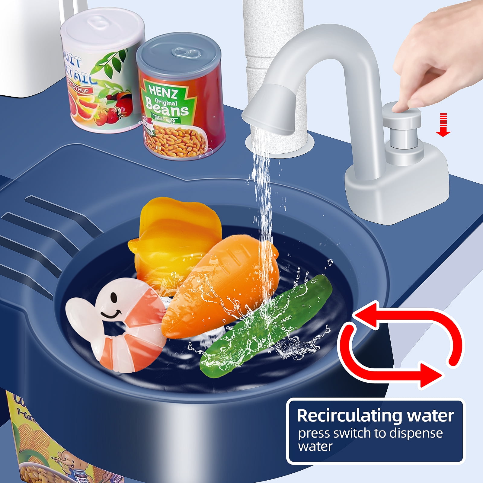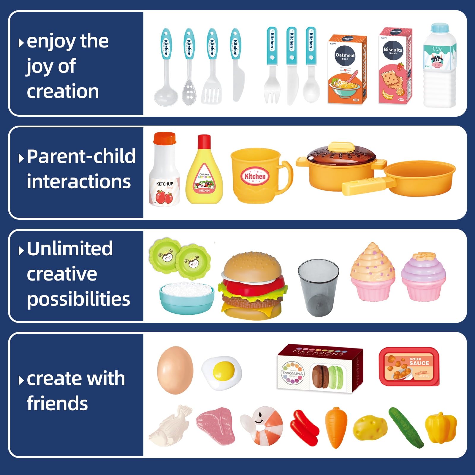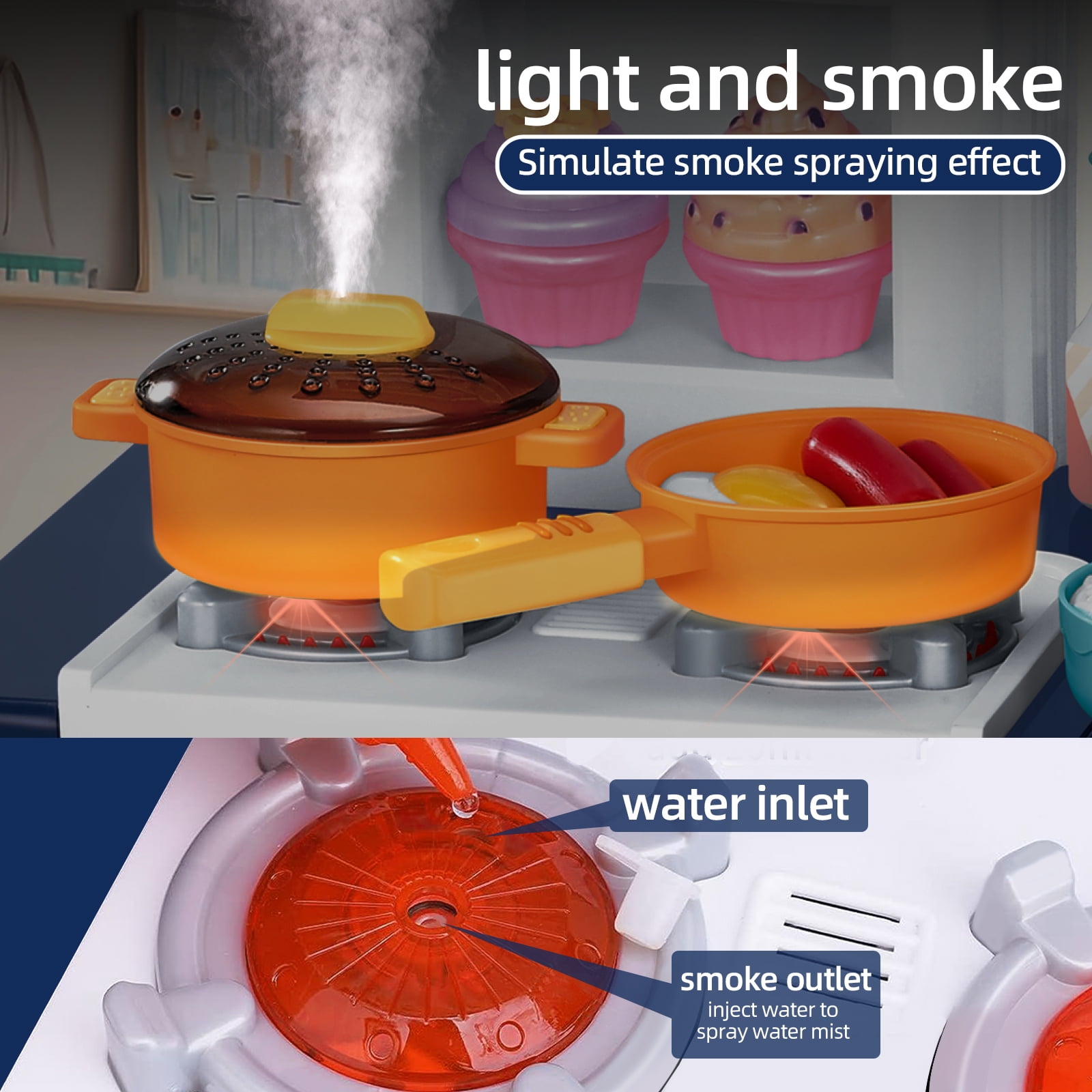 【Touch Panel Music】:Let your child explore different music modes with the touch-sensitive panel, enhancing their sensory experience and making cooking time even more enjoyable. 【Simulation Gas Stove】:Activate the gas cooker to witness a stunning red light and authentic stir-frying sounds, creating an immersive cooking atmosphere. Add a mere 10ml of water through the injection hole to enjoy a lifelike spray effect that emulates the joy of cooking (Please note: Batteries are not included). 【Water Circulation Design】:Fill the sink once, and watch as your child can easily dispense water using the faucet button – no more interruptions for refills. This feature is perfect for imaginative dishwashing and culinary adventures. 【Color-Changing Food】:Introduce your child to the enchantment of color-changing food items (fish, meat, shrimp). Simply place them in ice-cold water below 22°C, and witness the magical transformation. This captivating experience stimulates curiosity and adds an extra layer of fun to their culinary creations. 【Perfect Gift】:Our play kitchen set comes elegantly packaged, making it an ideal gift for birthdays, Christmas, Halloween, and Easter. With straightforward assembly, parents can join in the playtime action, strengthening the bond between parents and children.