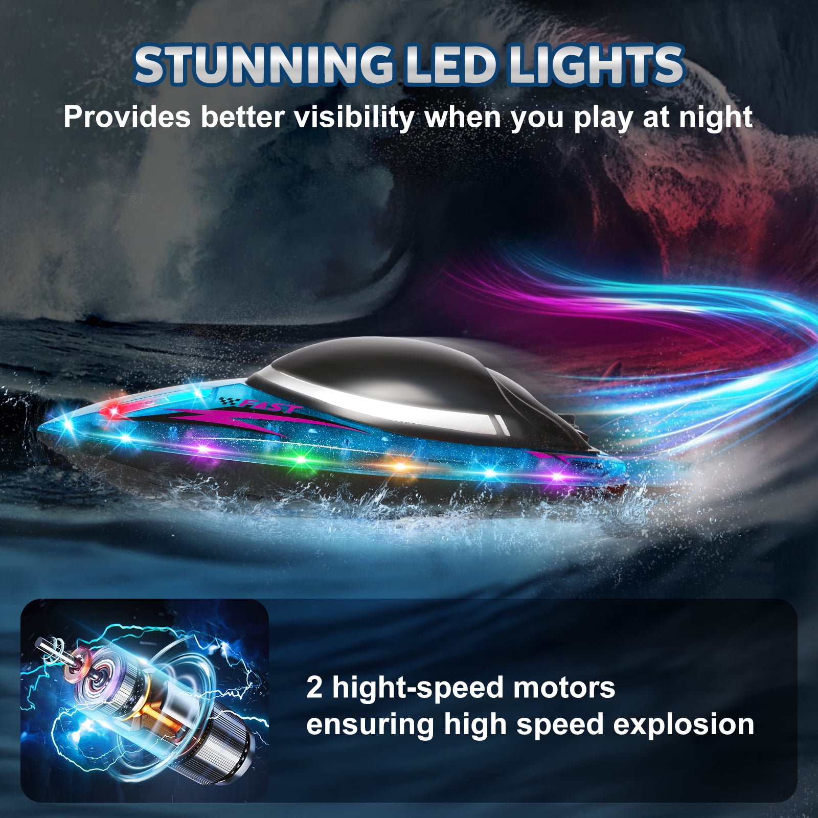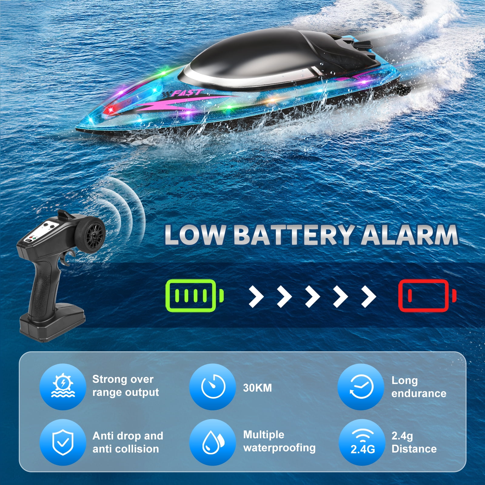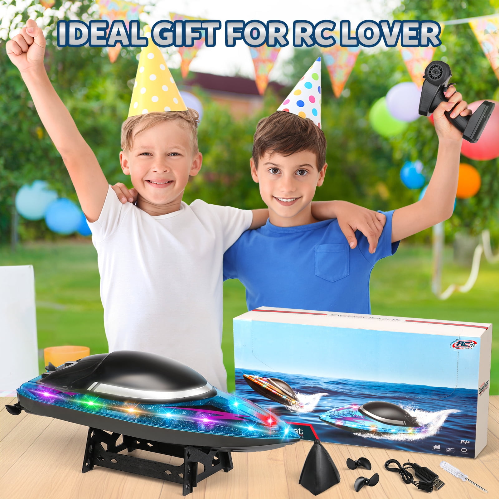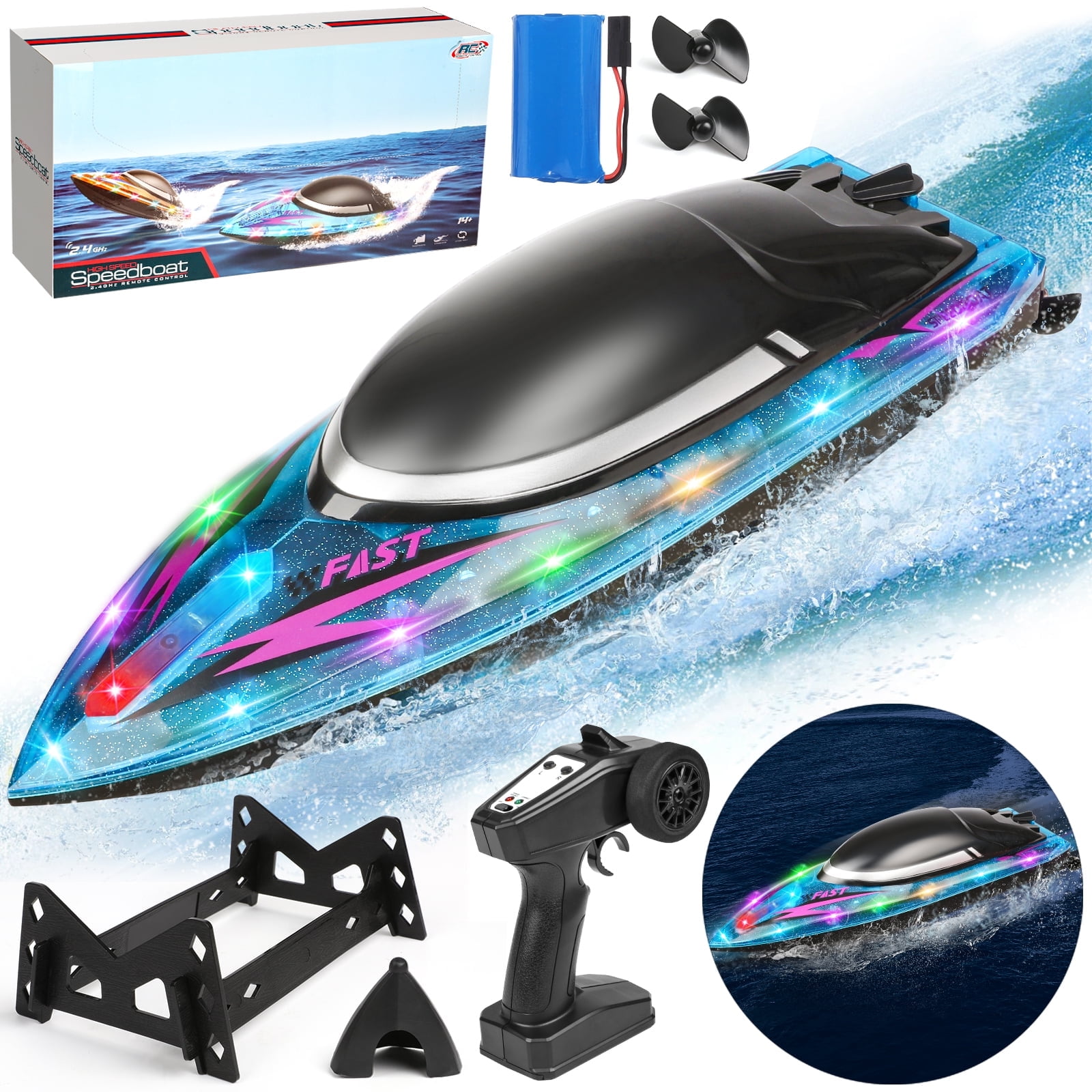 ????2.4 GHz High-Speed Racing: The 2.4 GHz frequency controller lets you race multiple boats at once, with a maximum speed of 18 MPH (30 km/h). Whether in the pool or on the lake, this boat delivers fast, thrilling races that leave other boats in the dust. ????Colorful LED Lights: Sparkling LED lights illuminate the boat, making it perfect for nighttime racing and adding an extra touch of excitement. The lights also indicate different boat functions, adding a fun visual effect while you race. ????Self-Righting Hull Design: No need to worry about capsizing! The self-righting feature ensures that the boat quickly flips back over, so you can keep racing without interruption. Responsive steering and full throttle control provide a smooth driving experience. ????Low Battery Power Alarm: The controller will alert you when the boat is low on power, giving you plenty of time to return to shore. Enjoy long-lasting playtime without the stress of running out of power unexpectedly. ????Built to Last: Constructed with high-quality, durable materials, this waterproof racing boat can withstand the rough conditions of high-speed water races. It’s built to last and deliver endless fun! ????Perfect Gift for Kids & Adults: Looking for a perfect gift for the RC enthusiast in your life? Whether it’s a birthday, Christmas, or a special occasion, this high-speed racing RC boat makes an ideal gift for both boys and girls, and adults alike! Product Specifications: -Max Speed: 18 MPH (30 km/h) -Control Range: 330 feet (100 meters) -Battery: Large module rechargeable battery -Functions: Forward, backward, left turn, right turn -Dimensions: 14.5 x 5.9 x 4.7 inches