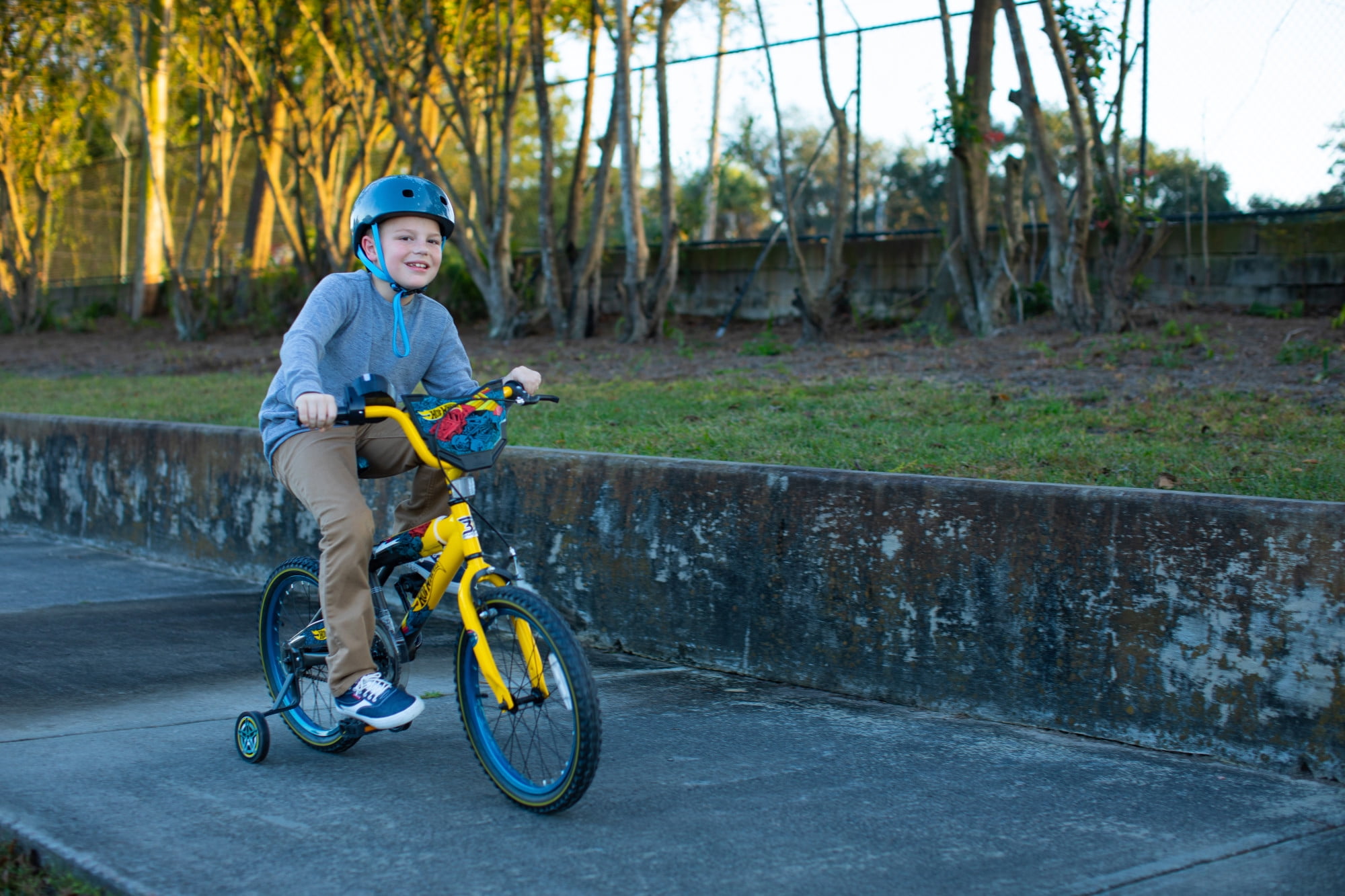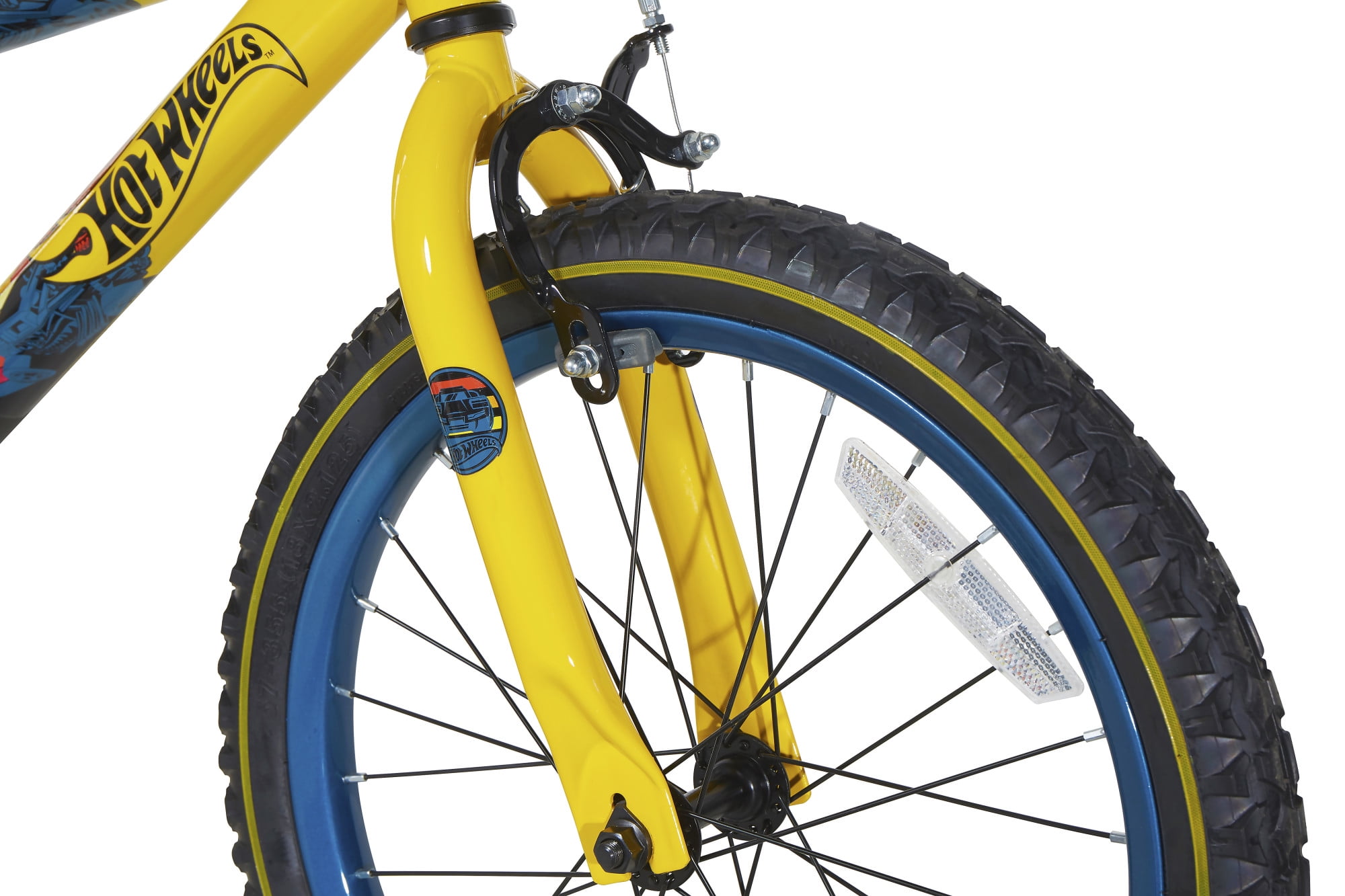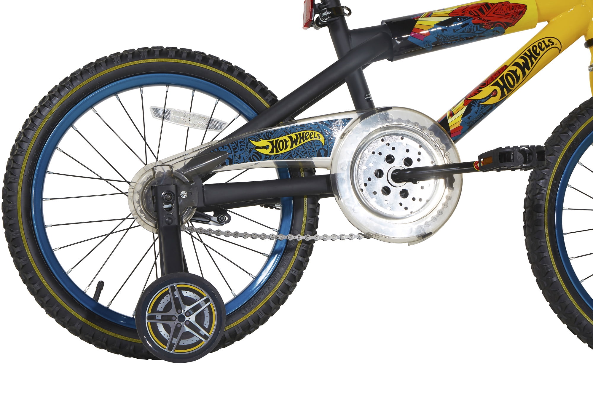 It’s time to leave the track behind and take off on your Hot Wheels 18-inch bike by Dynacraft! These wheels will catch the eye with our deluxe paint finish and custom Hot Wheels graphics throughout, including our super rad, super bold, Hot Wheels graphic handlebar shield. Your little racer will love revving up the volume with the Hot Wheels super realistic Rev Grip Noisemaker. Safety and control can be maintained with our front caliper brake, rear coaster brake, and full cover chain guard. And their ride can be easily adjusted with our removable, adjustable training wheels and quick- adjust seat post. This Hot Wheels 18-inch bike by Dynacraft will put your kid firmly on the front of the starting grid for their next adventure.