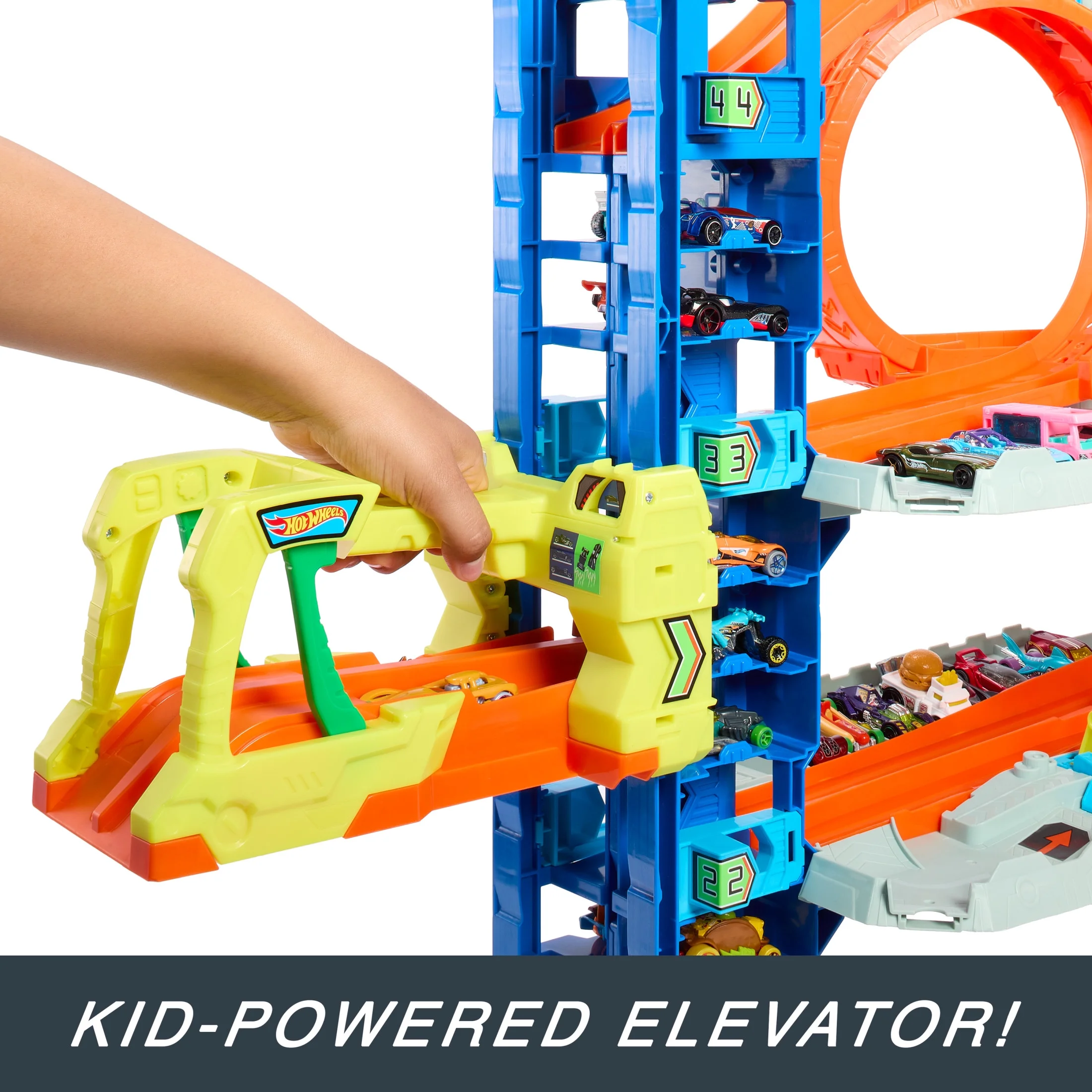 With the multi-level Hot Wheels City Ultimate Garage, kids can race, stunt and battle a dragon just like in the Netflix series ‘Let’s Race’ The first floor features cool track-play details like moveable hoses, a car wash with a foam roller, diverters and connectors to connect to other sets as part of a larger Hot Wheels City. (Additional sets sold separately.) Take the two-car elevator to the next level where kids can launch the 2 included Hot Wheels cars straight from the elevator into a side-by-side race On the third level, launch into a side-by-side loop stunt, adjusting the diverters to change the cars’ final destinations A car-hungry dragon awaits on the 4th level, and kids launch their Hot Wheels to defeat it or else get eaten. Eaten cars get ‘pooped’ out, while the defeated dragon plummets to the bottom of the garage Take advantage of the more than 50 parking spots for easy and convenient Hot Wheels storage The Hot Wheels City Ultimate Garage includes 2 Hot Wheels vehicles, making this a great gift for kids 5 years old and up