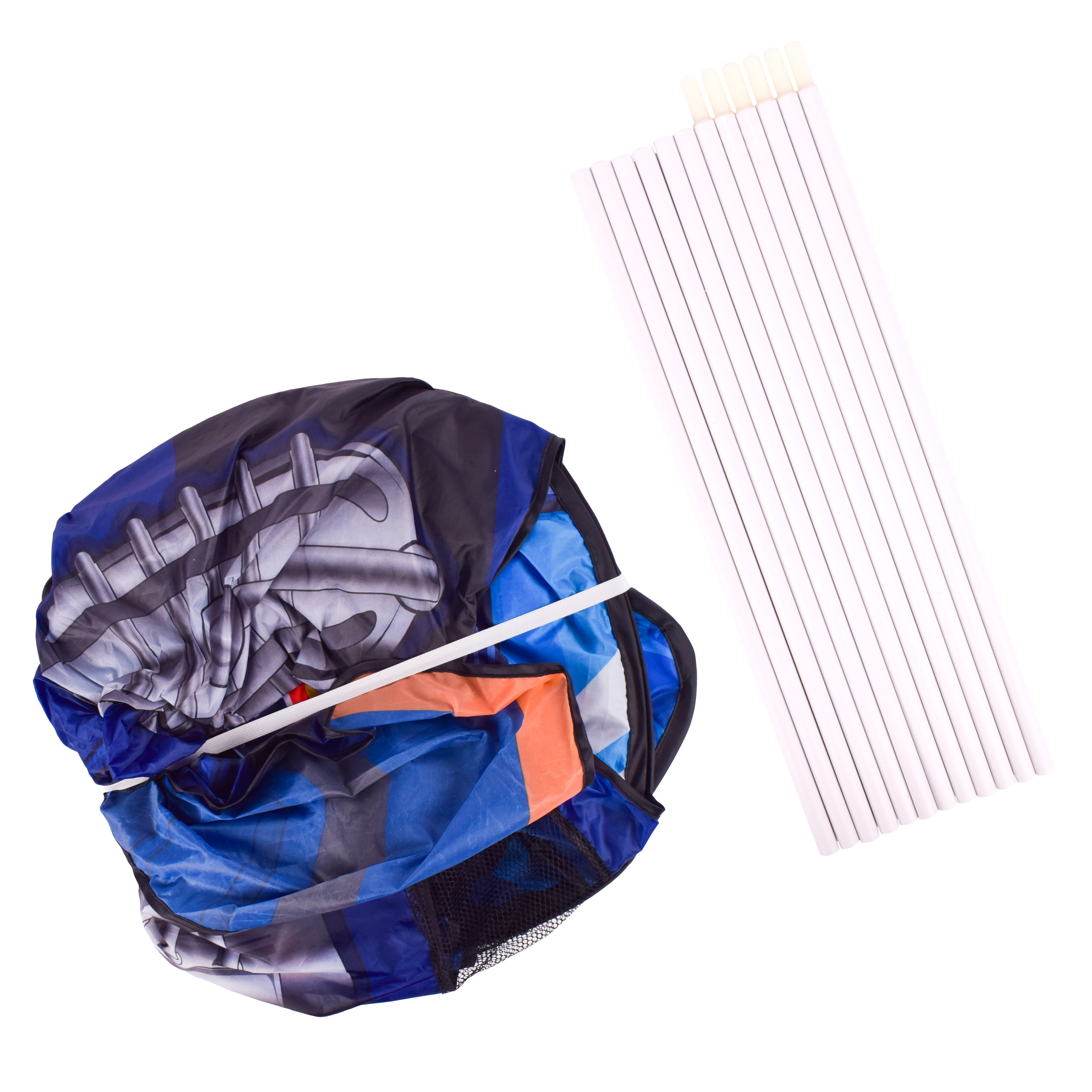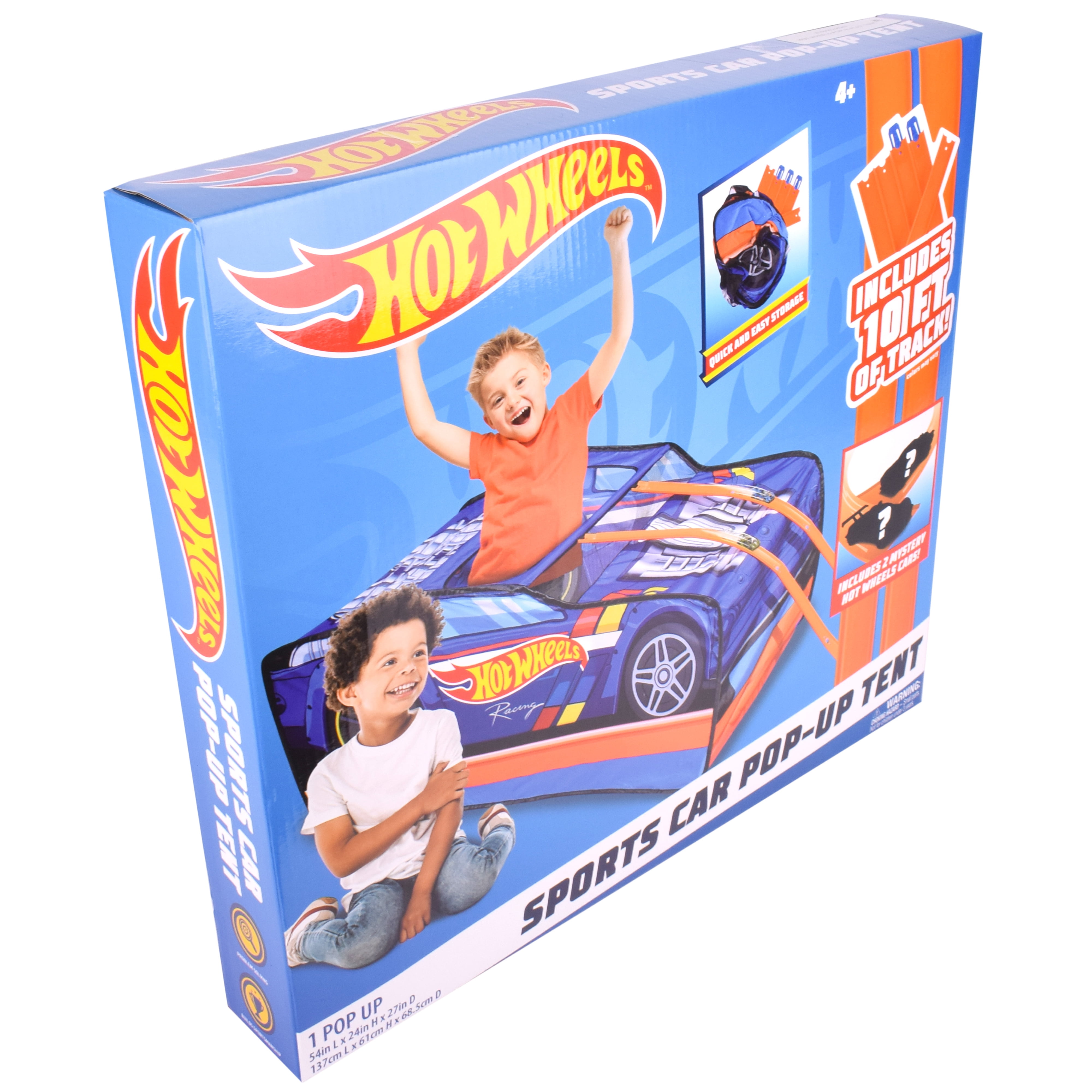 Get your child ready to race indoors or outdoors with the Hot Wheels Sports Car Pop-Up Tent! Equipped with action-packed graphics and a realistic Hot Wheels design, this life-size car tent is ready for endless pretend play possibilities. Take imaginations for a ride with the open floor design that allows little racers to pick up the tent and pretend to drive! Kids can crawl through the rear entrance and stand through the car’s top opening to imagine racing down the track to victory. For double the speed and double the fun, invite a friend to take a spin in your new ride and race your favorite Hot Wheels cars with the attachable 10 feet of Hot Wheels track! Simply attach the track into the front-facing clips, select your winning race cars, and watch them slide down the course to the finish line. Each tent includes two mystery hot wheels cars. Collect all 9 styles including the GT Hunter, Mad Splash, Forward Force, Hi-Roller and more! Designed with safety in mind, this race ready tent has round corners, durable stitching and safe material. Parents will love the simple pop-up design which allows for hassle-free assembly, and easy storage with no tools necessary.