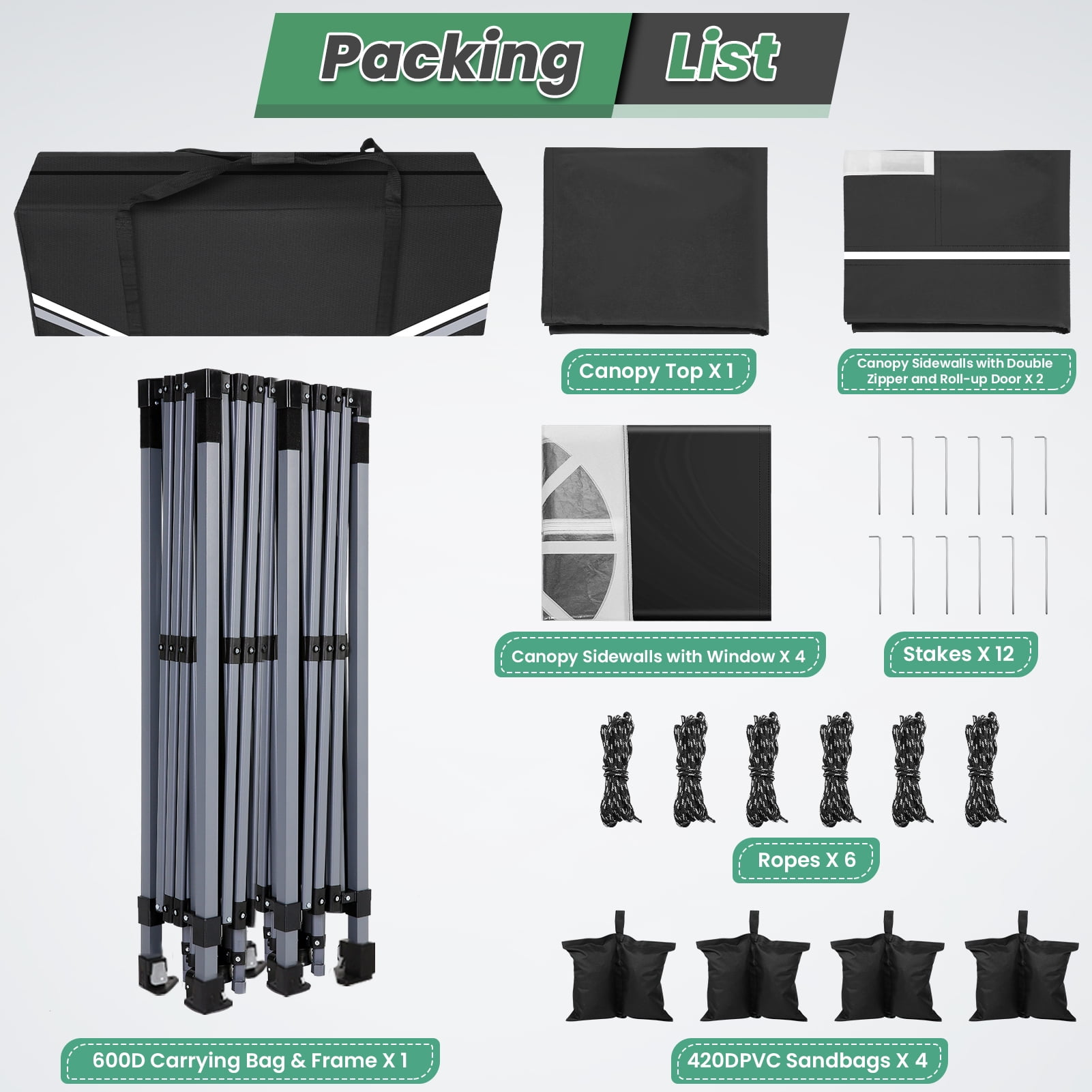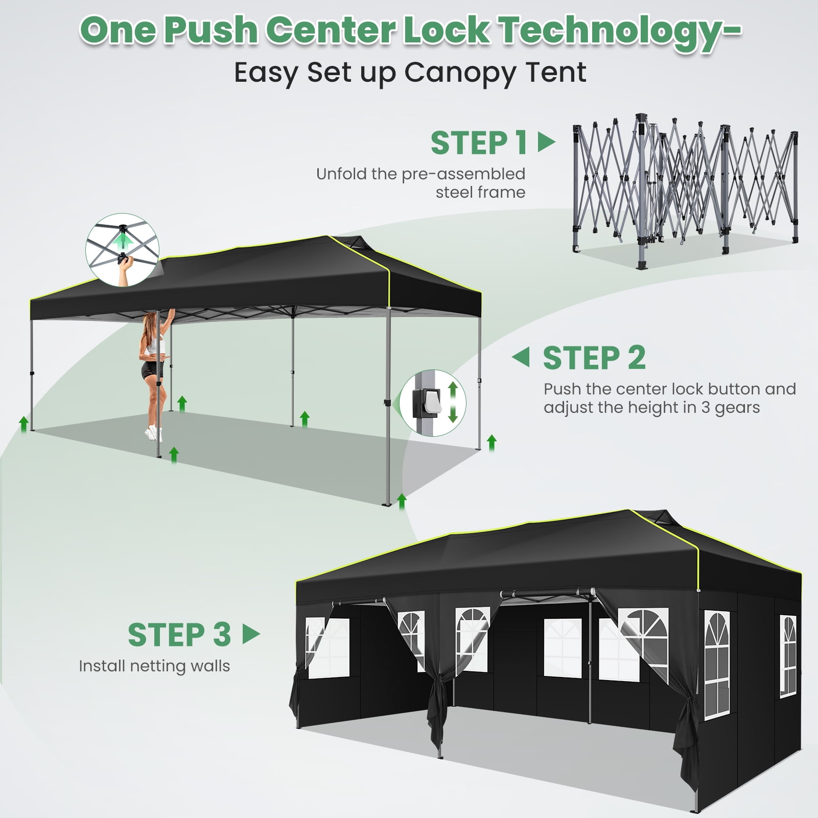 【One Touch Center Button】HOTEEL 10 x 20 pop up awning features a center button and an assembled folding frame that can be set up with a single push and stowed away with a simple pull. Say goodbye to complicated and time-consuming tent setup and enjoy more time enjoying nature with our easy-to-use 10 x 20 outdoor awning. 【Reflective Strips and Vents】This easy to pitch 10×20 tent is equipped with sophisticated reflective strips to improve visibility at night or in low light conditions and to quickly position the 10×20 tent. The vents not only ensure air circulation but also increase the sturdiness of the 10×20 party tent. Keep the inside of the 10×20 tent dry for your comfort. 【Excellent Quality and Design】 This 10×20 outdoor tent is made of 210D Oxford fabric, which is not only abrasion and tear-resistant, but also has a UV silver coating that reflects 99.99% of harmful UV rays, providing you with the best protection from the sun. The sturdy frame is made of rust-resistant powder coated steel, providing a stable and safe shelter for you and your loved ones. 【Spacious Awning Coverage】10×20 pop-up awning can accommodate up to a 2-foot table or 15-20 people at a time.10×20 tent offers 200 square feet of shade coverage. 【6 Removable Sidewalls】10×20 tent comes with 4 clear church window sidewalls and 2 zipper doors. The windows are made of highly translucent material, giving you a wider view from inside the tent. The roll-up door is designed to make it easier to get in and out. Features: Material: Alloy Steel Color: Black Item Weight: 74 Pounds Recommended Uses For Product: Party Product Dimensions: 236.22″L x 118.11″W x 118″H Ultraviolet Light Protection: UPF50+ Frame Material: Alloy Steel Water Resistance Level: Waterproof Pole Material Type: Alloy Steel Coverage: 200 square feet Number of Guylines: 6 Max Ceiling Height: 102.4 Inches Assembly Required: No Package list: 1 x 10*20 210D canopy top cover 1 x 10*20 frame 2 x Double zipper door sidewall 4 x Window sidewall 4 x 420D sandbags 12 x Stakes 6 x Ropes 1 x 600D oxford cloth carry bag 1 x Manual