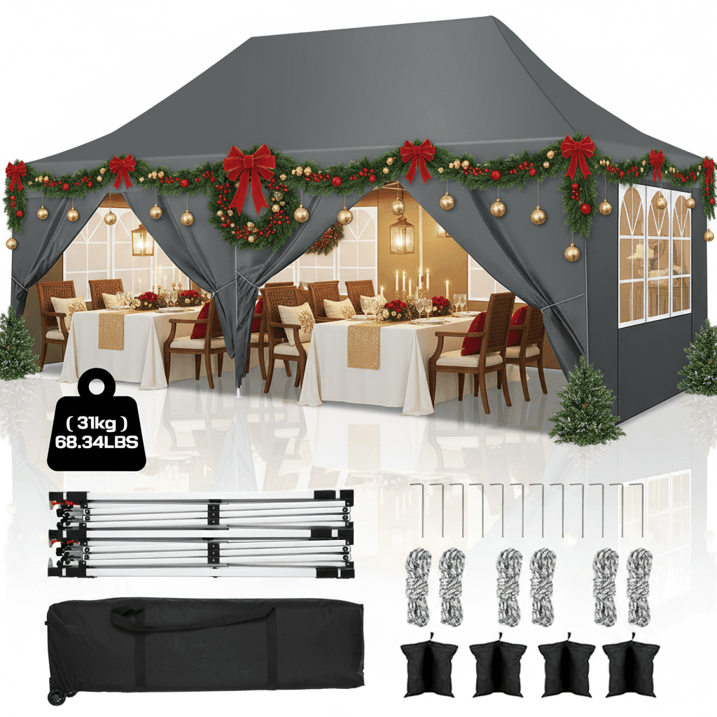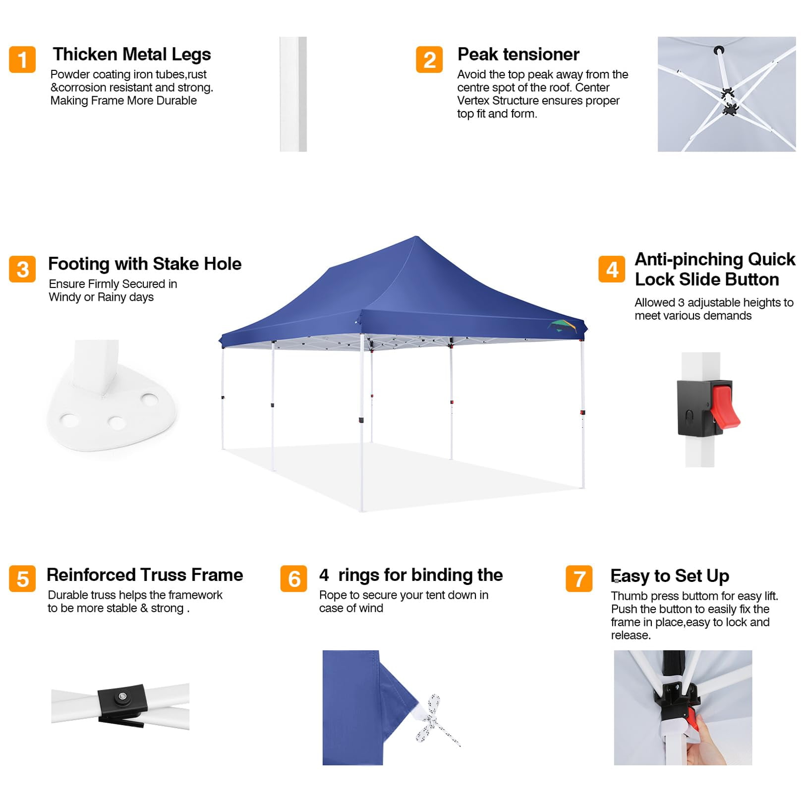 Thumb Button Design:Thumb Button make the Installation more easy and safer. Upgraded 3-Height Settings:The height of tent can be adjust to 109.9″ ,114.7″,117.9″ Upgrade Velcro Strap:Upgraded Velcro, better quality, easier to fix the cloth. Portable Backpack:The Portable carrying case makes this canopy easy to pack and take on the go.The compact packing bag makes transport a breeze,fits in most vehicles. Thumb Button Design:Thumb Button make the Installation more easy and safer. Upgraded 3-Height Settings:The height of tent can be adjust to 109.9″ ,114.7″,117.9″ Upgrade Velcro Strap:Upgraded Velcro, better quality, easier to fix the cloth. Portable Backpack:The Portable carrying case makes this canopy easy to pack and take on the go.The compact packing bag makes transport a breeze,fits in most vehicles. Installation Size:10x20x9.84 ft (Wx Lx H) Package Size:10.2x15x44.8 inch (Wx Lx H) Height adjustable:8.8/9.1/9.4 ft Net Weight:73.19 lbs Frame:Reinforced aluminum frame,28×28 mm of the metal legs thickness Fabric:210D silver coating oxford, UV protection, Waterproof Sidewall:6 sidewall ( 2 panels with zipper+4 panels with PE windowsï¼ Carry Bag:420D Oxford Cloth Installation Size:10x20x9.84 ft (Wx Lx H) Package Size:10.2x15x44.8 inch (Wx Lx H) Height adjustable:8.8/9.1/9.4 ft Net Weight:73.19 lbs Frame:Reinforced aluminum frame,28×28 mm of the metal legs thickness Fabric:210D silver coating oxford, UV protection, Waterproof Sidewall:6 sidewall ( 2 panels with zipper+4 panels with PE windowsï¼ Carry Bag:420D Oxford Cloth Tips 1: When using, tied up your canopy with both the included stake as well as the guy ropes provided. Tips 2: ALWAYS take the canopy down when a storm is approaching. Tips 1: When using, tied up your canopy with both the included stake as well as the guy ropes provided. Tips 2: ALWAYS take the canopy down when a storm is approaching.