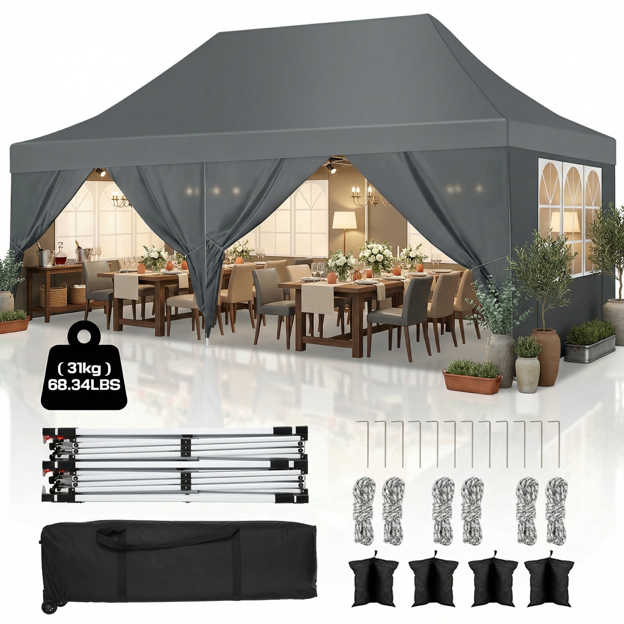 10×20 POP UP CANOPY WITH 6 REMOVABLE SIDEWALLS Host Large Events with Ease: Our extra-large 10x20FT canopy with sidewall and raised roof comfortably accommodates 10-15 people for dining or gathering.The attached 4 side church windows and 2 zippered side walls provide easy access and unobstructed views. Perfect for outdoor event shelter or commercial activities in farmers market, backyard, patio, festivals, beach, sports events, family parties, BBQ. Sturdy Frame & Durable FabricThis pop up canopy with sturdy full truss structure design, made of thick steel frame with anti-rust powder coating. The canopy top is made of 210D oxford fabric with premium UV coating and be attached with waterproof strips, standard UPF 50+ that blocks out 99% harmful UV and water. Upgraded 3-Height SettingsThree different height settings allow you to choose the height that meets your need of the scene (the height is 109.9″ /114.7″/117.9″respectively). Straight leg design provide 200 square feet of shadow area.When you need instant cover, this pop up tent will provide temporary shelter for you and your family or car. Easy to Set up & Take DownWithout any tools, the canopy can be used directly after unfolding. 1 or 2 person can set up in minutes. 6 ropes and 12 stakes enchance the stablity in windy and stormy days. Package includedComes with all accessories. 1x tent, 6 x side walls, 4 x ropes, 12 x stakes, 1 x carry bag. If you have any problem about this tent,please contact us freely.