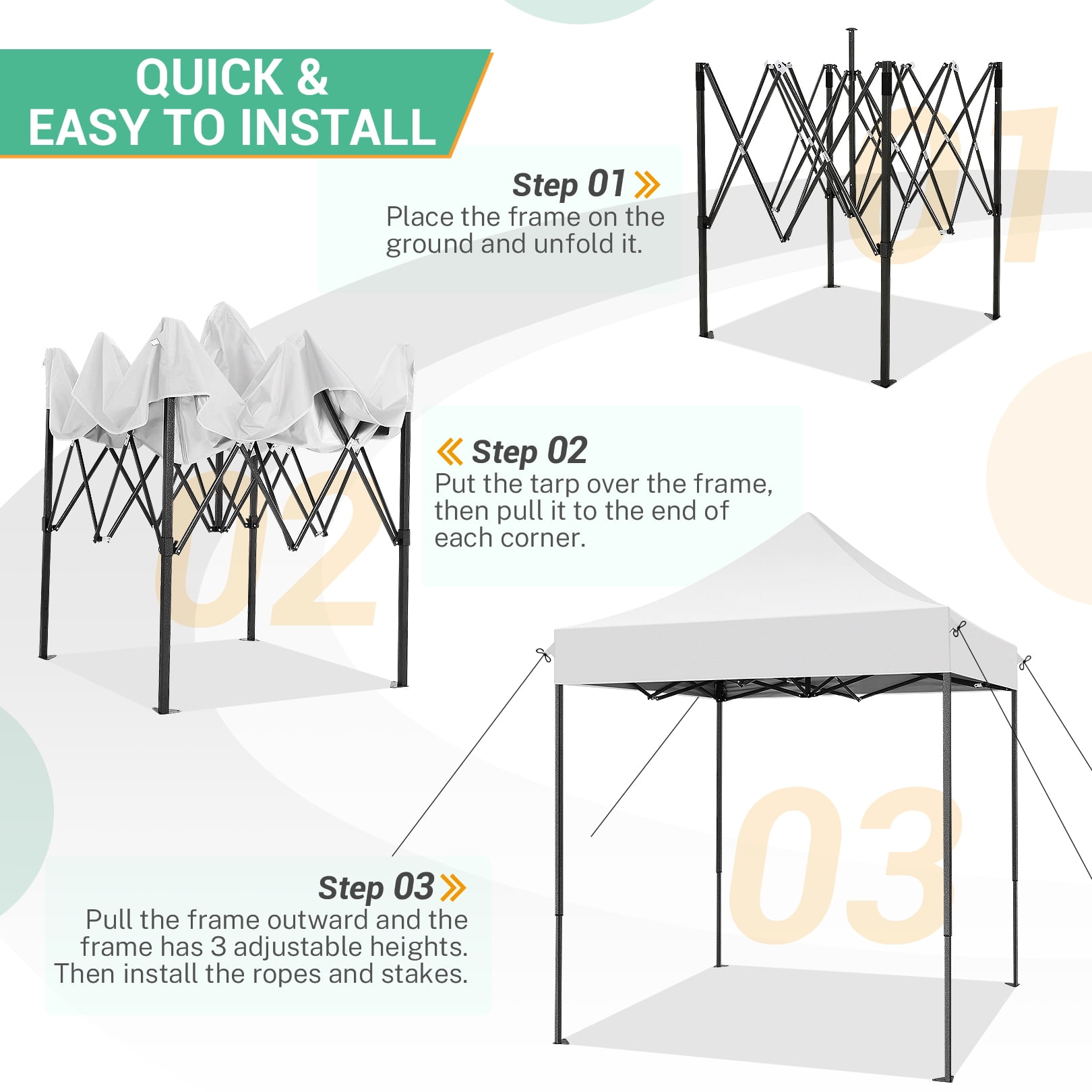 6.6 x 6.6 Ft Pop Up Canopy Features: Waterproof & Anti-UV Oxford Fabric Three Adjustable Heights No Sidewall,Wide View Package List: 1 x Canopy Top Cover 1 x Metal Frame 4 x Ropes 8 x Ground Nails 1 x Manual