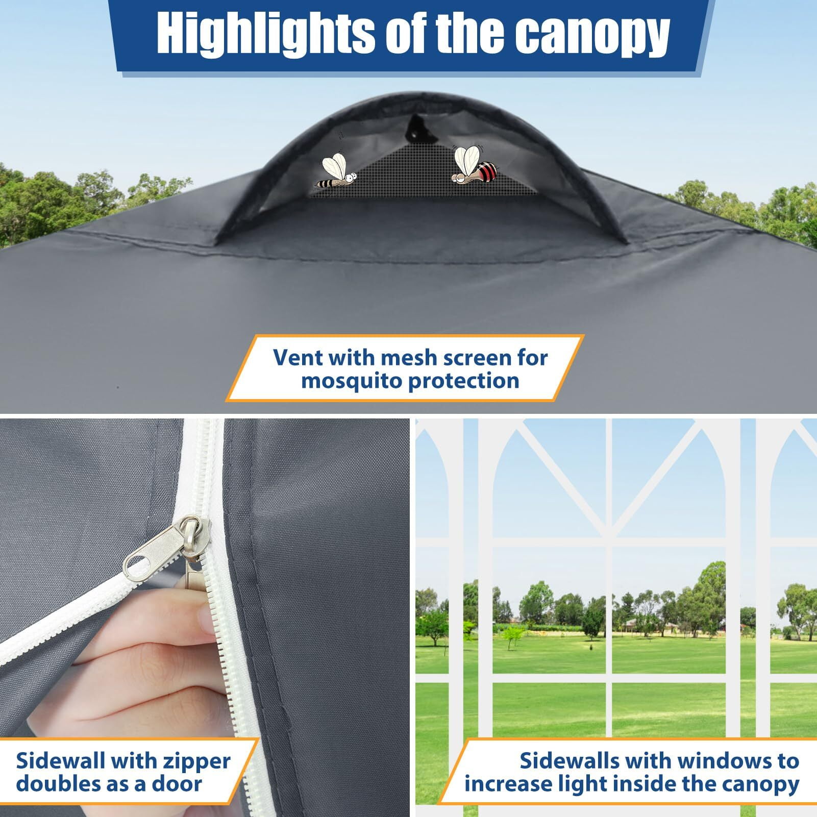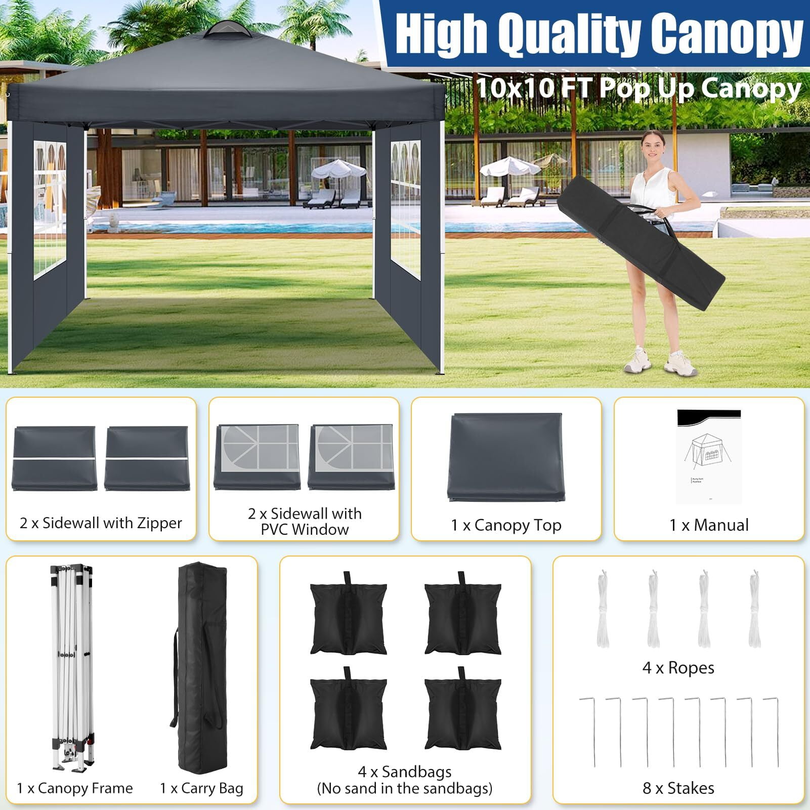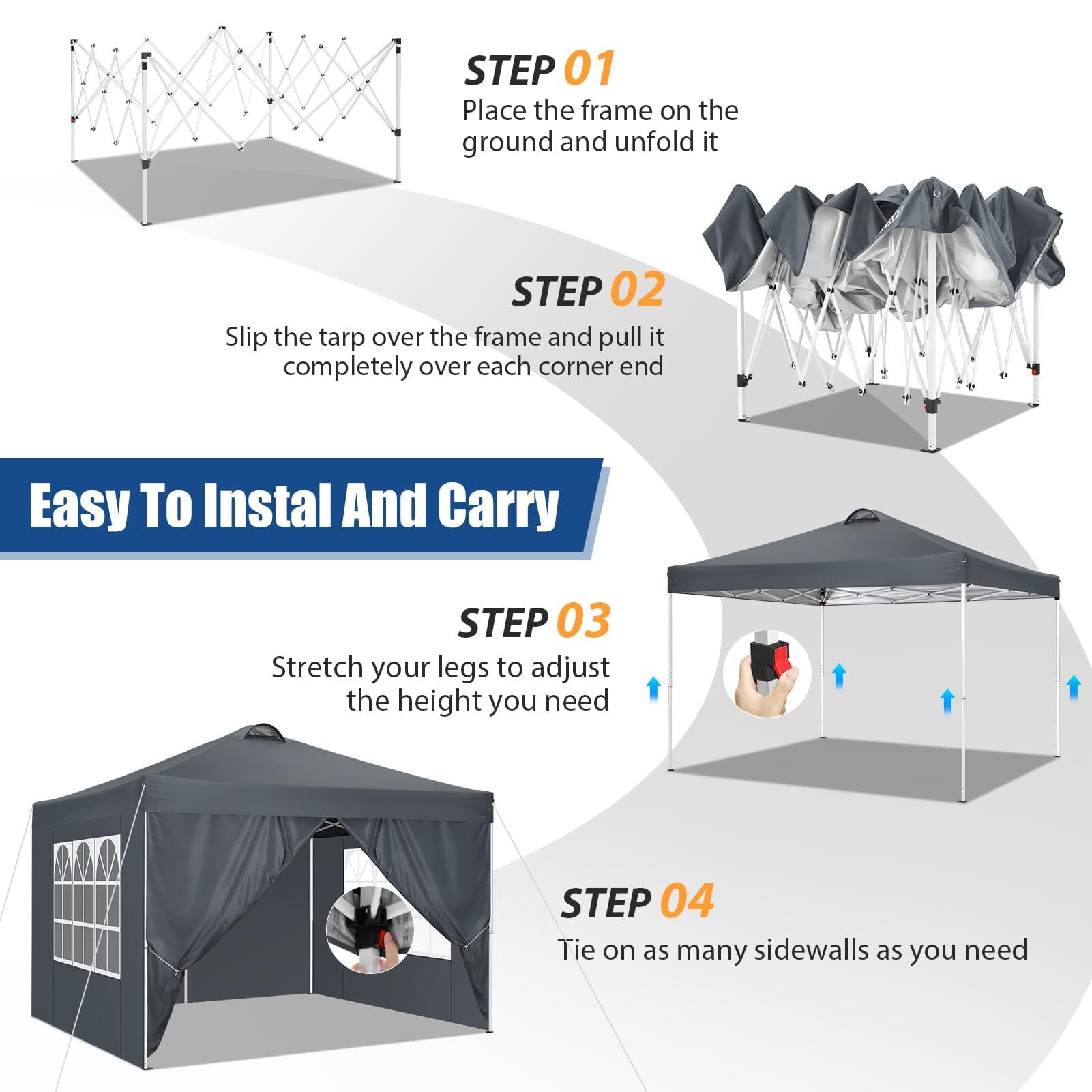 ⭐【Sturdy and Durable Structure】: Use rust-proof powder-coated aluminum and steel frame to enhance the durability of the canopy tent. Canopy Sand Bags, ropes and stakes can ensure that outdoor canopy tent remains stable and strong in the wind. The water pressure of the canopy is 1000pa and the wind force is 4-6. ????【Air Vent Design】: The ventilation holes are conducive to the air circulation inside the tent, especially in the hot summer or cold winter, the air circulation provides a better user experience. ⭐【Quick & Easy Set Up】: To set up the tent, you only need to unfold the canopy frame; drag canopy over the top; lift the top and lock the corner slider button; pull up the frame legs, adjust the height to your expected position and secure the sidewalls. Release the button and the pop up canopy can be folded down easily. ????【High Quality and Excellent Performance】: The roof and sidewalls of the pop up canopy tent are made of 210D Oxford fabric, and the roof is coated with PU, UV protection of 50+. The seams are sewn with high density stitching and treated with waterproof material under high temperatures and pressure.10×10 ez up canopy tent offers excellent coverage and shade. ⭐【Easy to carry & Multifunctional Use】: The disassembled frame can be put into a bag together with the ceiling for easy carrying. Just put party tent into the carry bag and you can quickly set it up anytime, anywhere, whether for outdoor events, carport, parties, wedding, picnic, BBQ, and other event uses. Specifications: Size:10 x 10 FT Product Dimensions: 120″L x 120″W x 102″H Height up: 72.8 / 76.8 / 80.7 inch Fabric: 210D Silver Coating Oxford, 100% waterproof Carry Bag Size: 46.5×7.9×7.9 inch Gross Weight: 33 lb Package Content: 1 x pop up canopy 2 x sidewalls 2 x door walls with middle zipper 4 x sandbags 1 x storage bag 8 x Anchor Nails 4 x Ropes