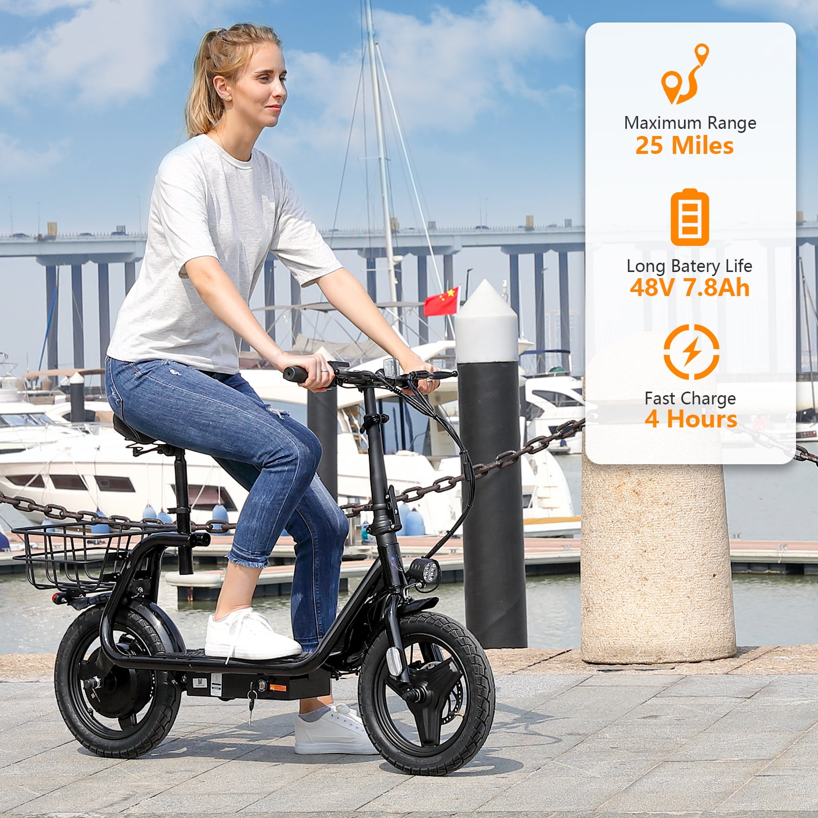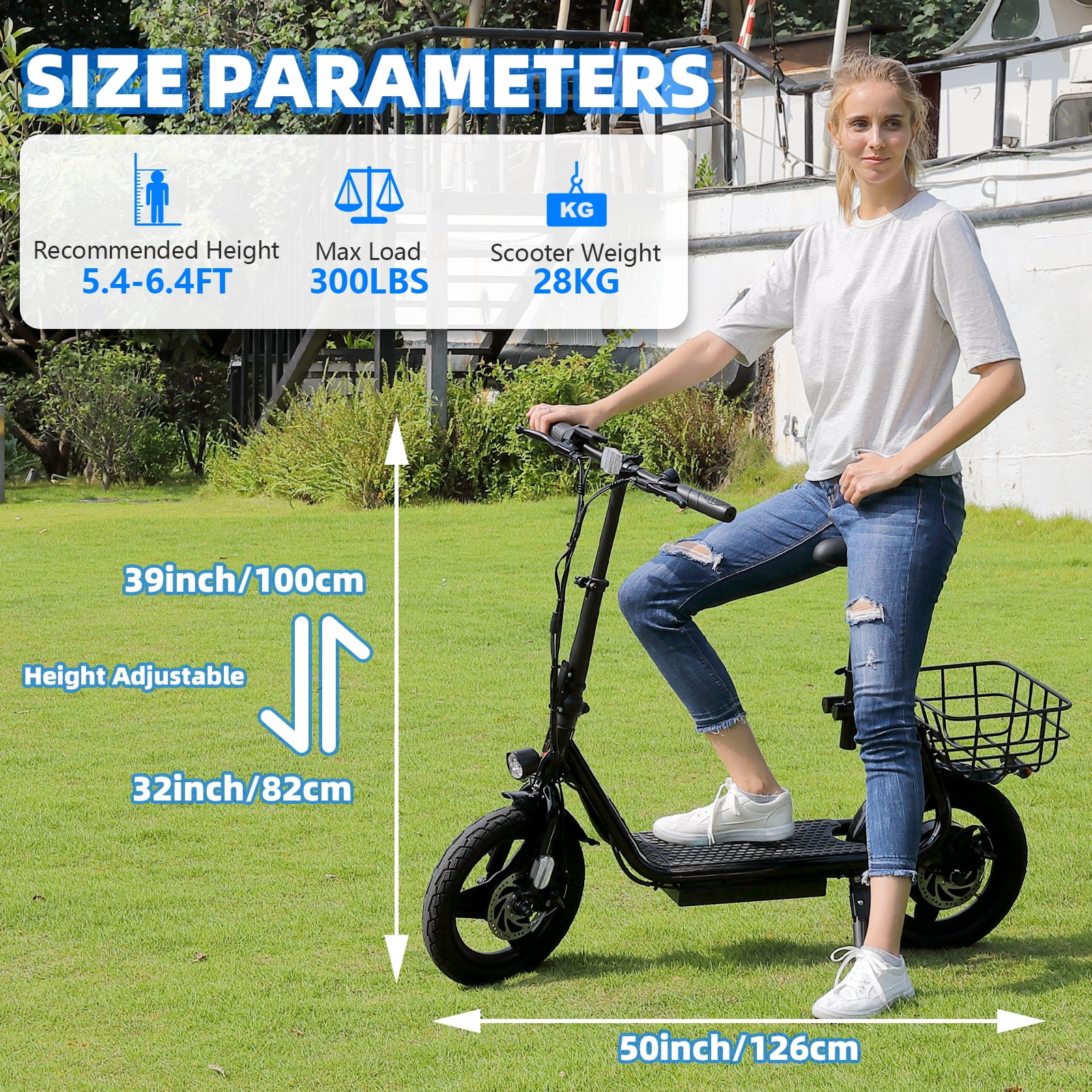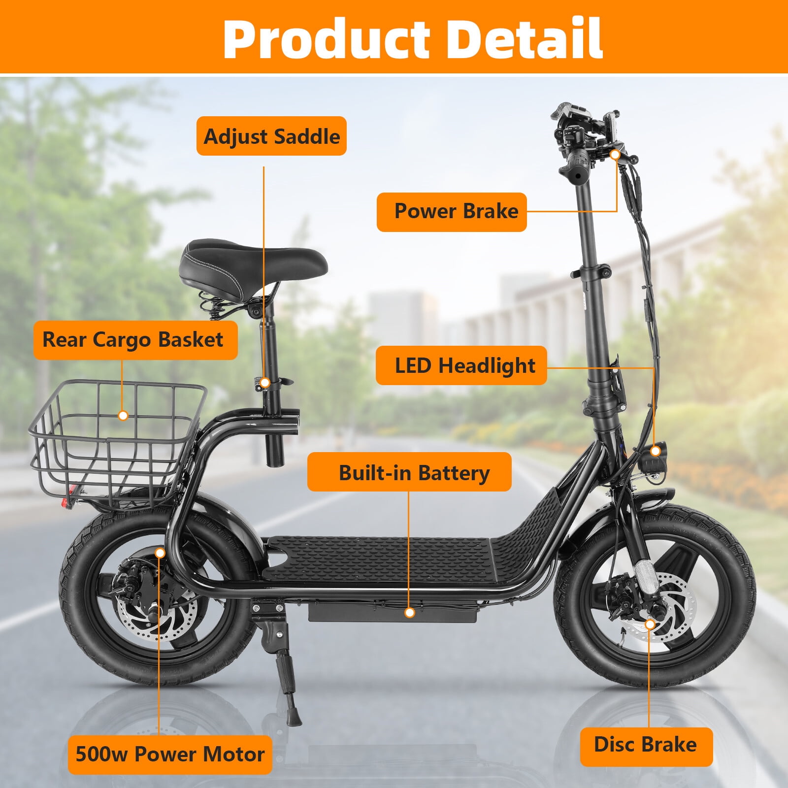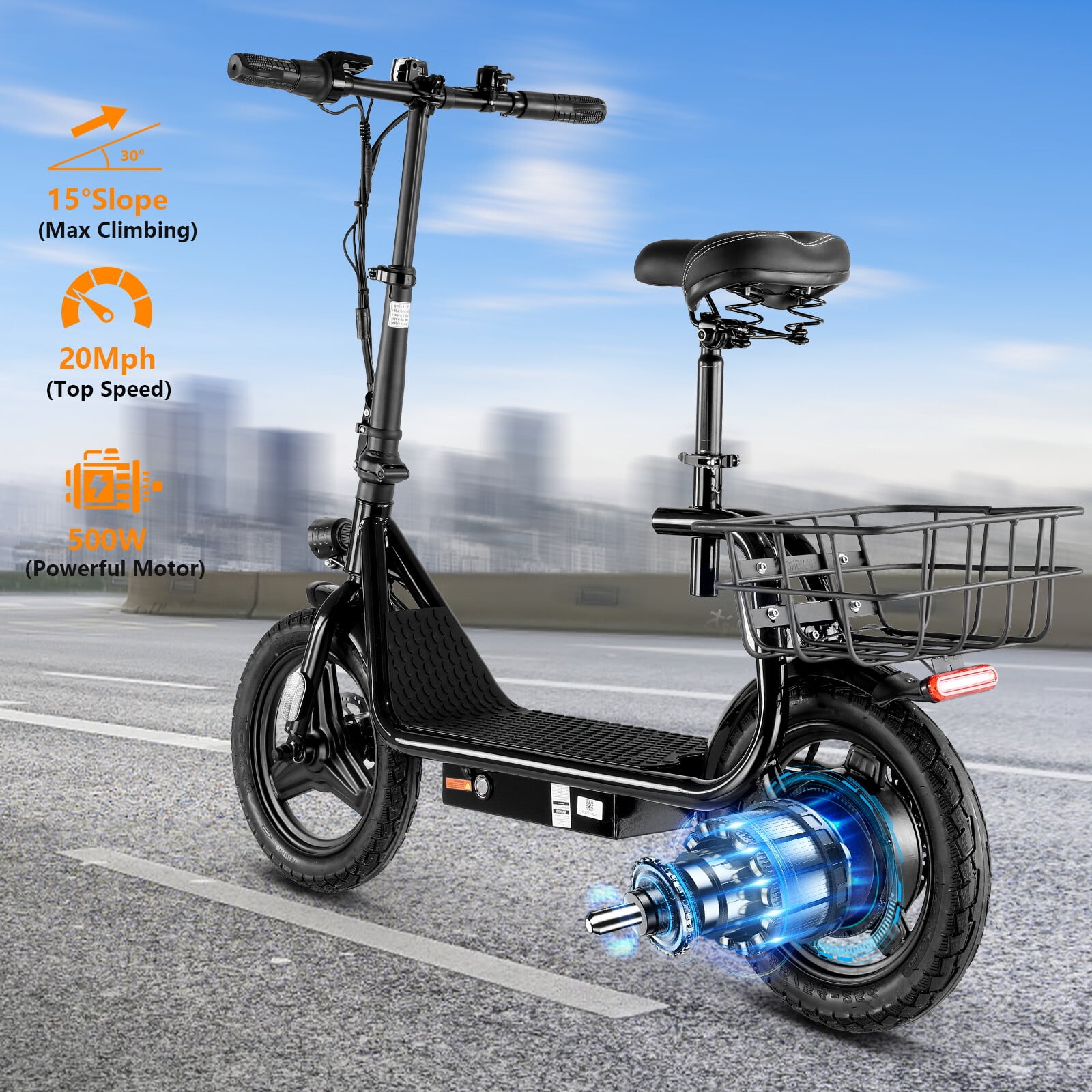 About this item ✔️【Powerful Motor & Long Battery Life】HOTEEL electric scooter adults with a 500W(Peak 800W) electric brushless hub motor allows for speeds up to 20mph. This adult electric scooter has a capacity 48V battery with a max travel range of up to 25 miles under specific conditions and a maximum load of 265 lbs. ✔️【Smooth & Safe Riding】HOTEEL electric scooter with seat with Larger 14″” rubber pneumatic tires increases shock absorption from bumpy city riding, bringing a smooth ride. HOTEEL escooter electric for adults with a 9.5″” wide deck and adjustable saddle make it more comfortable even on a long-range commute. Disc brake & E-ABS, ensuring an effective braking distance and safety. ✔️【Design for Commuters】HOTEEL electric scooter with seat for adults comes with a basket above the rear wheel, perfect for shopping trips and short errands around the block. Built-in spot headlight makes the road visible and safe to ride at night. ✔️【Foldable & Easy to Carry】This seated electric scooter has a folding design. The compact folded size makes it easy to store in car trunks and other tight spaces, detachable scooter seat is included. ✔️【Easy Assembly & After Sales Guarantee】The adult electric scooters comes 90% assembled, with an instruction manual and installation tools. No worries about assembly. If your HOTEEL scooter has a motor failure, charging problems or missing accessories, please contact us in time and HOTEEL will provide you with the best service. ➤Rear Basket: Yes Motor: 500W (Peak 800W) Battery: 48V Max Range: 25 Miles Top Speed: 20 MPH Brakes: front drum brake and E-ABS Max Load: 265 LBS Net Weight: 65 LBS Charging Time: 4H Fits for Ages: 12+ years ????️Motorrized Scooter: HOTEEL 500W electric scooter for adults with 25-mile range and max speed of 20 mph ????️Electric Scooter Accessories: HOTEEL electric scooter adult with rear carry basket and scooter deck, front LED light for safety, comes with toolkit ????️Battery Capacity: 48V lithium-ion battery with intelligent overload and low voltage protection ????️charging time: 4 hours, with battery power display This seated electric scooter comes with a breathable seat to fit people from 4’9″” to 6’1″” tall, suitable for 12 years old and above Unisex. ????️Safety First: Recommended scooters for teens 12 years and up with steel rigid fork, rear disc-brakes, 14″” tires for multi terrain use, reflective rear reflectors and front lamp ????️Lightweight: weight:65 lbs, maximum carrying load of 265 lbs. ????️Warranty information:30 days free return and exchange service for product quality. 1 year warranty, except tires or other consumables. The battery warranty is 6 months.