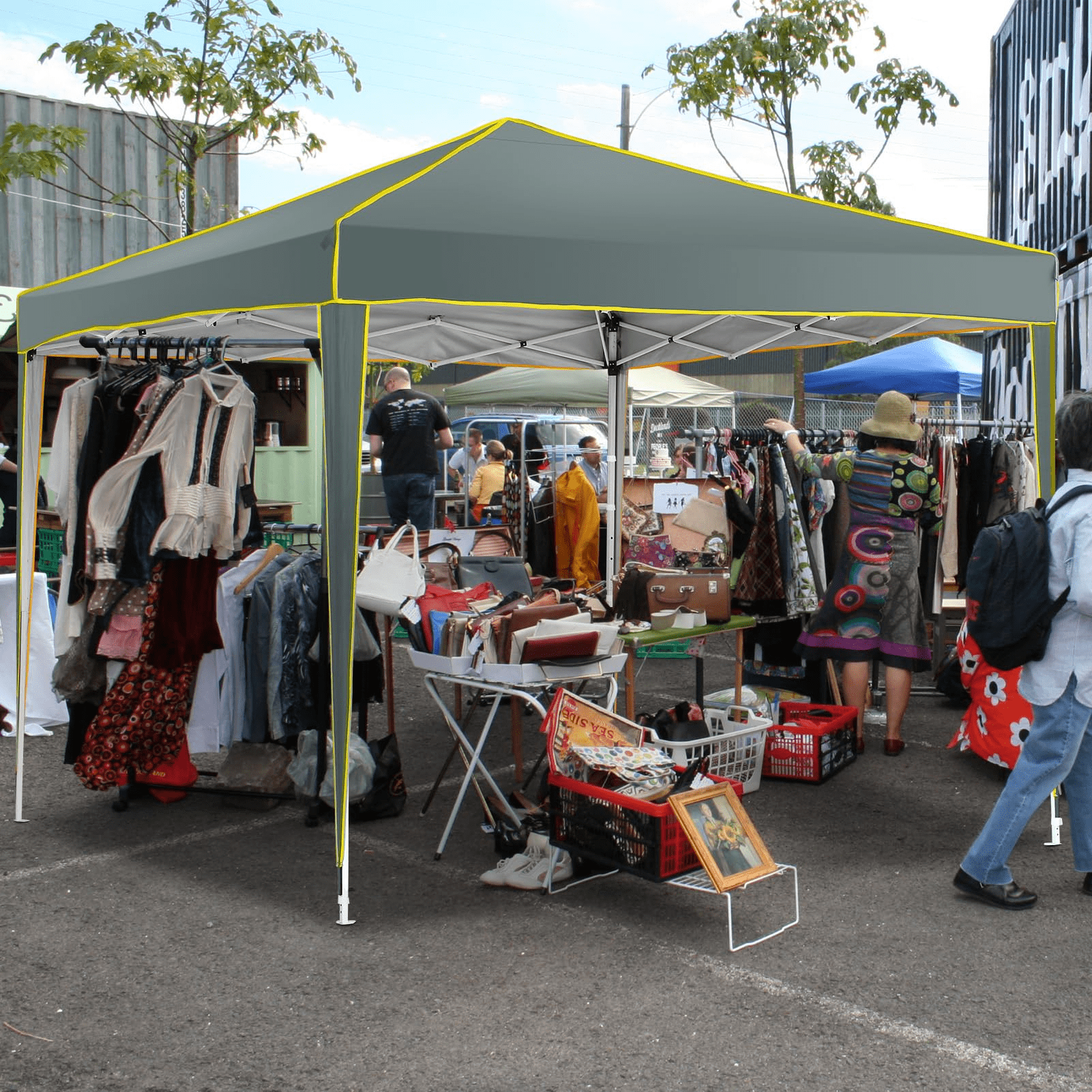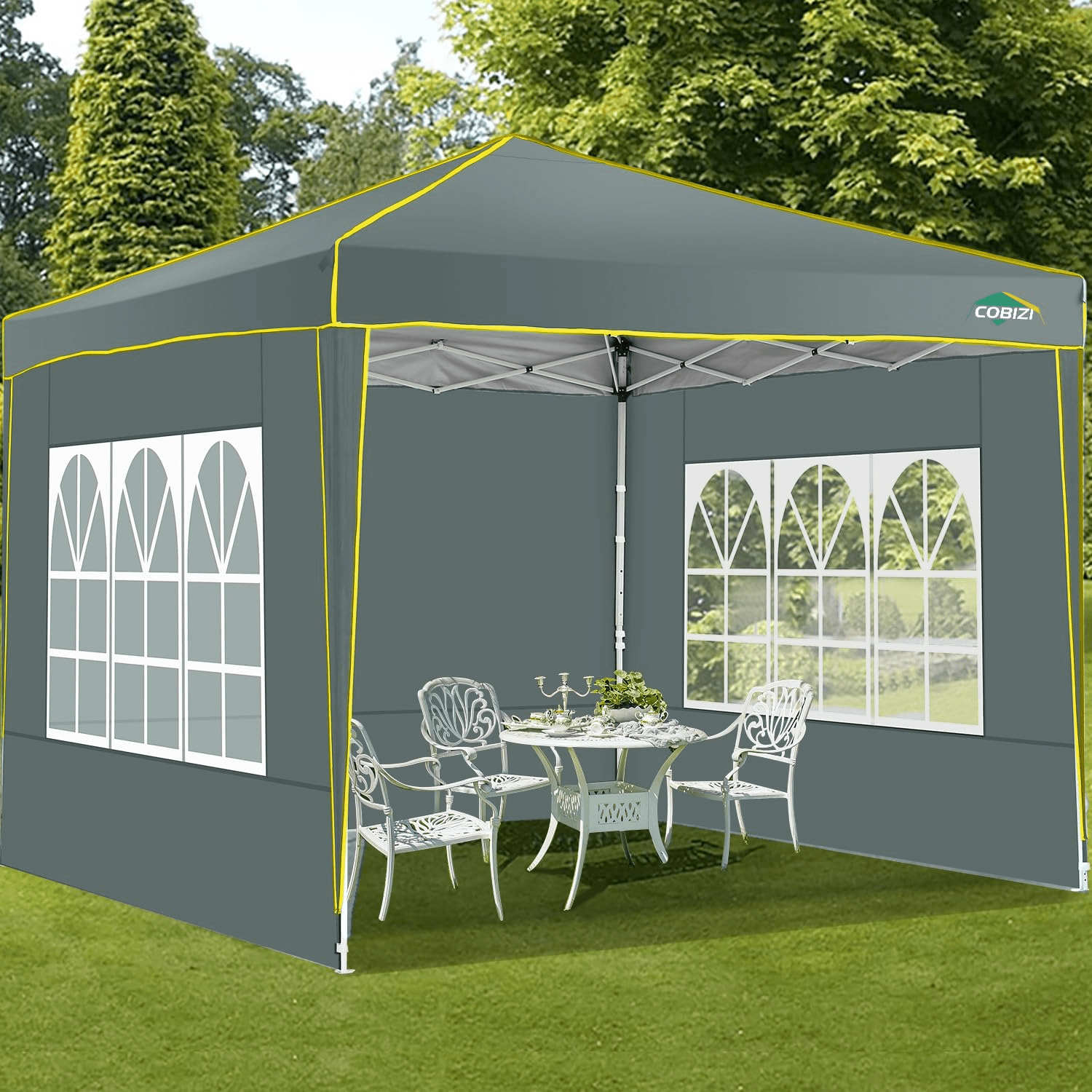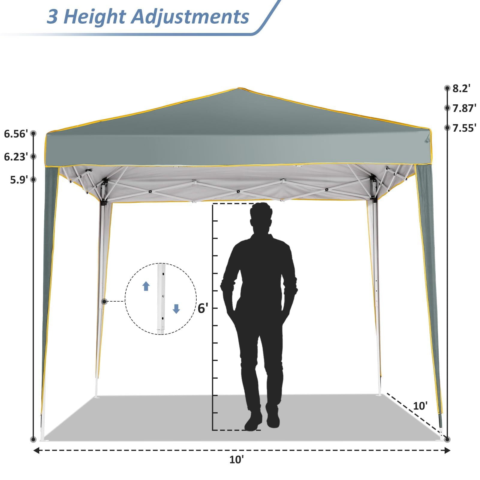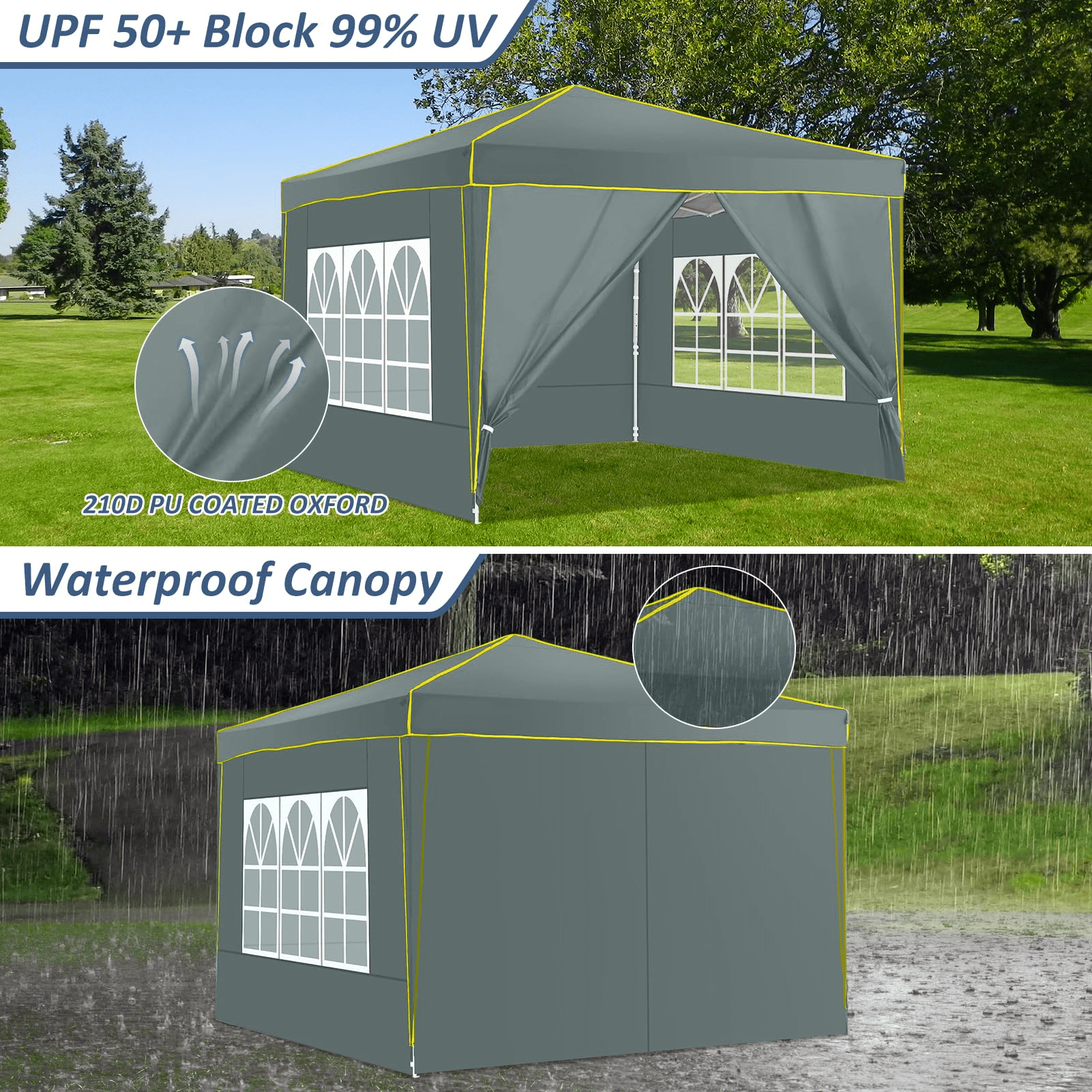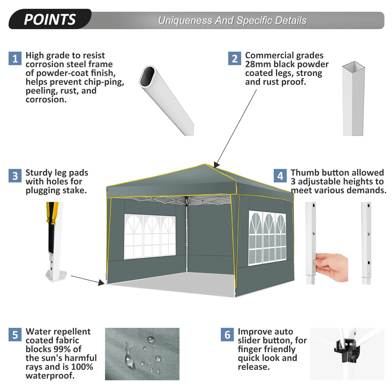 product highlights: Durable Construction: Crafted with PVC coated roof oxford fabric, boasting 50+ UV protection and water resistance. Sturdy Design: Features a robust structure with sturdy columns for enhanced stability. Versatile Use: Ideal for various occasions including food vendors, booths, tradeshows, fairs, markets, family gatherings, picnics, and camping. Easy Portability: The frame disassembles easily and fits into a bag along with the canopy ceiling for convenient transportation. Weather Protection: Offers waterproof protection, making it perfect for outdoor use, shielding you from both sun and rain. Customer Satisfaction Guarantee: If you’re not completely satisfied with your purchase, we offer a 30-day Return Window , ensuring peace of mind. Rest assured to buy with confidence. After-sales service: Our dedicated after-sales service team is available round the clock to address any queries or concerns. Simply reach out to us via email, and we’ll promptly assist you in finding a solution. ◈Specification: Material:210D Oxford Cloth with Silver Coating Frame Material:Metal, Alloy Steel Color:Black/Light White/Blue/Khaxi/Green Gray/Dark Blue Item Dimensions LxWxH:120 x 120 x 98 inches Upgraded 3-Height Settings:97.2″-100.8″-104.4″ Weight:30.8lbs Water Resistance Level:100% waterproof Ultraviolet Light Protection:Yes Shape:Square Recommended Uses:Beach, Party, Picnic, Outdoor Activities ◈Package Content: 1×Pop Up Canopy Tent 4×Sidewalls 1×Bag 4×Stakes 4×Ropes 4×Sandbags 1×Manual