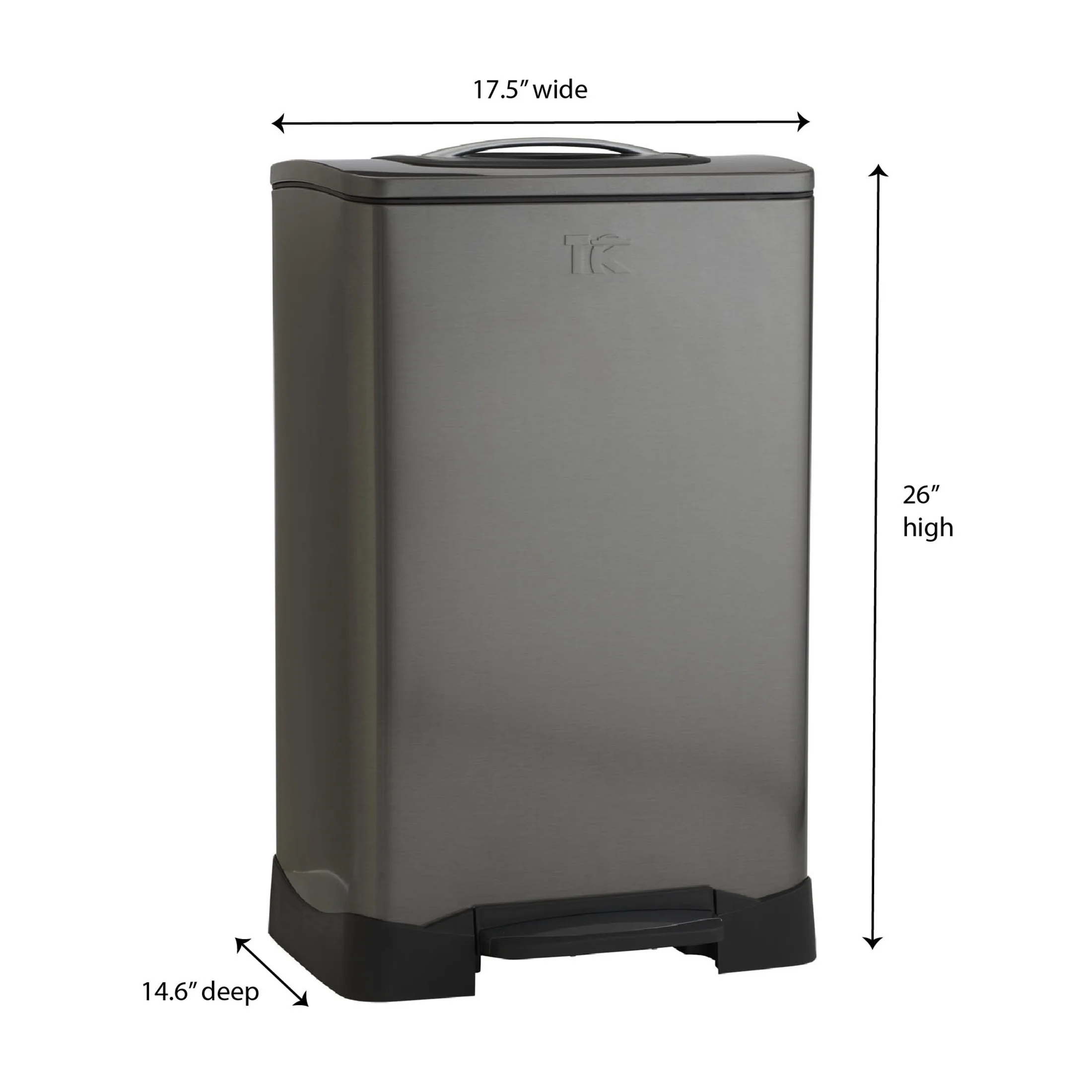 Save energy and money with this 50 liter family-size trash compactor trash can. With the manual compactor built into the lid, this trash can will fix 2 times more waste than normal 50 liter bins. This compactor will save you money spent on bags and extra trips to take out the trash. The hands-free foot pedal and large rim will help keep your hands free and clean during use. Use this trash compactor in large family kitchens to decrease excess trash bag use and the chore of taking out the trash This trash can uses standard 13 gallon bags and the inner lining has an anti-slip bag lock. Stainless steel exterior with fingerprint resistant finishing Dimensions: 25.5″ H (additional 10” with lid open) x 17.5″ W x 14.6″ D; Lid Thickness: 0.55 mm; Wall Thickness: 0.46 mm 0