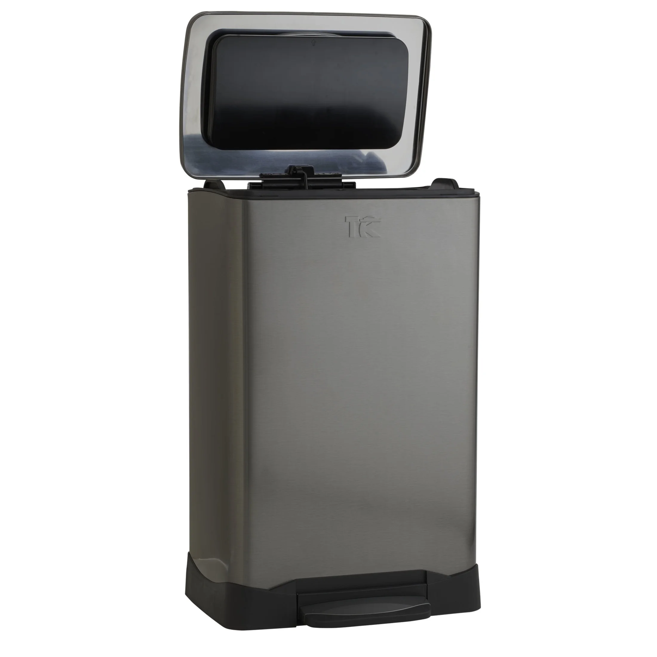 Save time, money and plastic with this large trash compactor trash can. Its 50 liter volume makes it the optimal choice for family-size kitchens and individuals who want to cut down on garbage bag use and trips to the curb. Its sleek stainless steel design and fingerprint resistant coating will also add to the look and feel of your kitchen while keeping waste out of sight. The compactor is manual, requiring neither batteries nor electricity. To compact trash, detach the compaction device by pressing down on the handle until it releases, then push down to compact the garbage to the bottom. Once done, bring the compaction device back up and it will magnetically attach back to the lid. While compacting, the can’s wide lid and compaction device will make the job easier and help keep your hands clean at the same time. When it comes time for a new bag, hold the stay-open lever to keep the lid open and add a new 13 gallon bag. Once replaced, a specialized bag lock will conveniently prevent the bag from slipping. The can’s hands-free foot pedal operation keeps your hands clean and unoccupied while opening the can, and the can has a soft-close lid. Household Essentials stands by this product with a 10-year warranty, and our customer service team is always ready to help with any issues. If you have any problems, please contact us.