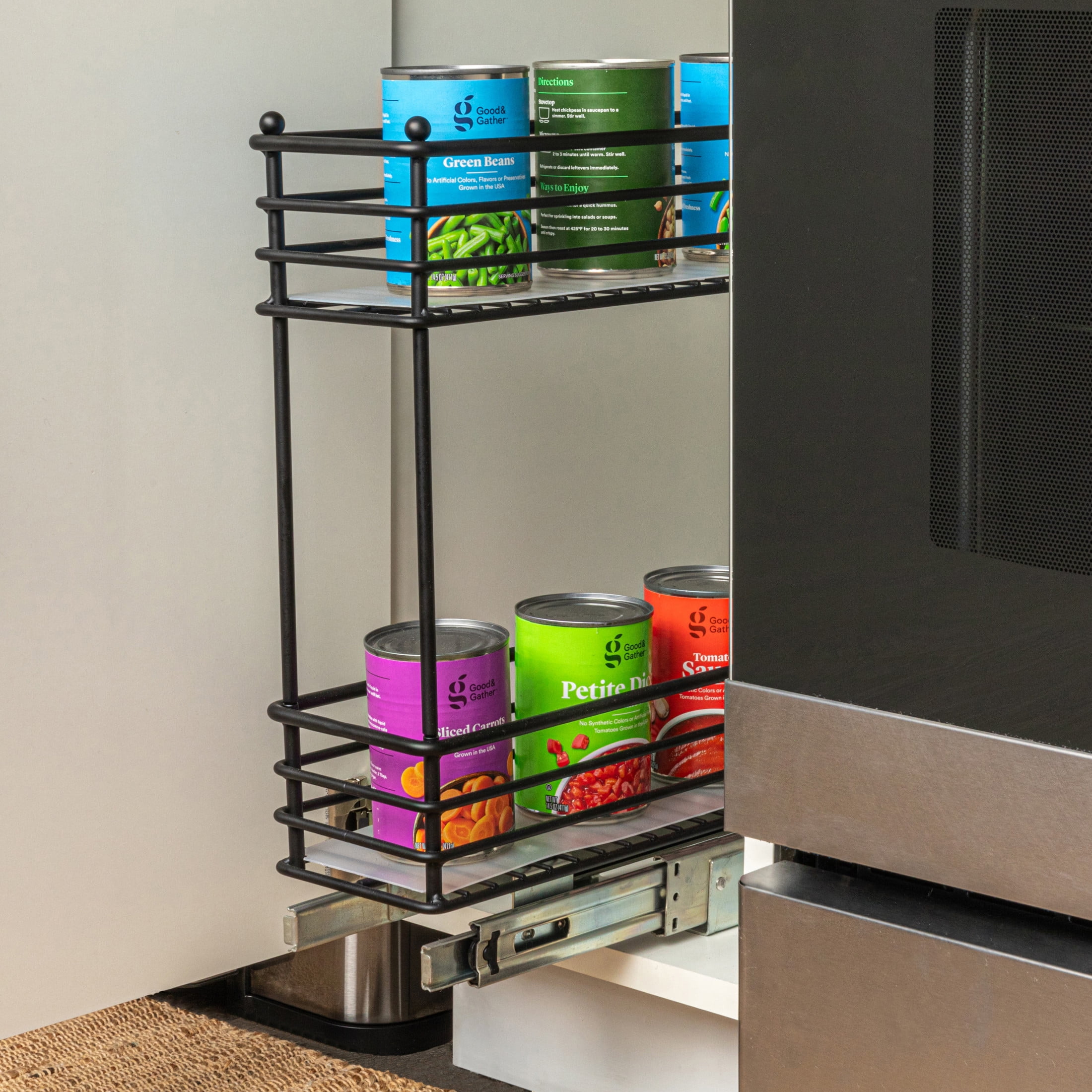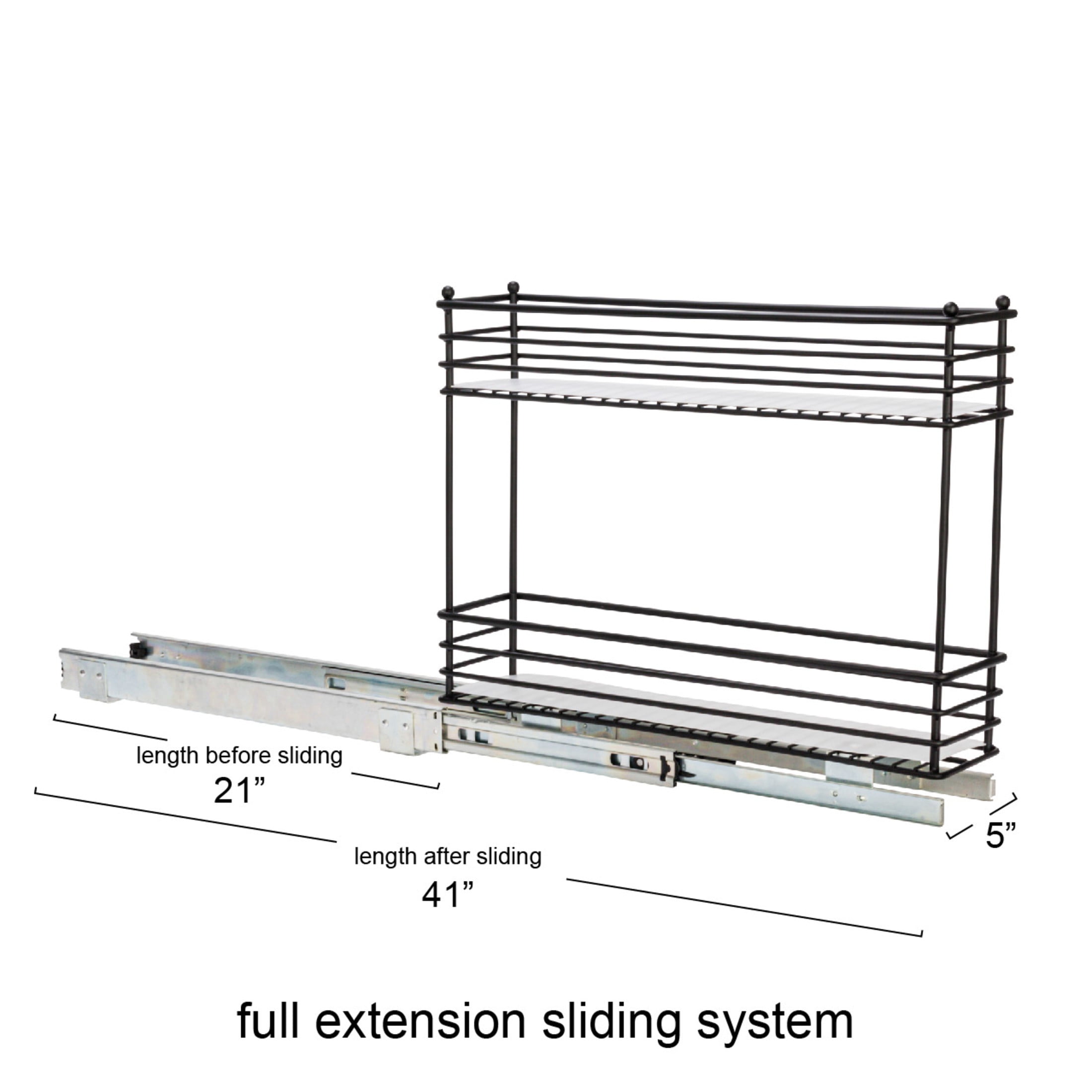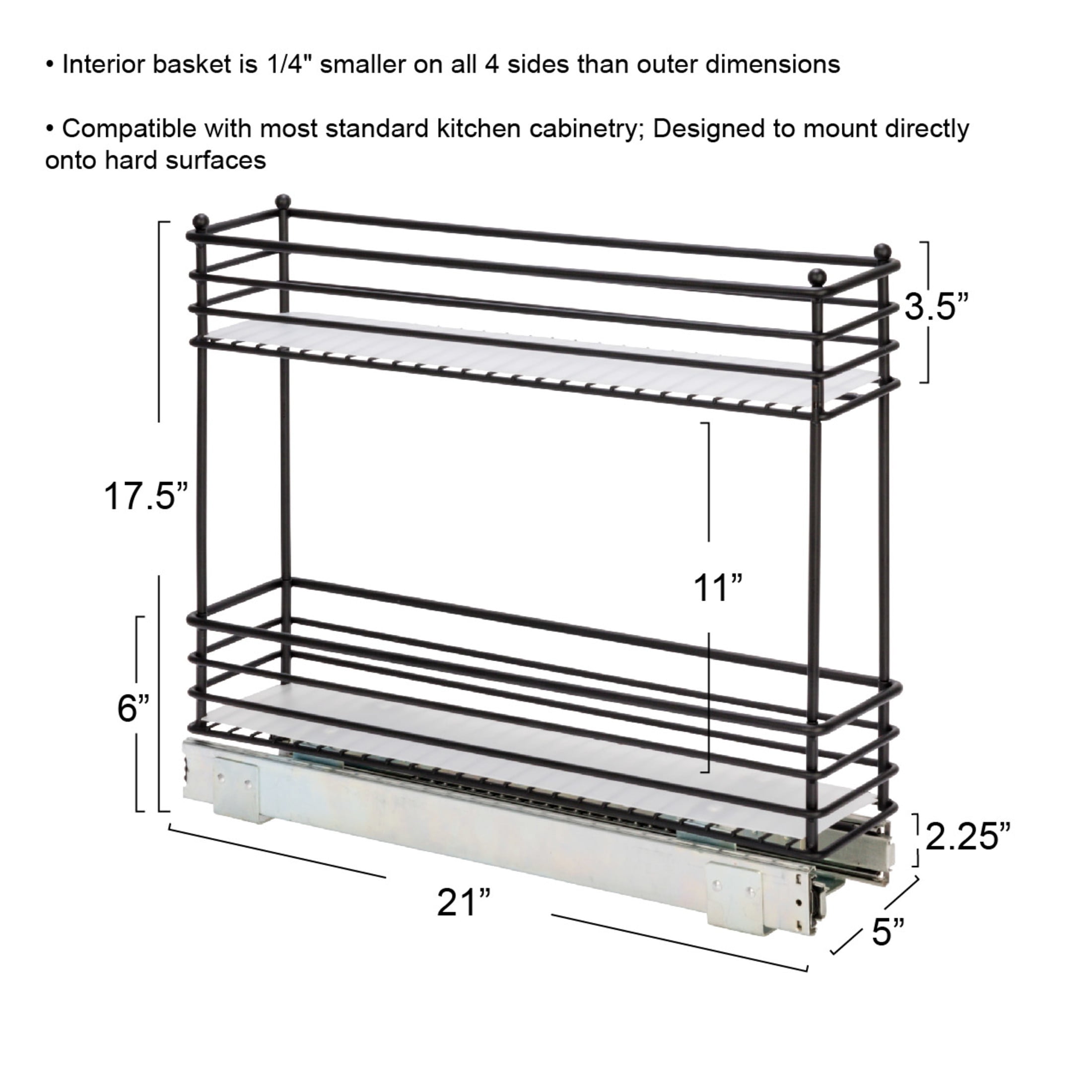 This cleverly designed, durable paint-finished steel organizer offers 2 tiers of storage space crafted to fit anything from cans and dry goods to cleaning essentials; Equipped with an easy-mount full-extension ball-bearing sliding base Compatible with most standard kitchen cabinetry; Designed to mount directly onto hard surfaces Maximum weight capacity of 33 pounds; Includes removable PEVA liners to help protect against leaks and spills Made from high quality steel with a durable powder paint coating; Simple installation (mounting hardware included) Organizer measures 21 inches D x 5 inches W x 17.5 inches H (See product images for detailed measurements)