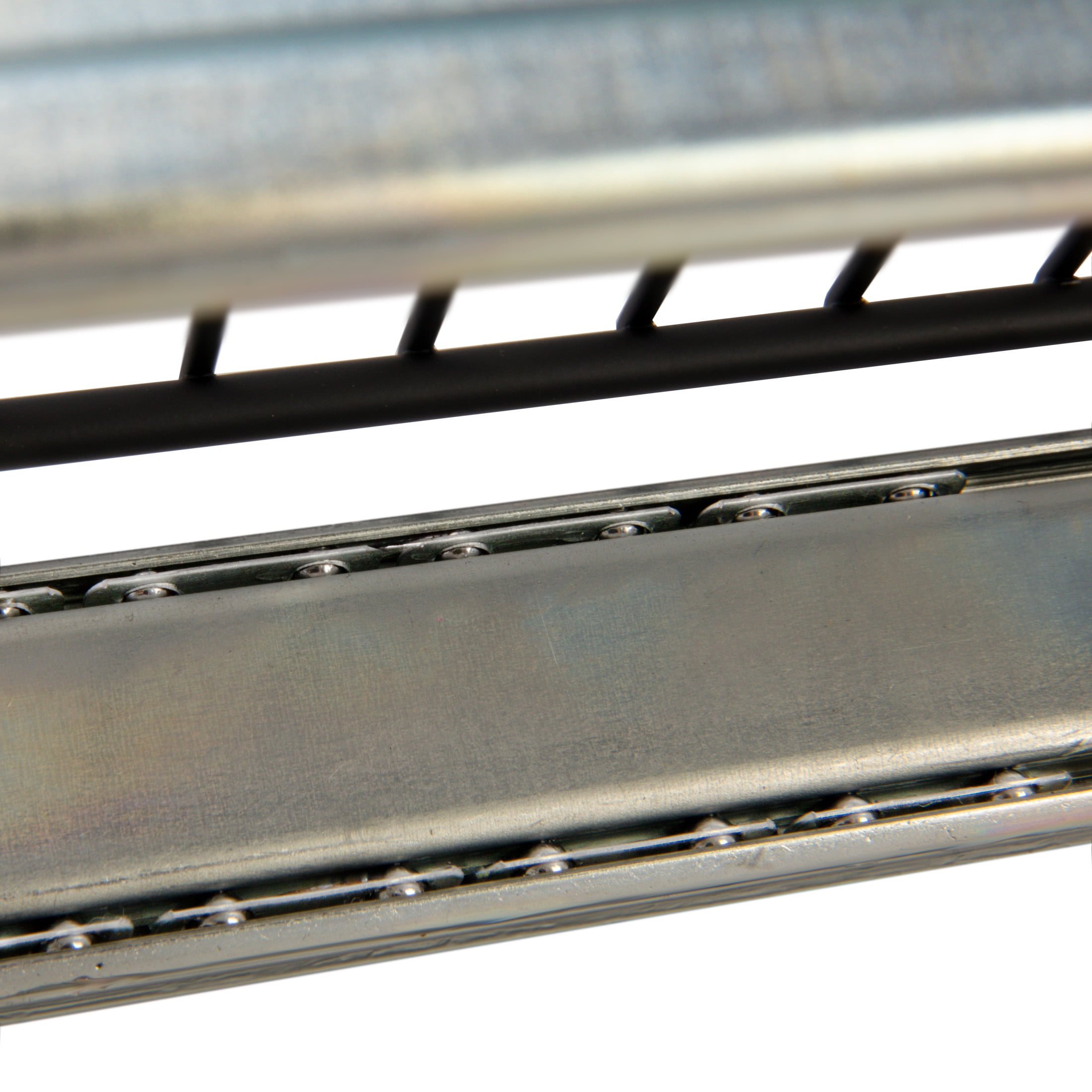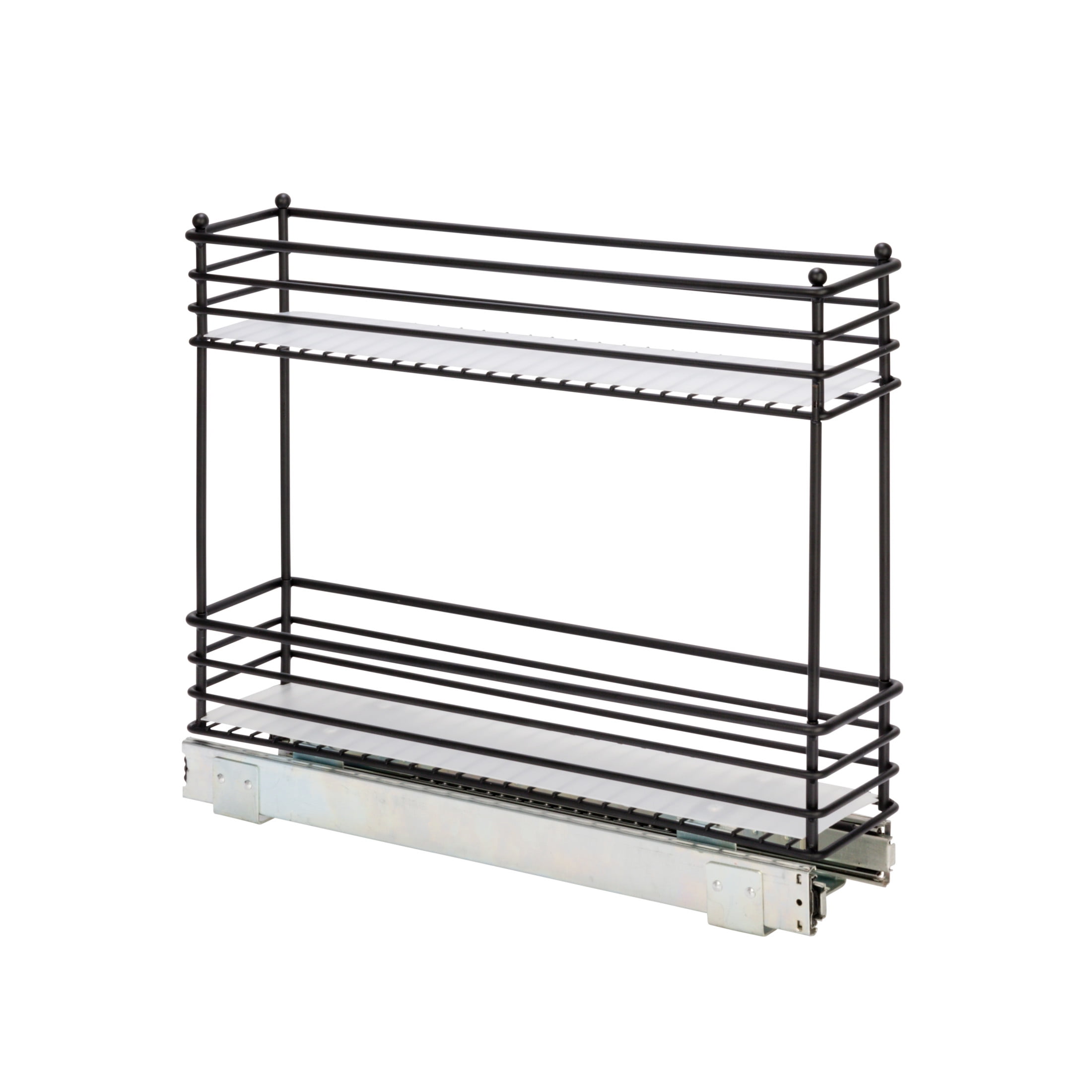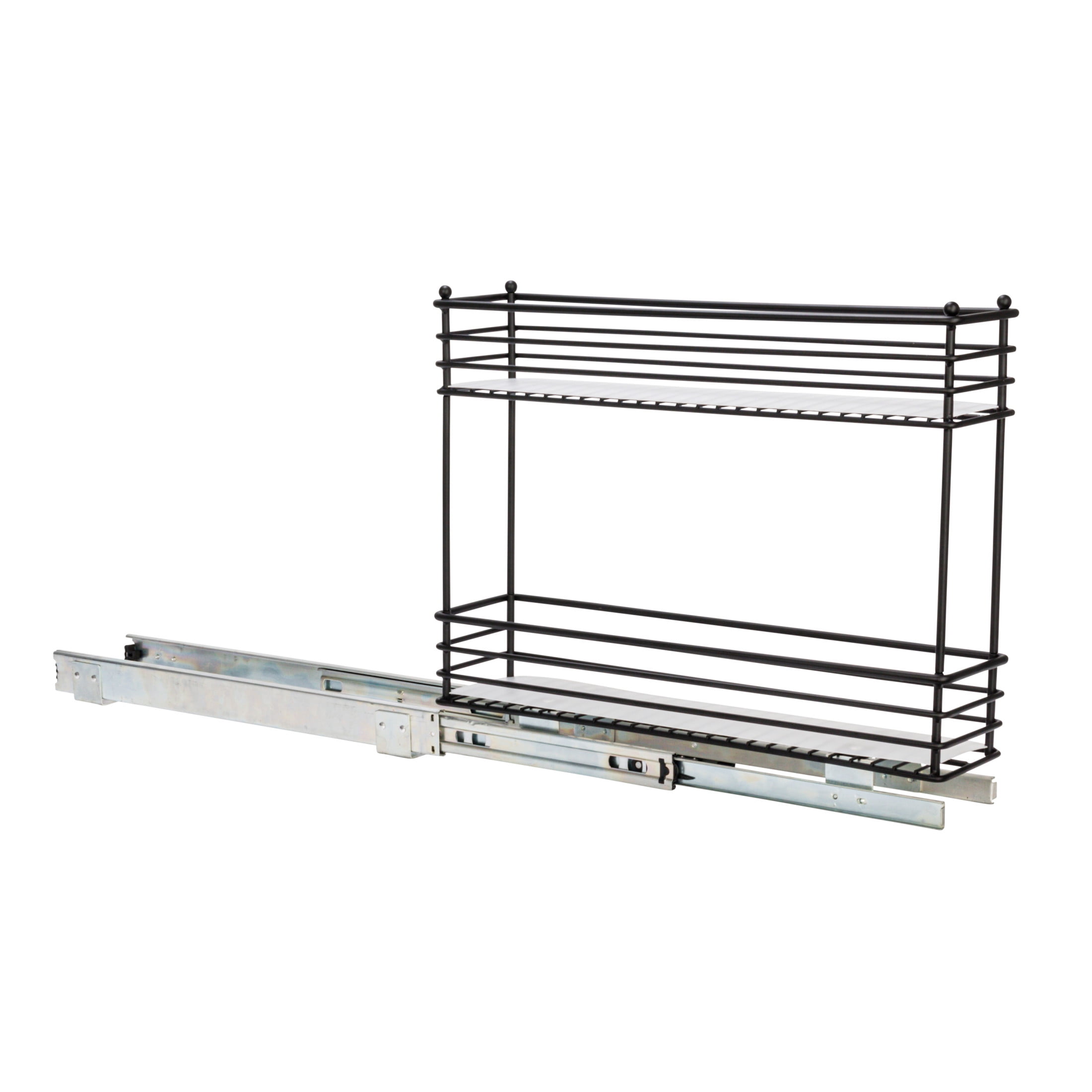 This cleverly designed, durable paint-finished steel organizer offers 2 tiers of storage space crafted to fit anything from cans and dry goods to cleaning essentials; Equipped with an easy-mount full-extension ball-bearing sliding base Compatible with most standard kitchen cabinetry; Designed to mount directly onto hard surfaces Maximum weight capacity of 33 pounds; Includes removable PEVA liners to help protect against leaks and spills Made from high quality steel with a durable powder paint coating; Simple installation (mounting hardware included) Organizer measures 21 inches D x 5 inches W x 17.5 inches H (See product images for detailed measurements)