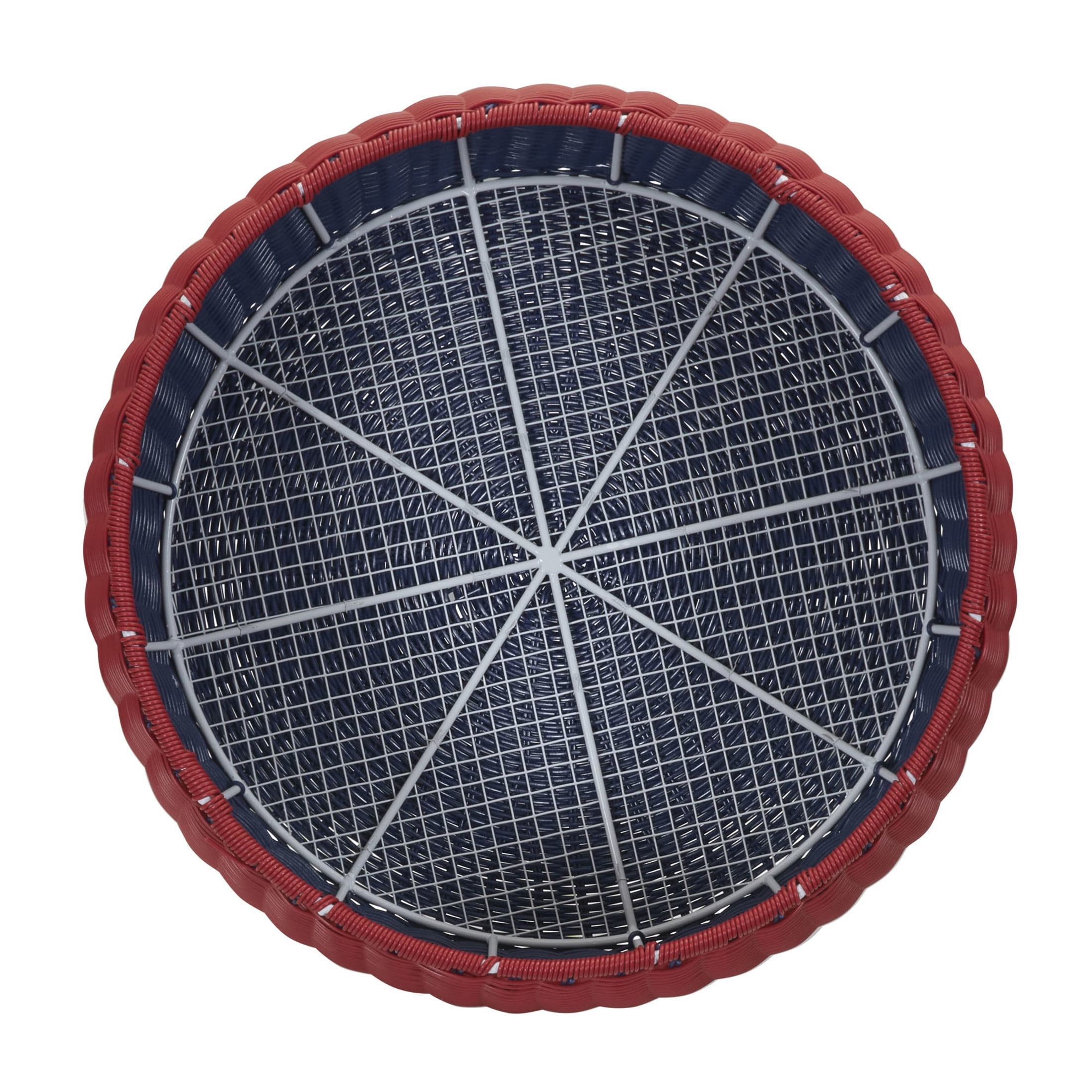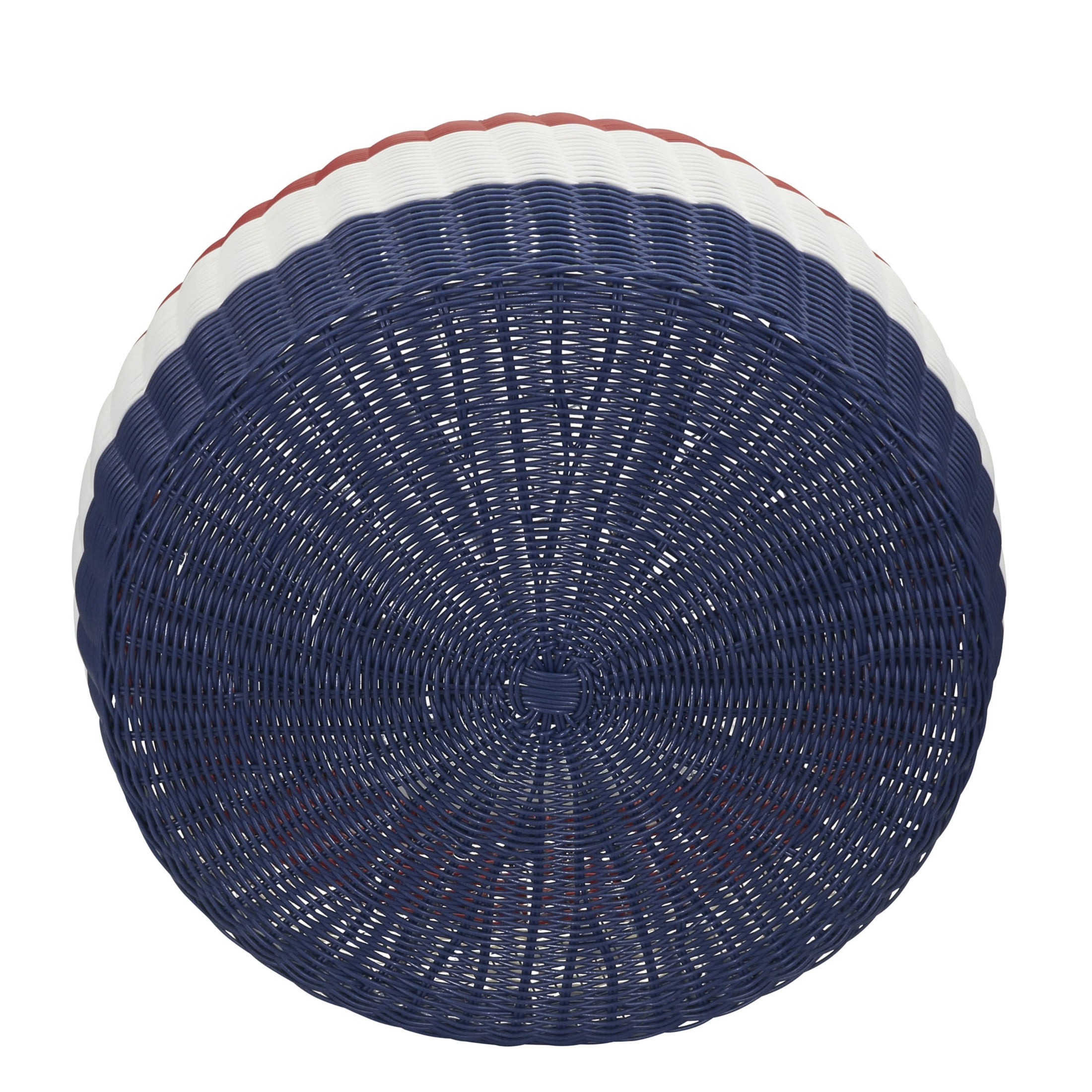Patriotic-themed low wicker ottoman perfect for indoor or outdoor use Flip upside down and use it as a handy storage container Metal frame wrapped in colored resin wicker Perfect as an ottoman, plant stand, coffee table, or storage compartment Measures: 9″ H x 18″ Dia.