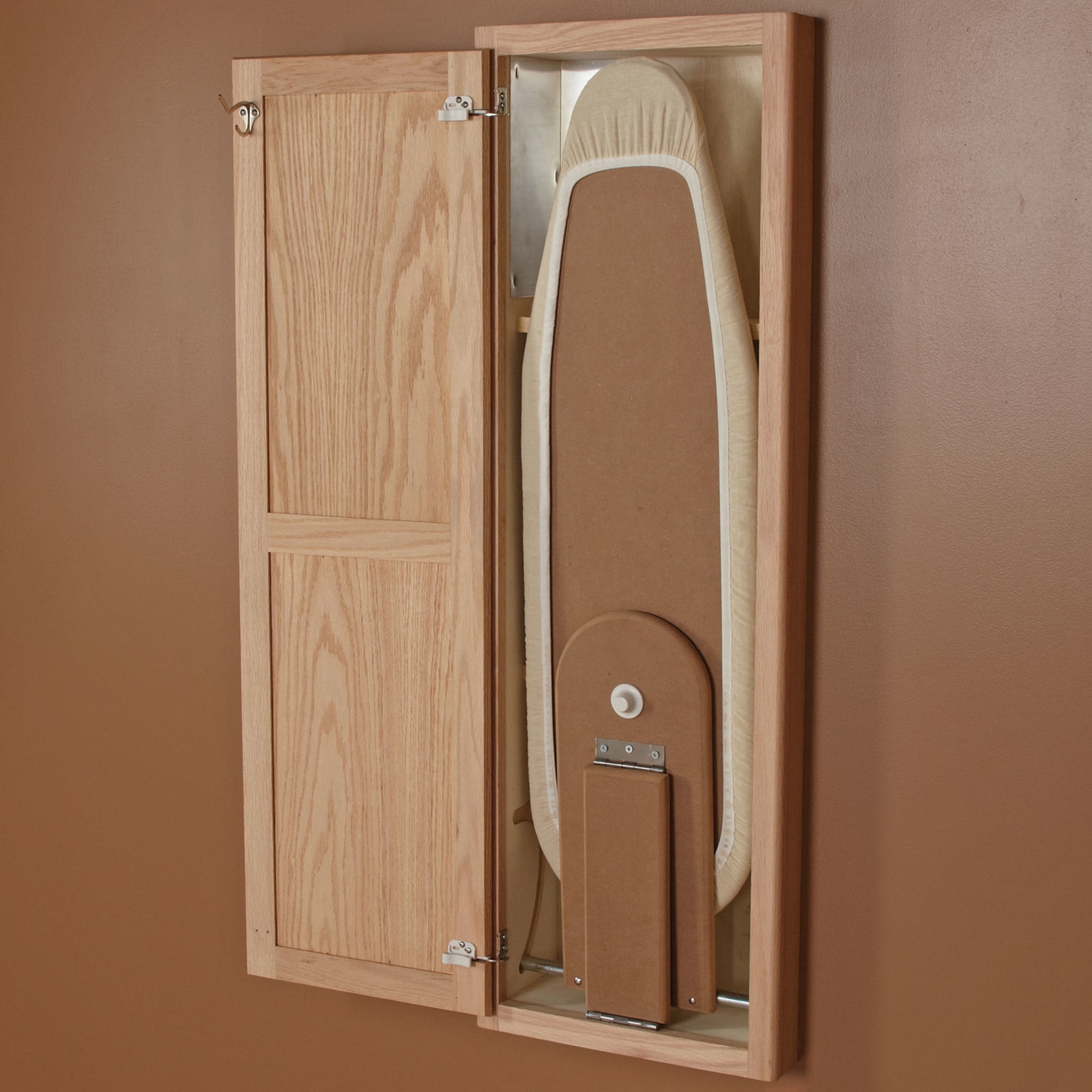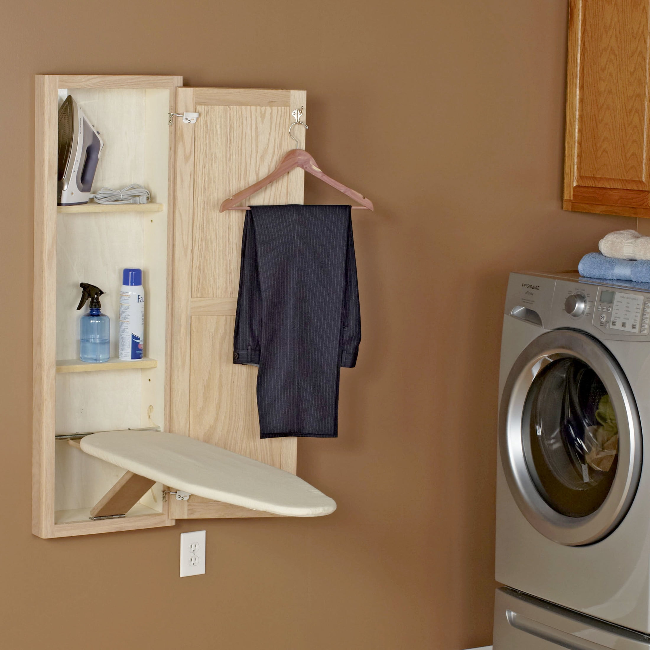 Add functional, space-saving storage and organization to any laundry room with this ironing board cabinet. Cabinet contains two storage shelves and an ironing board with a full 180 degree rotation and adjustable height. Install in a wall in the laundry room, bedroom, closet, or any other space in your home. Recessed cabinet is installed in-wall to provide the utmost stability and minimize the cabinet’s protrusion from the wall. 47.75” H x 15.75” W x 7.75” D when uninstalled; should be installed 3.5” deep into the wall Door can be installed opening right or left; Can be stained or painted to match existing cabinetry