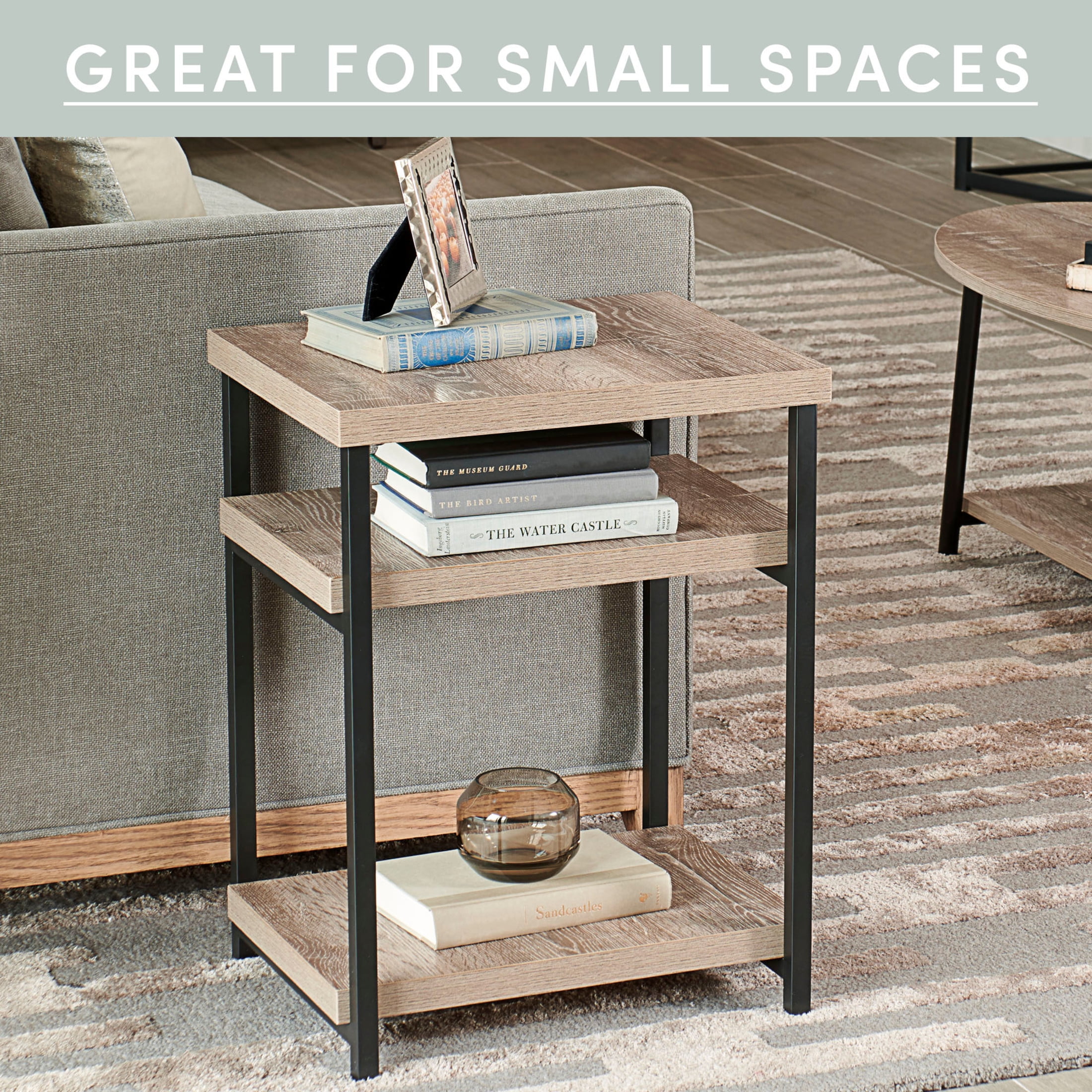 Functionality: This rectangular end table has 2 lower storage shelves to help keep your belongings organized. Use it as an end table or side table in your living room or a bedside nightstand in the bedroom. Designer’s Thoughts: The beauty of the Jamestown collection is its simplicity. Minimalist lines and a contemporary aesthetic make all the pieces in the series easy to fit into just about any style decor. And with a variety of matching tables and shelves to choose from this series has something for everyone. In the Ashwood finish the rustic slightly distressed wood grain with its subtle grey undertones can push the style into Farmhouse or even Western styles depending on what accessories you pair with it. Quality Materials and Construction: Durable steel legs and frame paired with high quality engineered wood finished in scratch resistant wood grain laminate. Good to Know: This table is also designed to double as a printer stand with the upper shelf serving as storage for reams of printer paper. 14.75″W x 23.75″H x 18″D