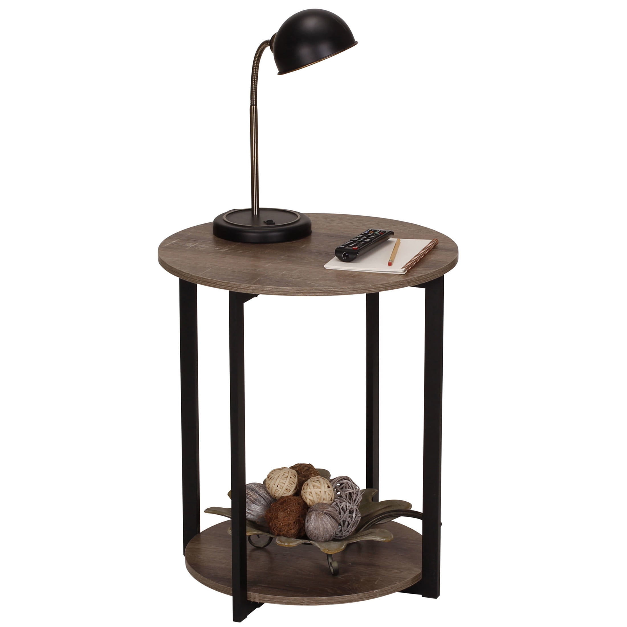 Household Essentials Jamestown Round Side End Table with Storage Shelf Ashwood Rustic Wood Grain and Black Metal