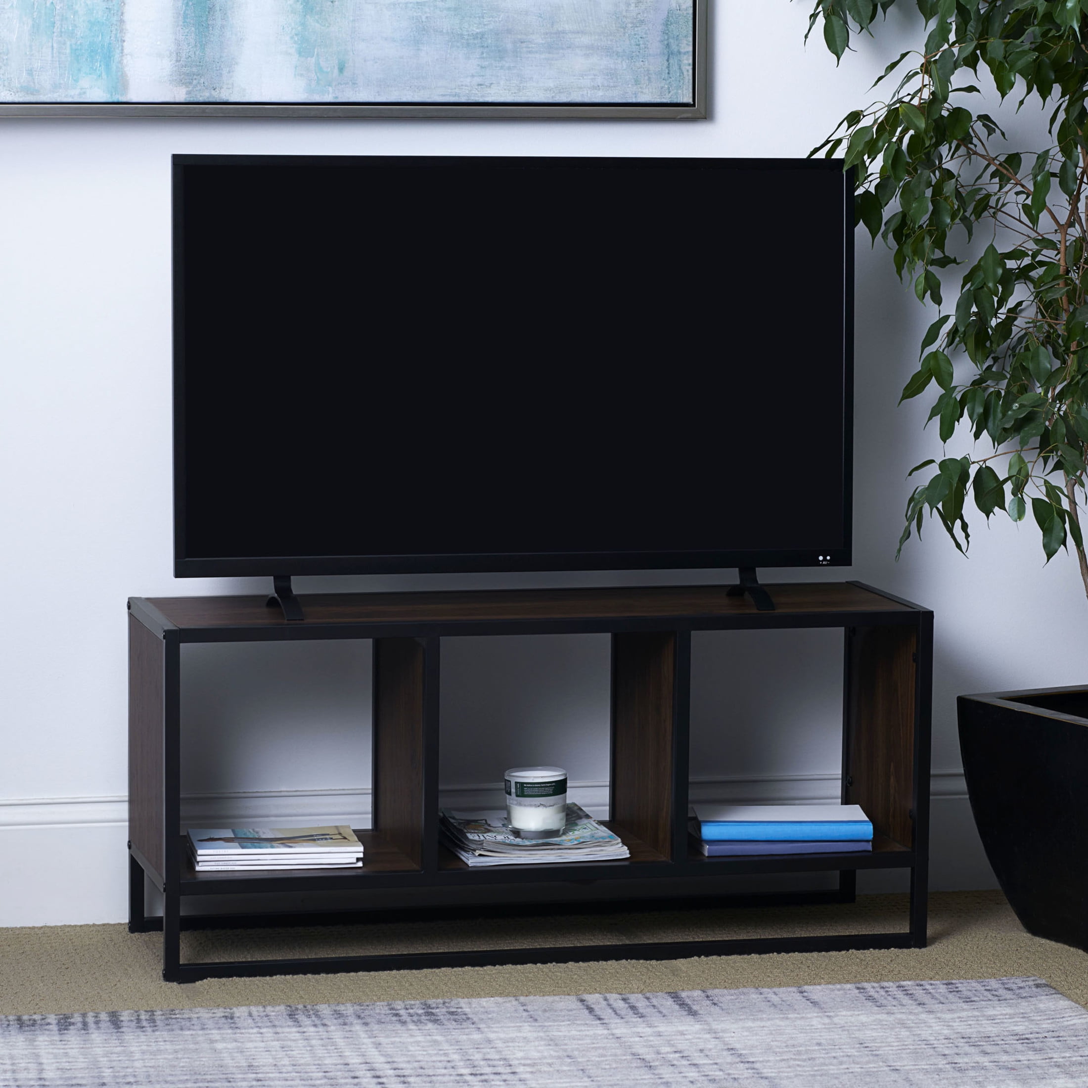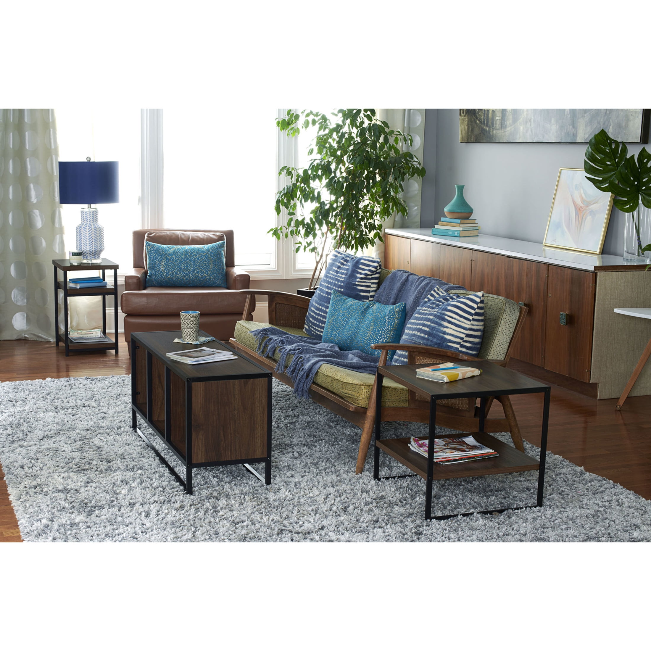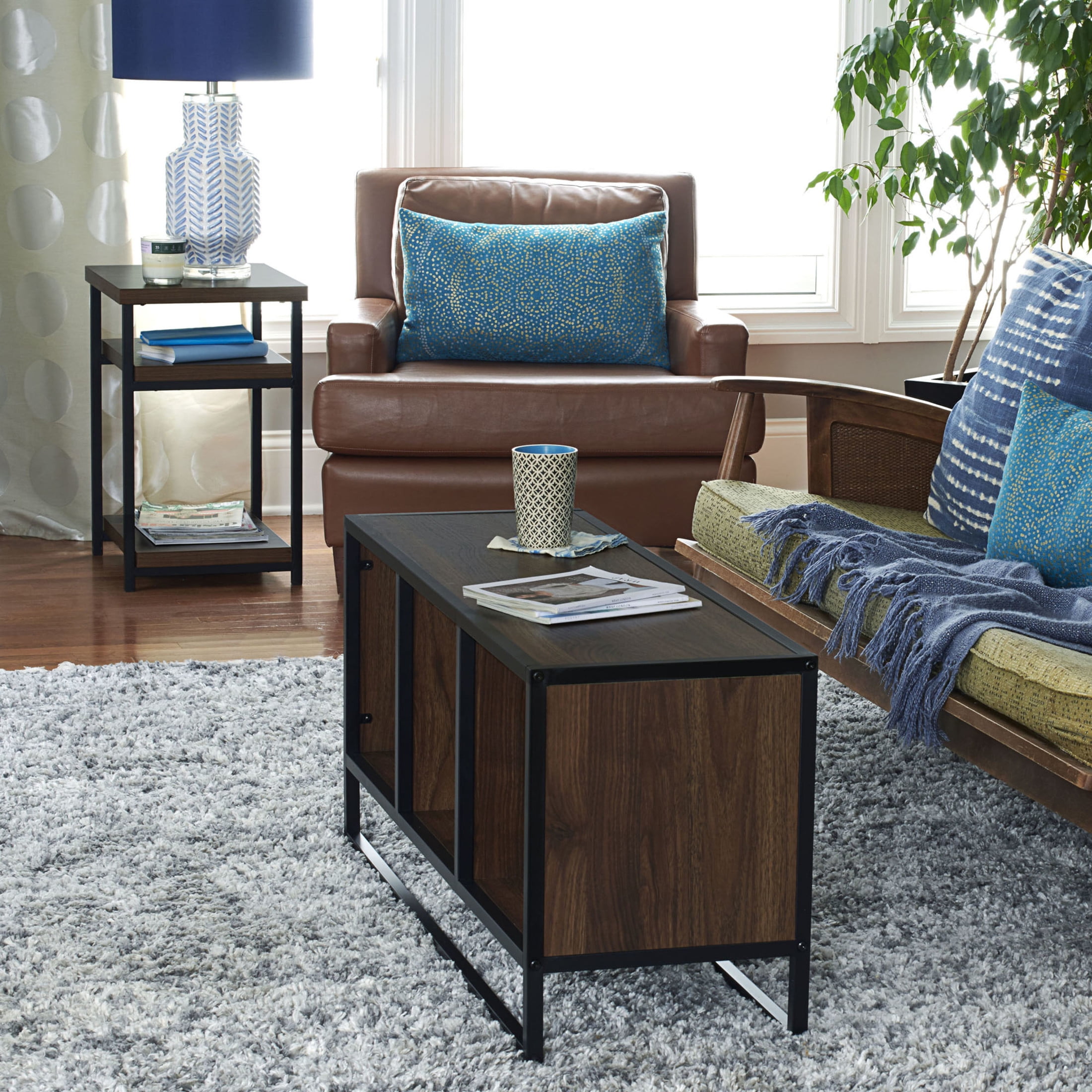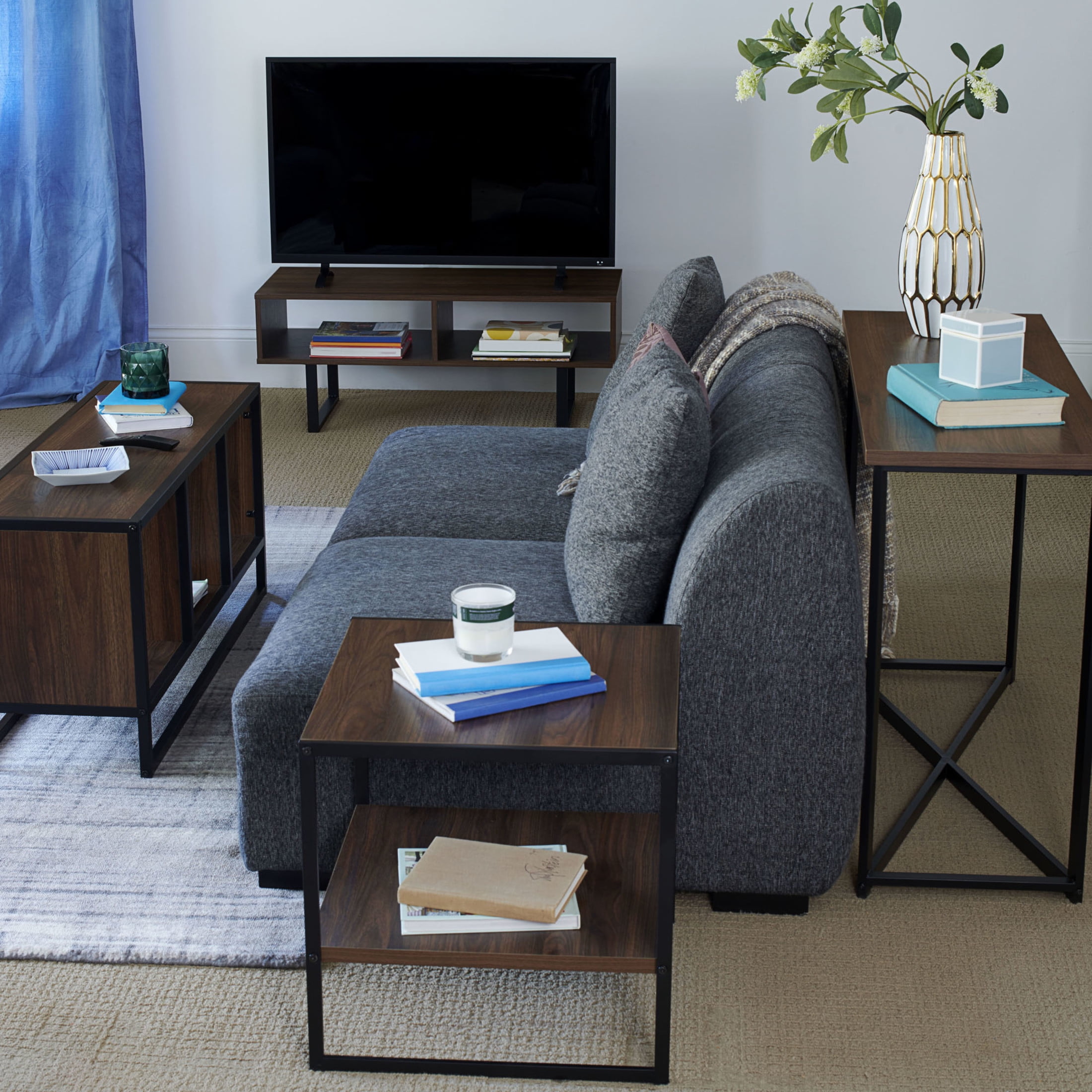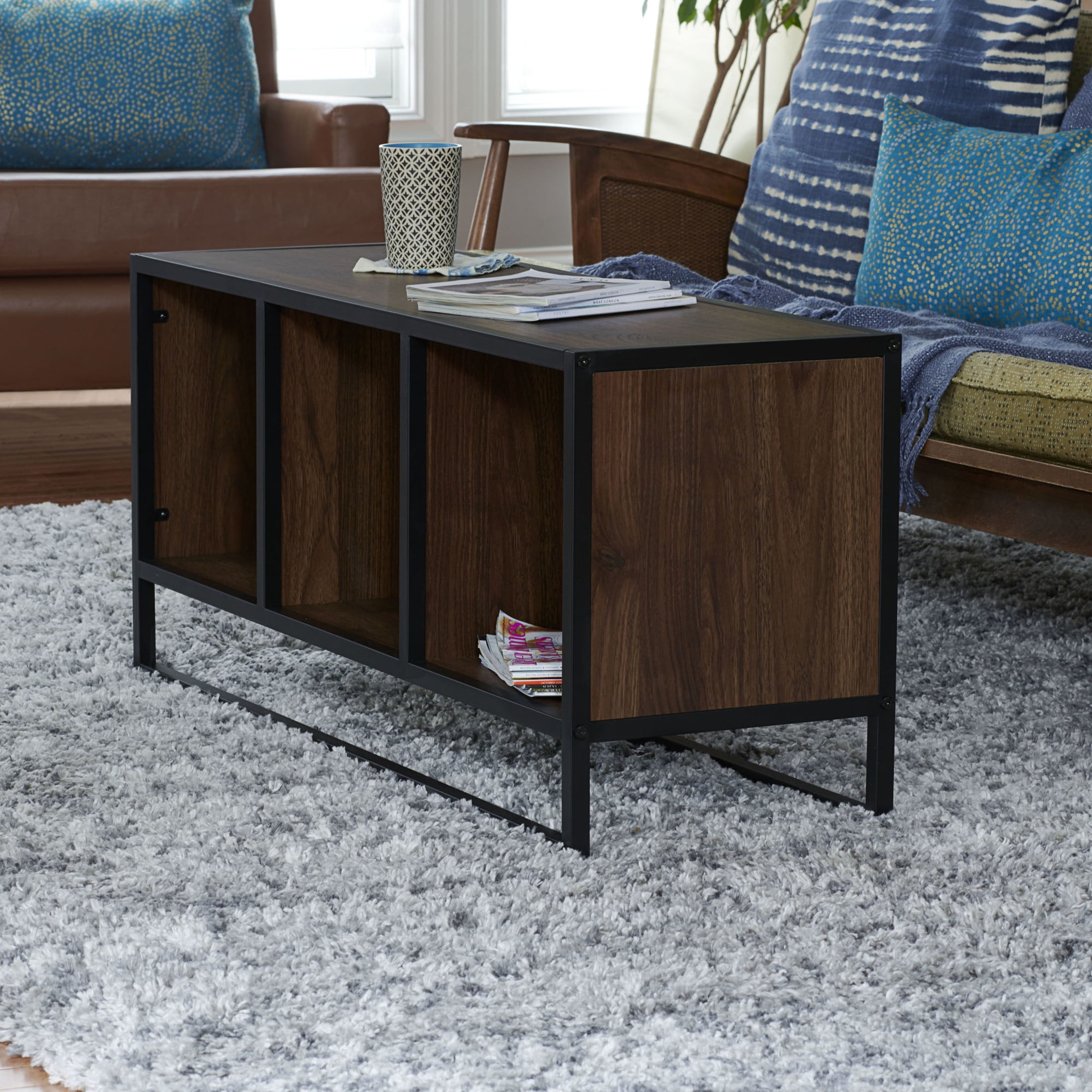Household Essentials Jamestown TV Stand Coffee Table with Square Cube Storage Compartments Mid Century Walnut Wood Grain and Black Metal