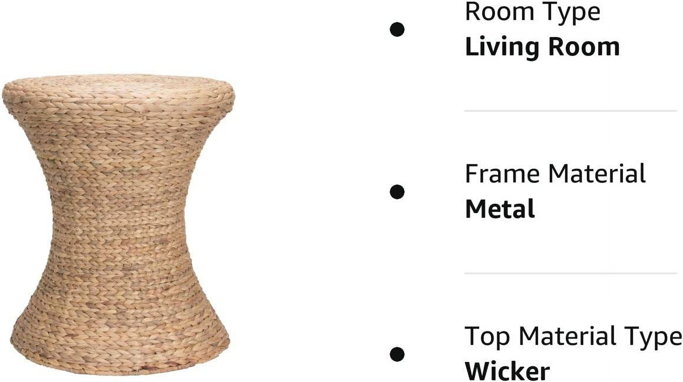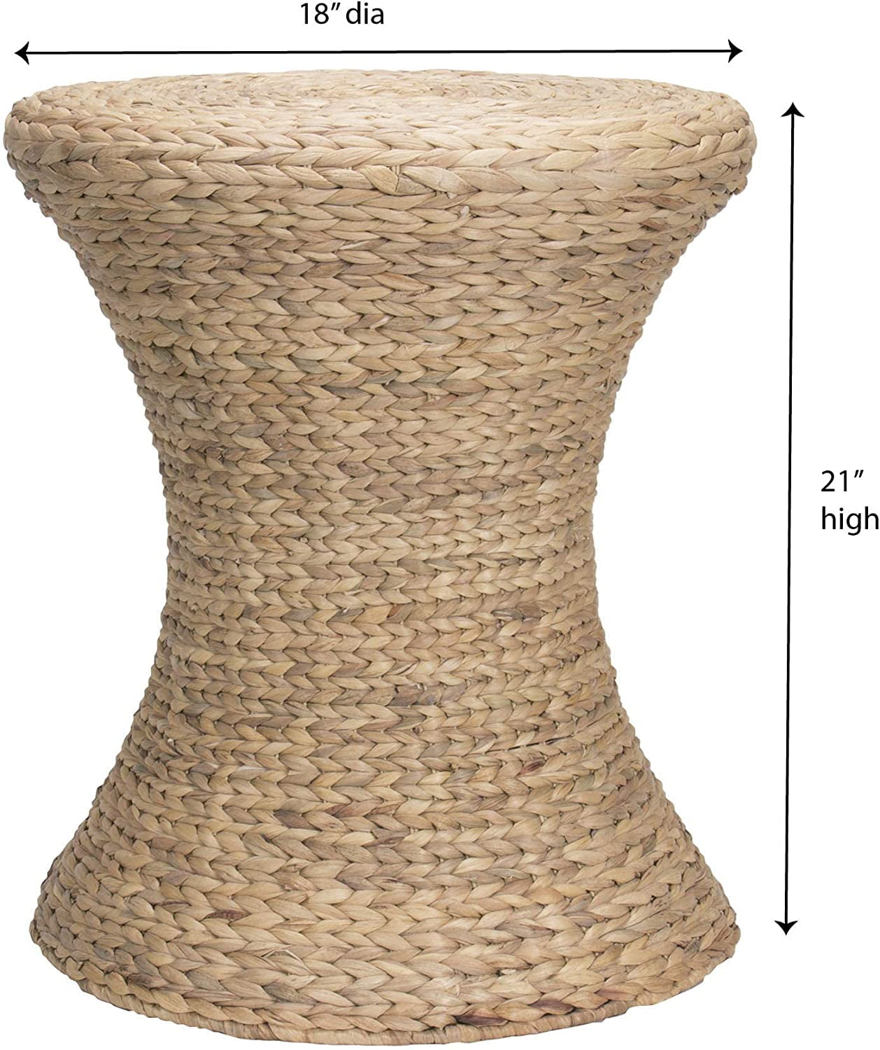 Its hourglass shape is stable and intriguing, for a quality upgrade to conventional end tables- Its the perfect height beside couches, chairs, and lounge furniture- This woven table is made from beautiful water hyacinth reeds, which wrap around a metal frame to create a thick, wide-braided weave-Versatile and beautiful, it multitasks for you- Use it as an intriguing accent table or a seat- Or flip it over to store fleece throws for winter or use it as a hamper Perfect for dorm room and apartments, where versatility and is key-Features- Stylish wicker hourglass accent table- Versatile, lightweight design- Thick water hyacinth reeds woven into braided wicker- Metal frame for structural support that maintains the baskets shape over time- Primarily for indoor use; can be used outdoors in covered spaces- Color – Natural- Dimensions – 21 H x 18 W x 18 D in- SKU: RTL331479