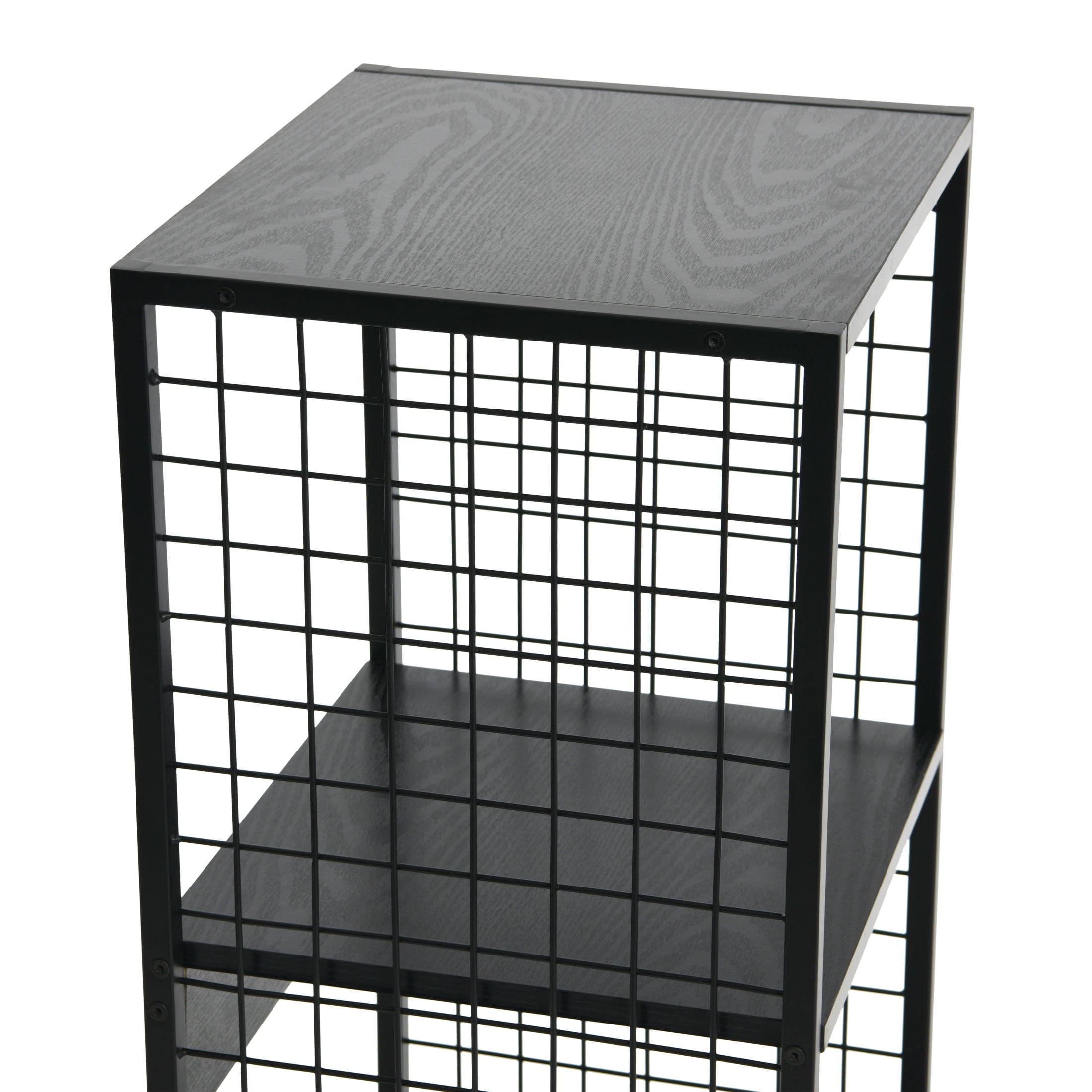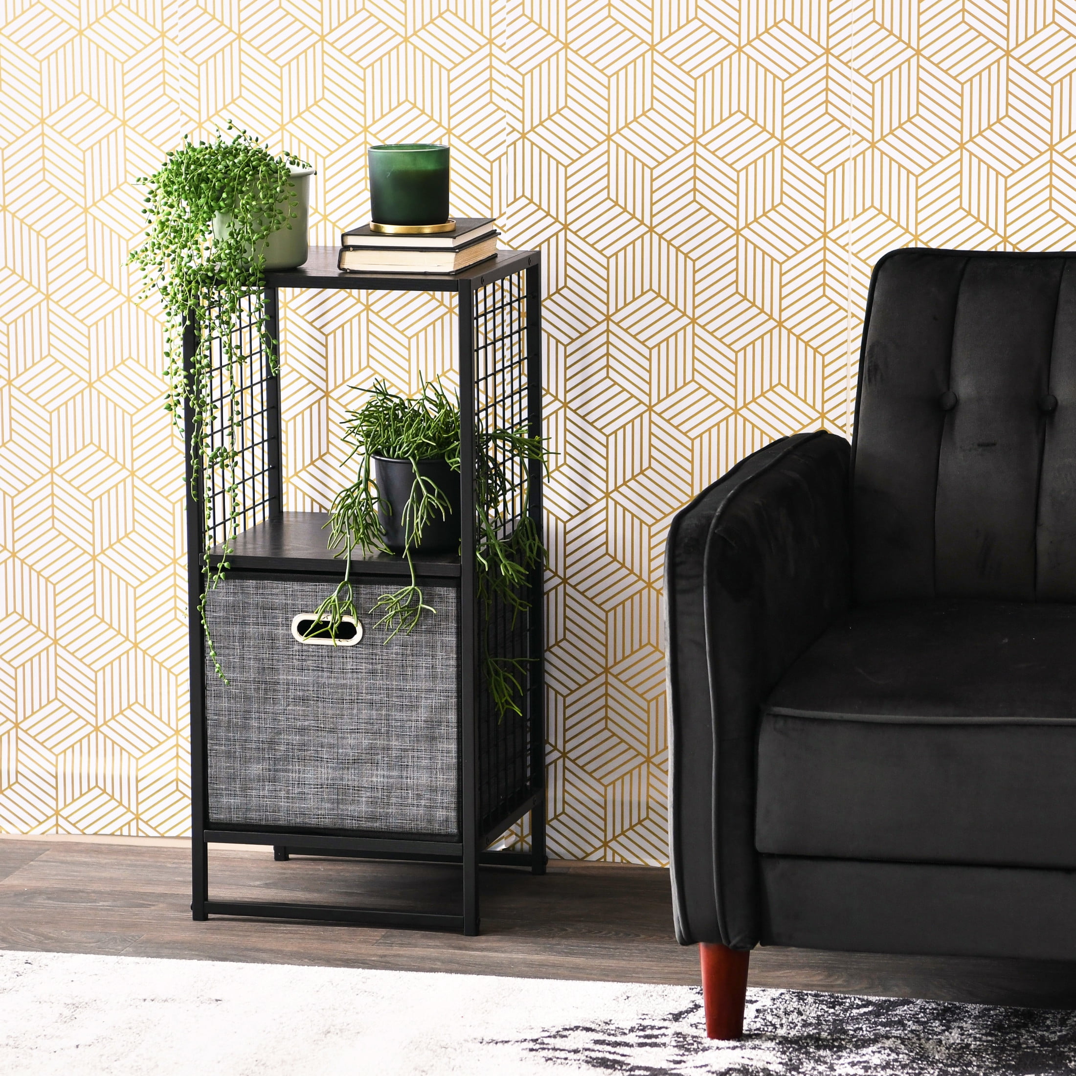 Functionality: This bookshelf cube storage organizer has 2 square shelf compartments that are perfectly sized for a variety of standard cube baskets, boxes, or toy storage bins, and are a perfect fit for LP records. It can also be used as a side table or bedside nightstand to keep your living room or bedroom organized. Designer’s Thoughts: The goal of the Trellis series was to combine the popularity of cube storage with the trend of growing house plants. The wire mesh sides lets sunlight in and trailing vines out, but retains the very functional cube shape. In the Black Oak finish the style is very flexible, best utilized in Transitional style (that uniquely American sweet spot between Traditional and Modern), but the Black Oak can also serve as a solid base for Farmhouse style. Quality Materials and Construction: Durable steel legs and frame paired with high quality engineered wood finished in scratch resistant wood grain laminate. Good to Know: The wire mesh sides were designed as a trellis for house plants. 14.5″W x 28″H x 13.25″D