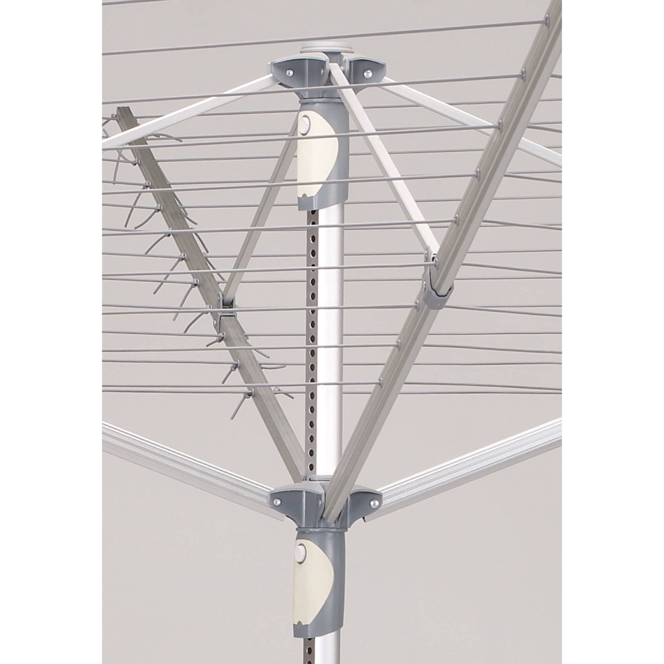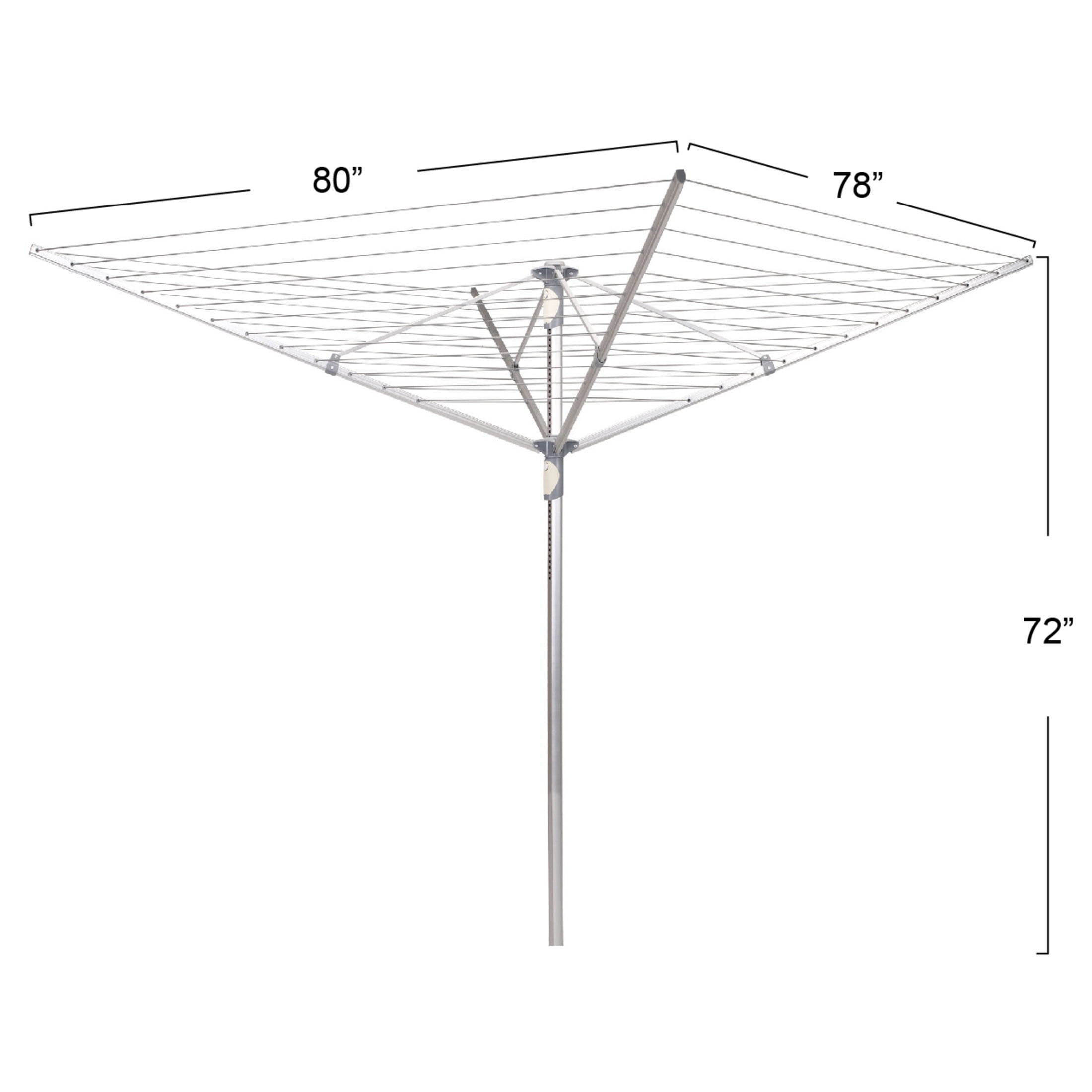 Umbrella clothesline offers a fast and reliable outdoor solution for any backyard or outdoor space. Built from sturdy and weather-proof aluminum for maximum durability and longevity. Complete with 192 feet of pre-strung vinyl line for maximum line space in a compact area. Folds down quickly and compactly for simple, convenient, and mess-free storage. 72” H x 78” W x 80” D High impact plastic post cap and slide resists wear over lifetime
