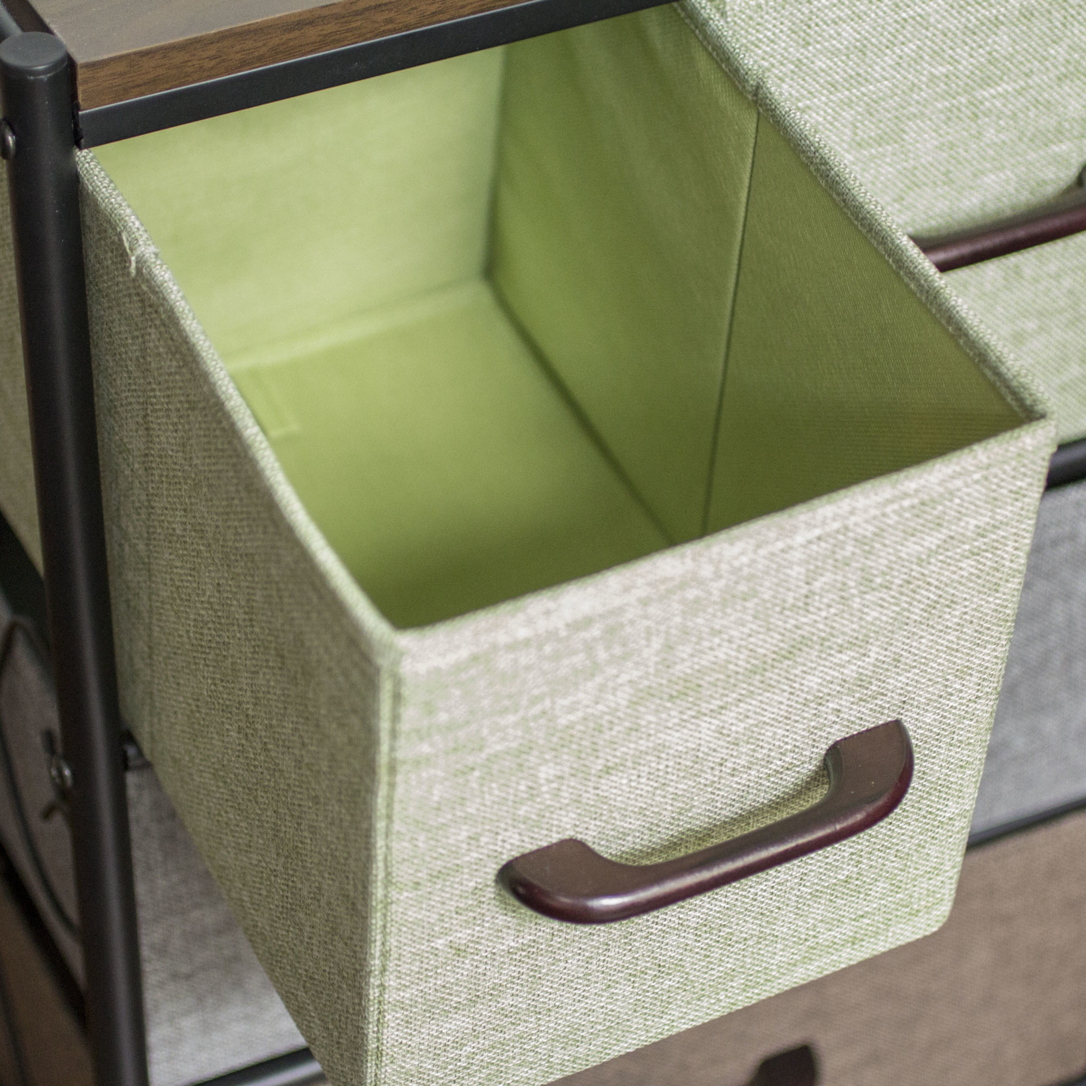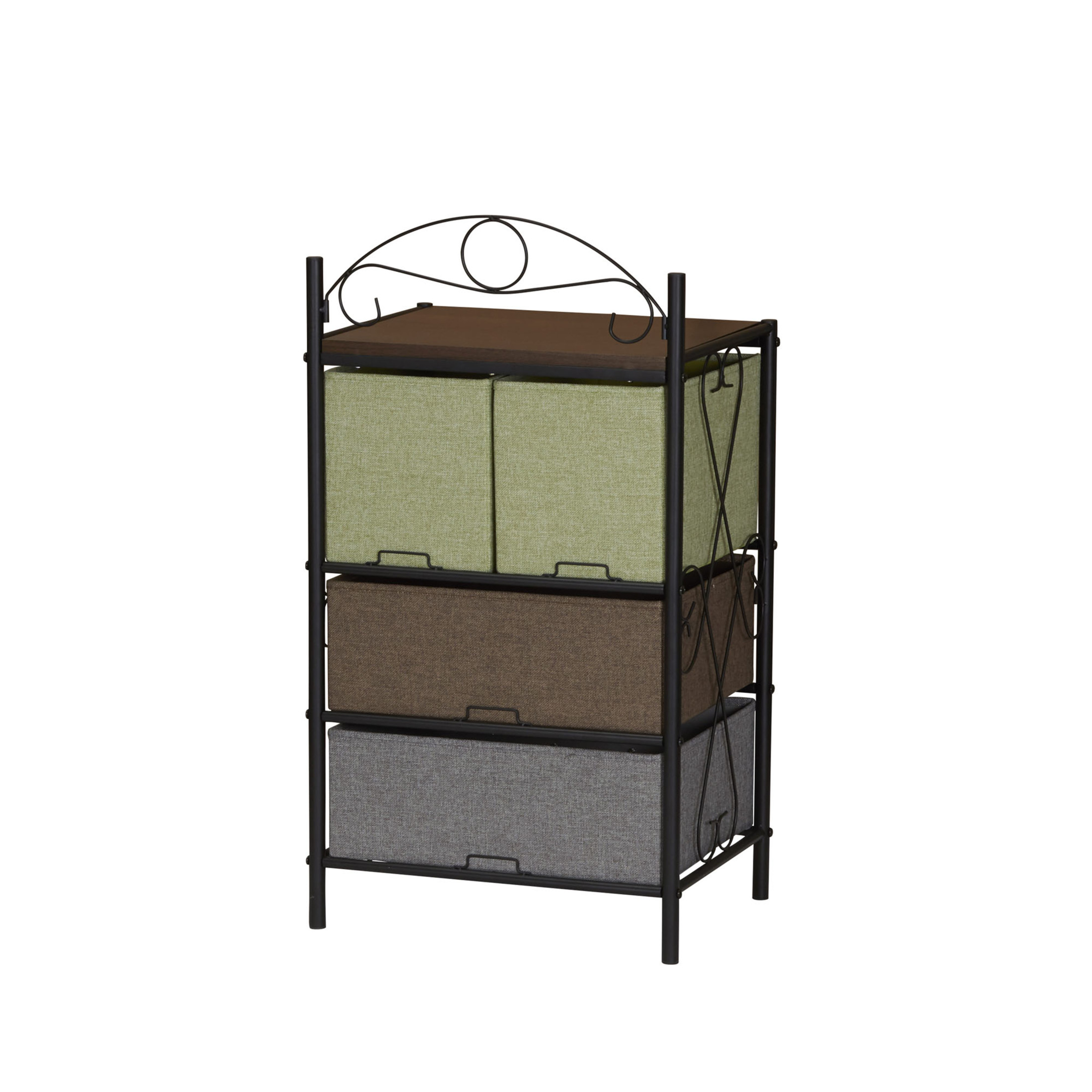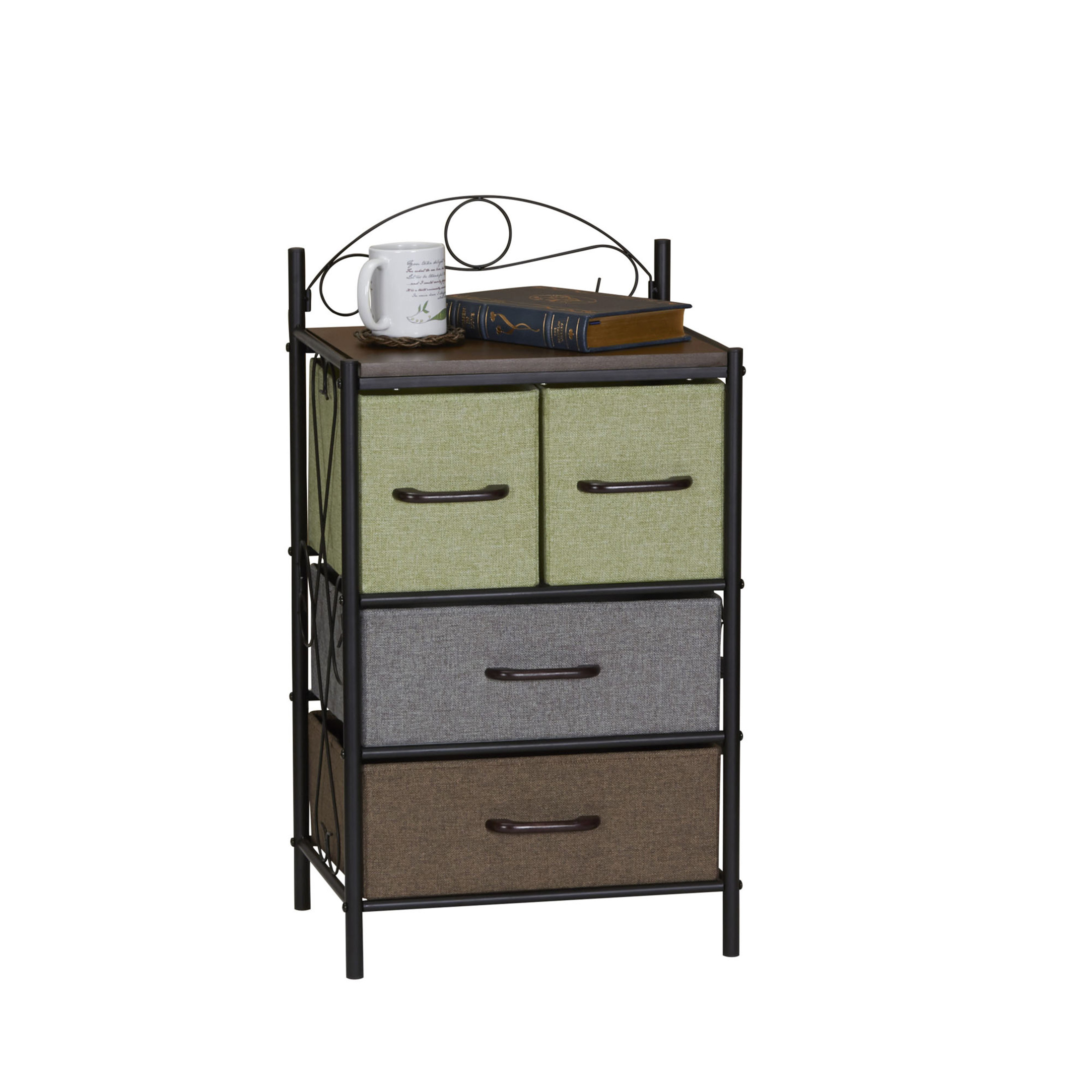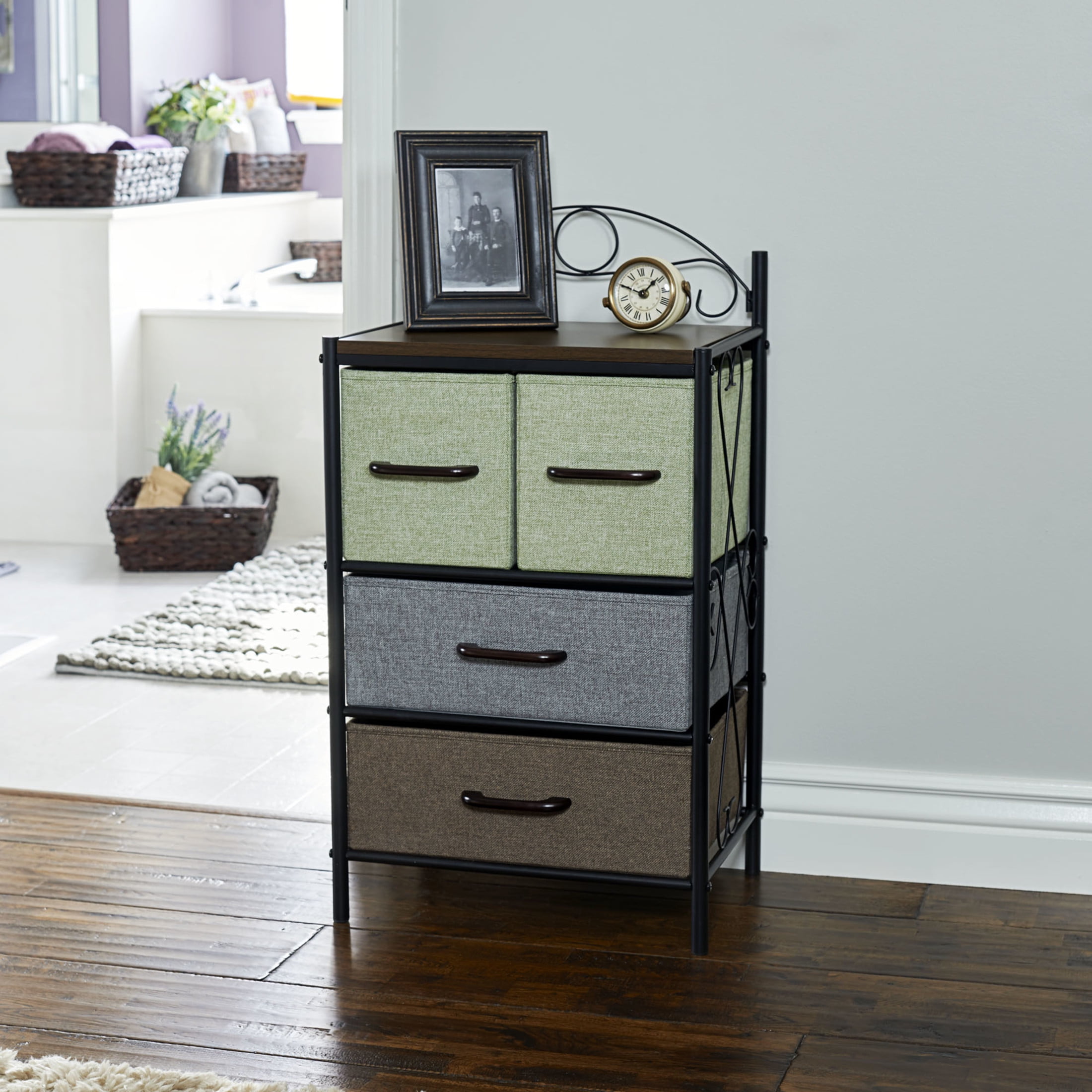 Functionality: This dresser nightstand organizer features 4 drawers to provide ample storage for a variety of personal items. Use it in the bedroom as a bedside dresser chest nightstand, or in the living room next to the couch to organize magazines and remote controls. Designer’s Thoughts: The Victoria series is a flexible storage series with a romantic feel. The decorative metal scrollwork on the sides and top hint at Victorian influences while the Walnut finish top and multicolor drawers make this piece fit well into Farmhouse, Vintage, Traditional, or even Western styles. Quality Materials and Construction: Durable steel legs and frame paired with high quality engineered wood finished in scratch resistant wood grain laminate, cloth drawers, and plastic handles. Good to Know: The decorative wire arch on the top is removable. 17.25″W x 31.75″H x 13″D Part of the HOUSEHOLD ESSENTIALS Victorian Collection