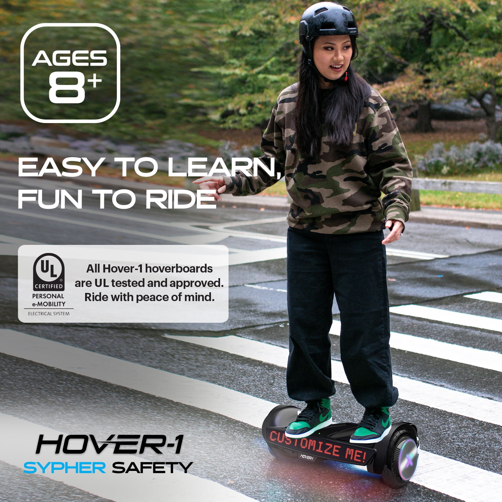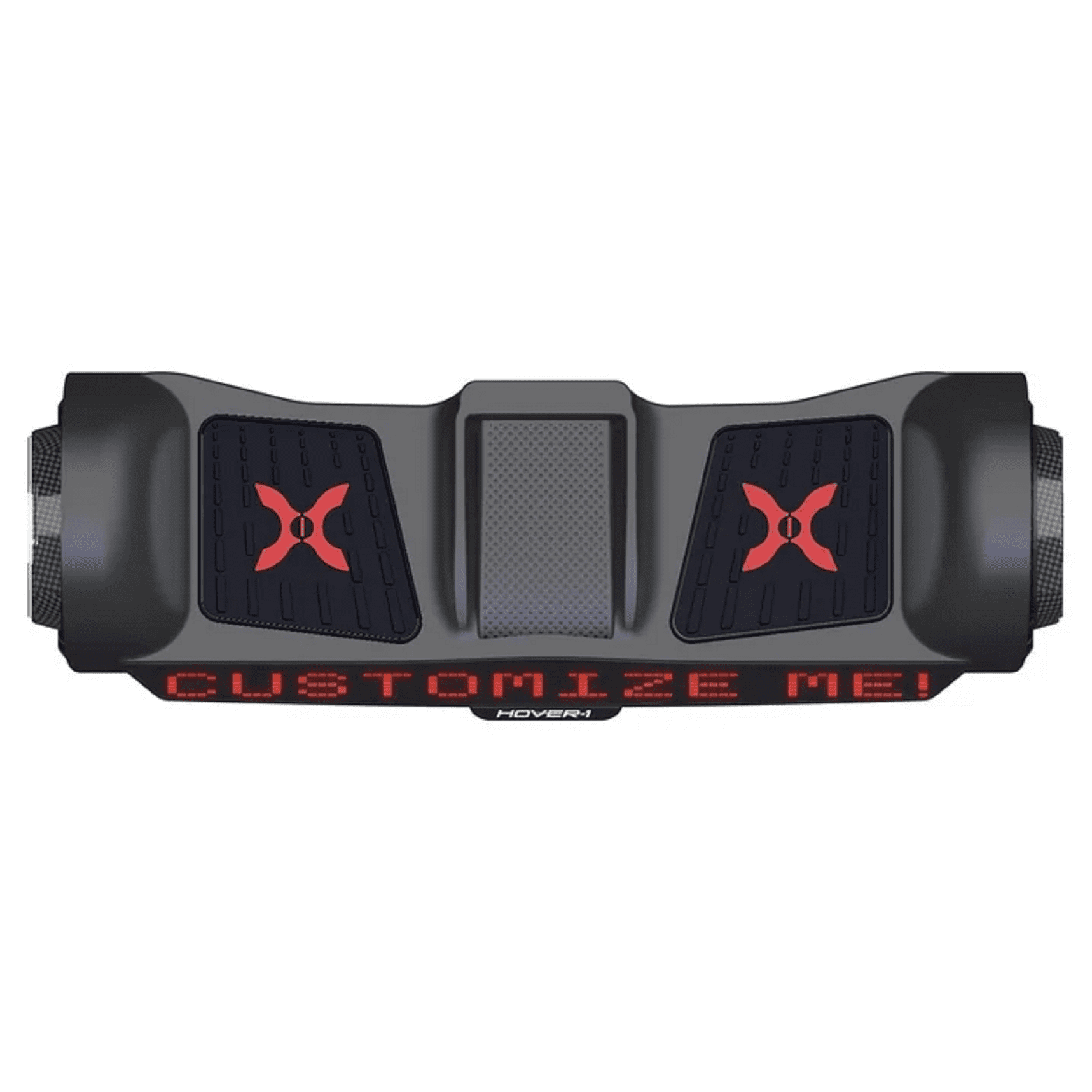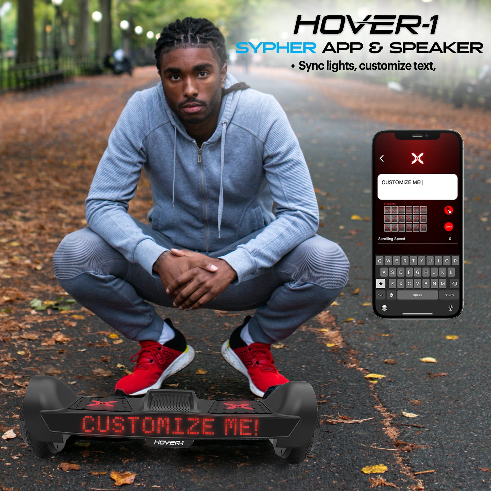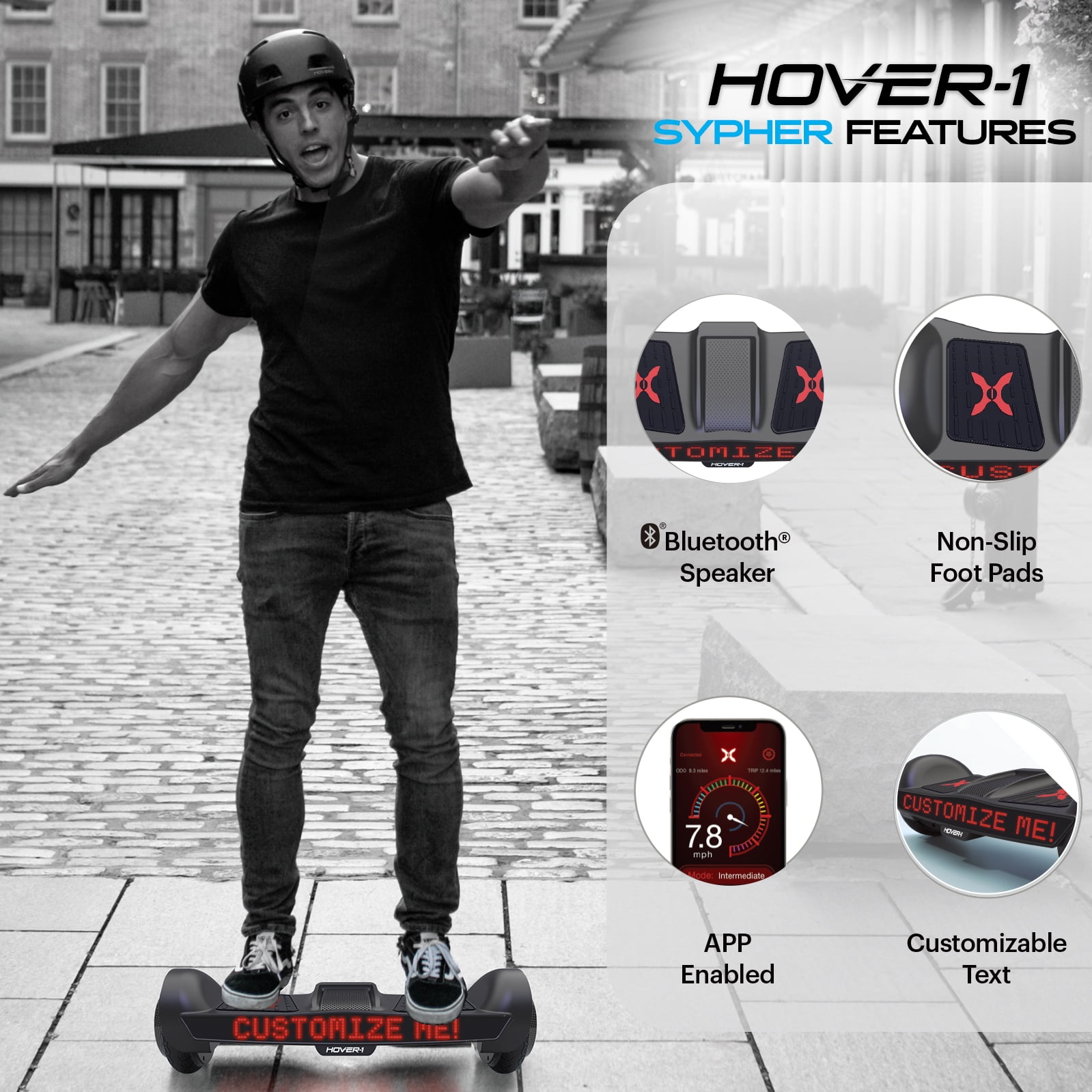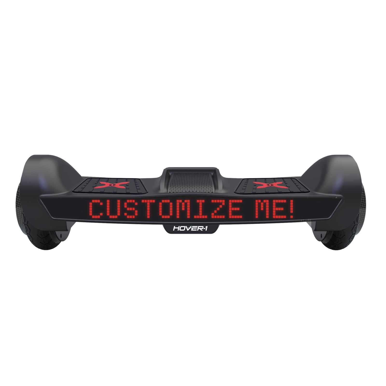 The LED wheel lighting, red accent colors, and sleek black paint job are sure to attract attention. You can even adjust the Sypher’ s sensitivity and top speed with 3 riding difficulty modes to suit your skill level. Sypher’ s built-in Bluetooth speaker plays incredibly crisp audio, so you can jam out to your favorite music while you ride. The possibilities are limitless with the customizable Hover-1 Sypher. Give the Hover-1 Sypher hoverboard your own personal touch. Using the Hover-1 Sypher app, you can display customized text and pictures on the large, front-facing screen that stretches the entire length of the hoverboard. Great for children & teens.