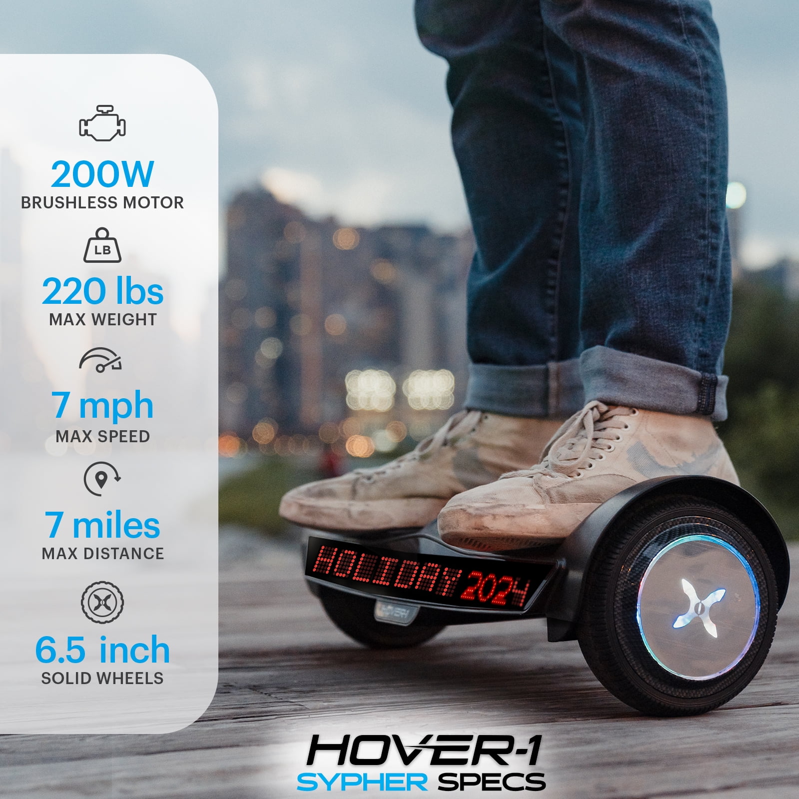 Hover-1 Sypher Hoverboard for teens & kids 7 mph max speed 220 lb max weight 7 miles max distance Light up LED wheels 6.5 inch solid wheels UL certified Recommended for ages 8+