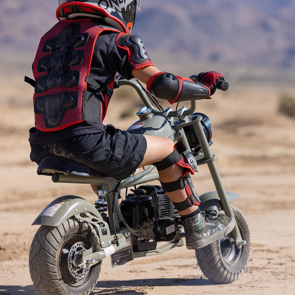 Key information: bike dimensions 49.21″L x 26.18″W x 29.53″H, Net weight 50.71lb, handle bar assembling required, Oil mix required( Read detail in Manual ), Rear Shock Absorber, Pull Start, Handle throttle, Pressure air tires. Fashion chopper bike, it is different, Rear Shock Absorber, Rear disc brake and big tank can more safe and play longer. Rider can experience the speed of it, but safety power with the 49.4 cc 2-stroke engine and fully automatic chain transmission system. Maximum speed will be 20 mph for this dirt bike Mini dirt bike provides easy pull start operations, and kids can start the 49cc dirt bike up easily. Low-pressure pneumatic tires provide soft & smooth ride. EPA Approved, it means the kid’s dirt bike will not cause unreasonable adverse effects in users’ health under the instruction manual, and it’s environmentally. Warranty: Seller provide 90 limited warranty, we have all parts and repair supports, we are in california, please free free to contact us if any question.