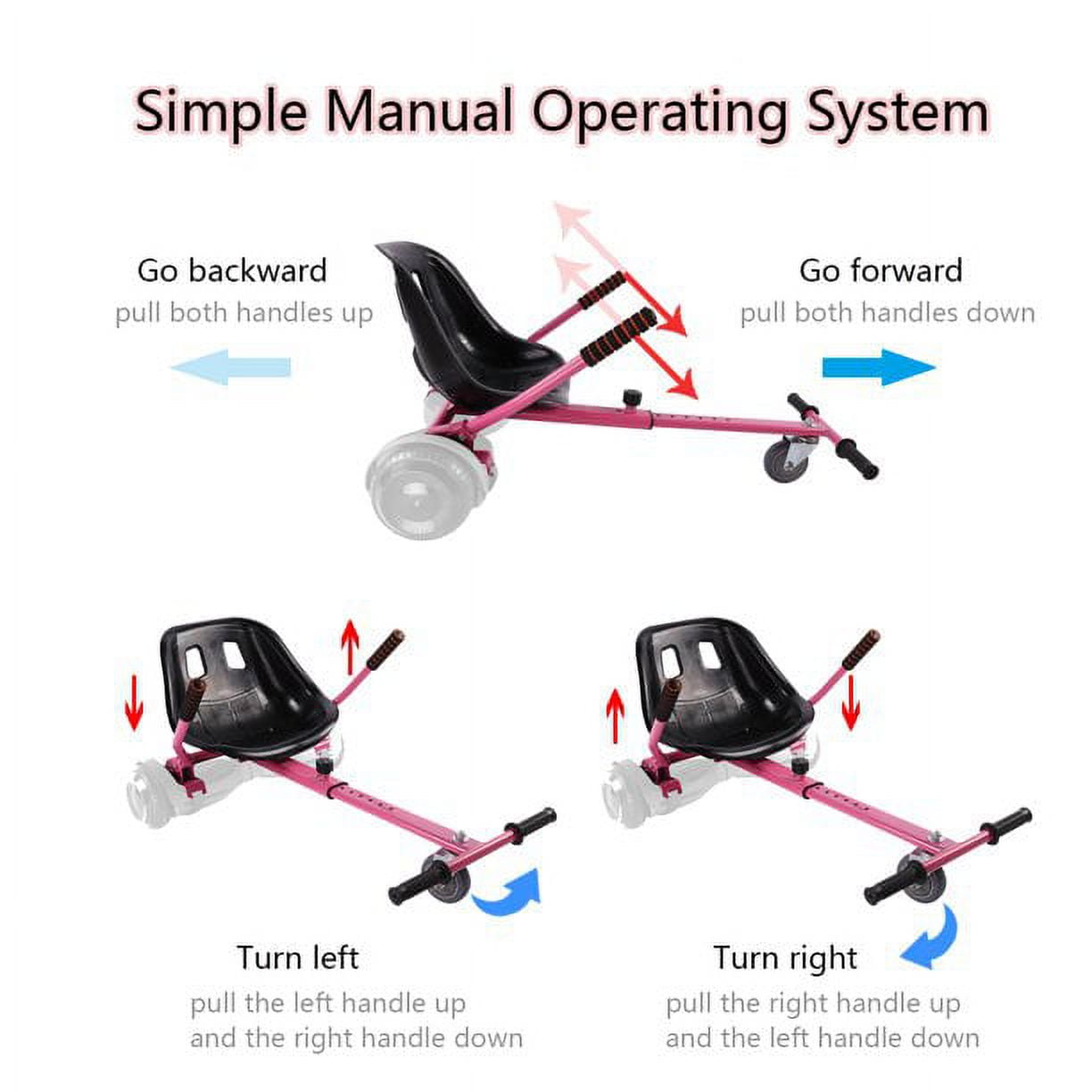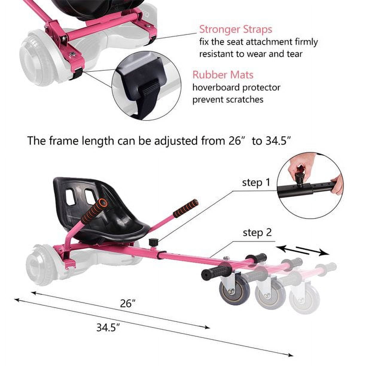 【SAFE & COMFORTABLE】- Use our seat attachment to transform your hoverboard into a go-kart. Kids can comfortably sit on the hoverboard instead of standing on it, which is more stable and safer. No more worries about kids falling down and getting injured. Made in comfortable shape, the thickened, reinforced seat bears 200lbs weight, big enough for kids and adults. 【STURDY ADJUSTABLE FRAME】- Made of heavy duty metal material and well welded, the frame can bear 242 lbs weight. There are 8 holes on the frame to provide different lengths. By rotating knob, the hoverboard seat attachment can be adjust from 26” to 34.5” length, suitable for any ages and any heights. The sturdy structure allows riders to drive on various terrains like pavements, road and grass. 【EASY TO STEER】- Armed with two soft foam-covered handlebars, the go-kart is easy for kids to learn and steer. The 360°front drifting wheel helps riders freely change directions ,while rear wheel drive allows quick turns and reverse driving. Kids can accelerate, brake and turn as they wish. 【SIMPLE ASSEMBLY & COMPATIBILITY】- After only 10-15 minutes assembly, kids can enjoy the exciting go-kart of their own. With stronger straps, the seat attachment can be firmly fixed on your hoverboards.The Rubber mats on the straps ensure your hoverboards don’t get scratched. Our hoverboard go-kart fits most 6.5”, 8” and 10” hoverboards but doesn’t fit hoverboards with a bar in the middle. Please make sure SCREWS ARE PROPERLY TIGHTENED. 【GIFT IDEA】- Riding a hoverboard go-kart is a healthy sport for kids and adults. By driving hoverboard go-karts with friends, kids will gain confidence, improve coordination and strengthen friendships. Adults also can enjoy it. Get away from any TV and digital games, take a hoverboard go-kart outside to have fun with your kids, family and friends. You will definitely be amazed at its charm!【hoverboard not included】