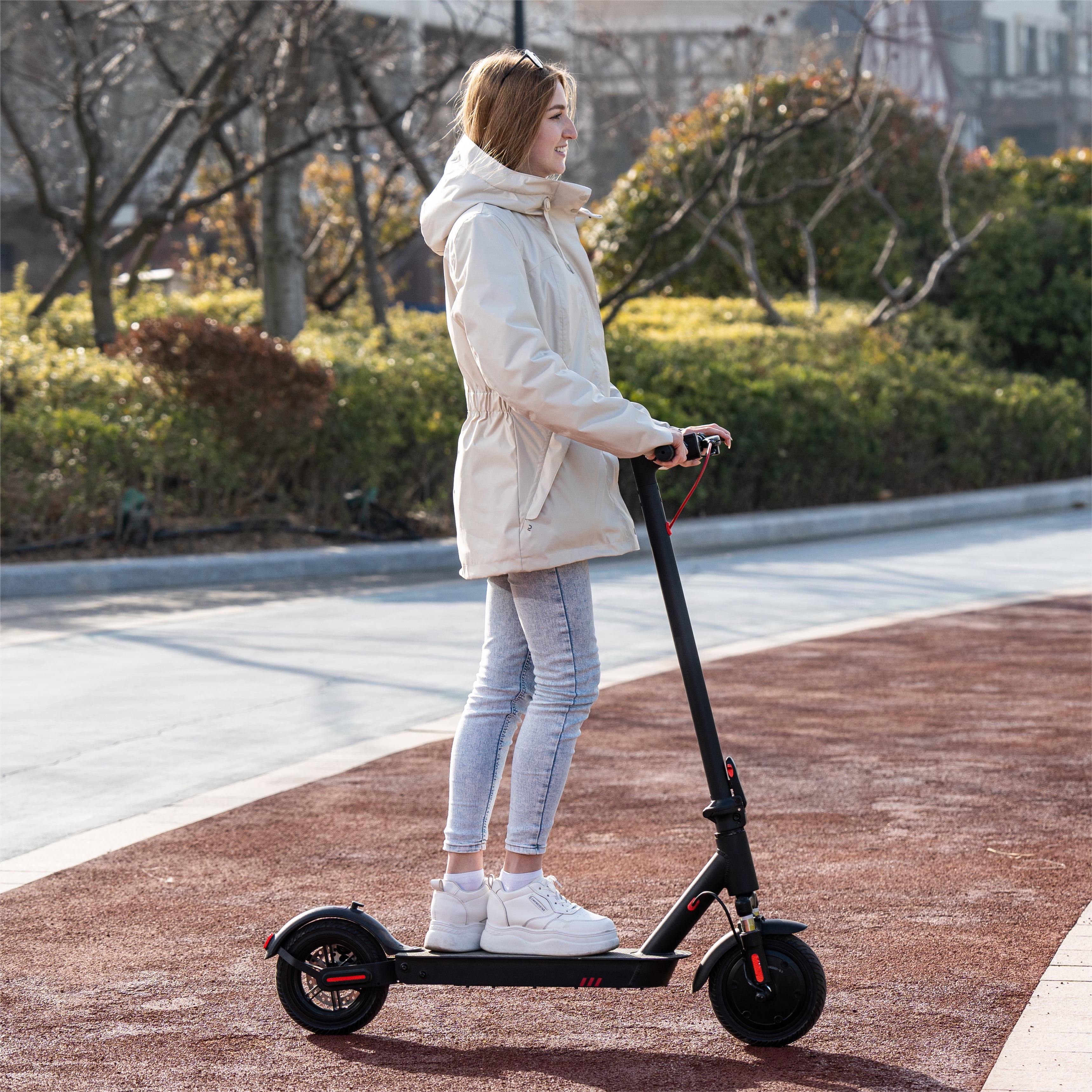 Powerful 350W Engine Max Speed 18.6 MPH Ultra-Long Battery Life: Up to 15-19 miles range Front Eletronic Brake + Back Disc Brake 8.5″ Solid Tires, Wear-resistant and comfortable Foldable & portable, folds up in 3 seconds & easy carrying Equipped with a ultra-bright headlight and brake taillight Smart APP control