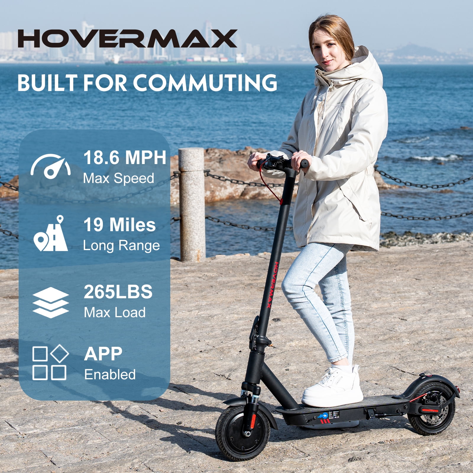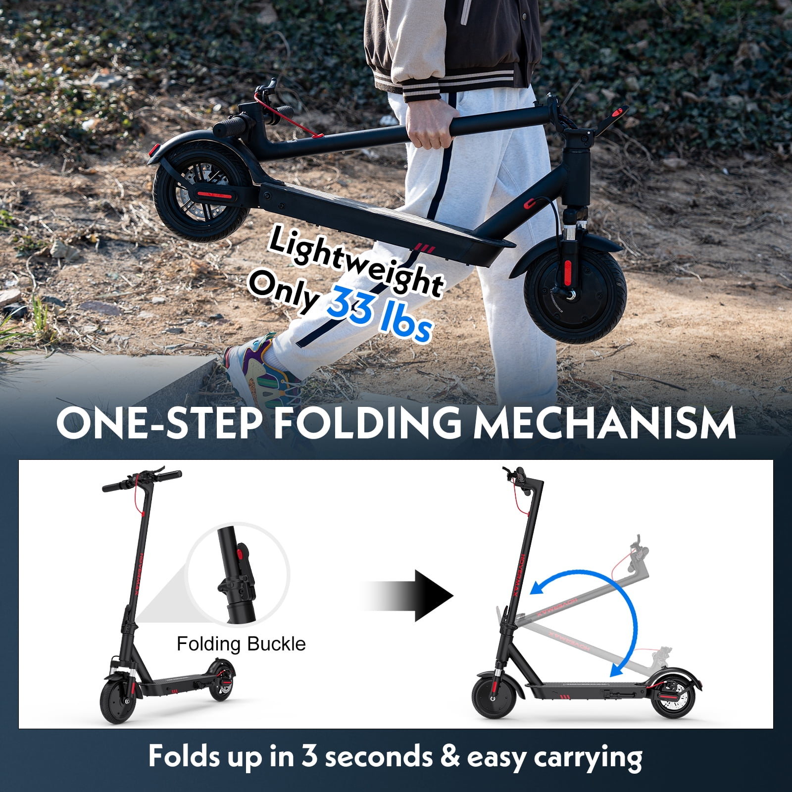Experience the exceptional features of the HOVERMAX H85F electric scooter! ✔ Powerful Motor: HOVERMAX H85F boasts a reliable 350W brushless front-drive motor for consistent power output and a top speed of 18.6MPH. ✔ Long-Lasting Battery: With a 36V 7.8Ah battery, this adult electric scooter covers 15-19 miles and charges fully in just 5-6 hours. ✔ Smooth Ride: Dual shock absorption systems ensure a smooth and secure ride on various terrains. ✔ Enhanced Safety: Features an ultra-bright headlight and brake taillight for confident riding in dark conditions. ✔ Convenient Folding: The one-step folding mechanism allows quick folding in 3 seconds for easy carrying. ✔ User-Friendly Display: The LED digital display simplifies operation, offering real-time information on speed, cruise control, battery level, and more. ✔ HOVERMAX H85F electric scooter- Ideal for commuters, students, or anyone in search of a cost-effective and high-performance electric scooter.