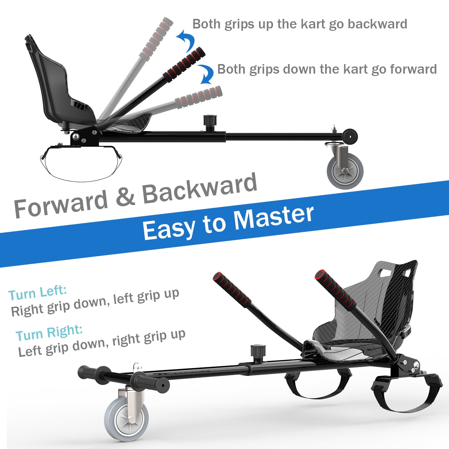 Easy to master & install Adjustable frame length Larger comfortable seat ensures riding comfort 360° flexible front wheel let you turn around freely Sturdy durable frame withstands bumps and hits Compatible with most Hoverboards with 6.5″, 8″ and 10″ tires Does not include hoverboard