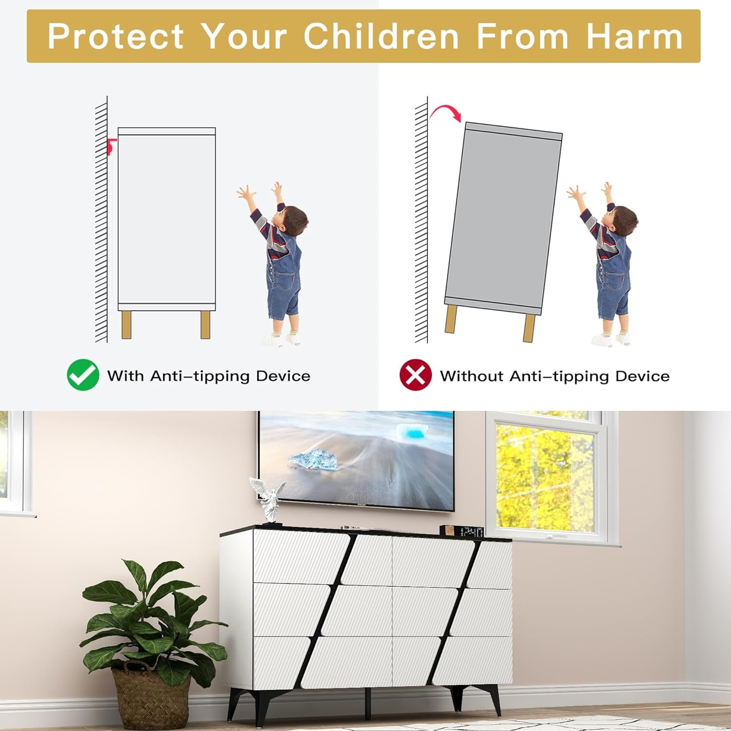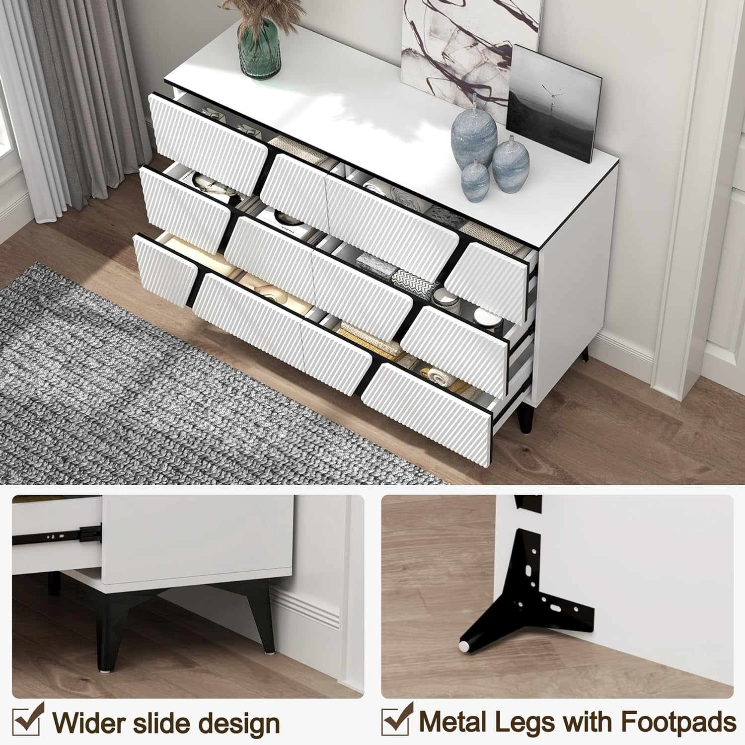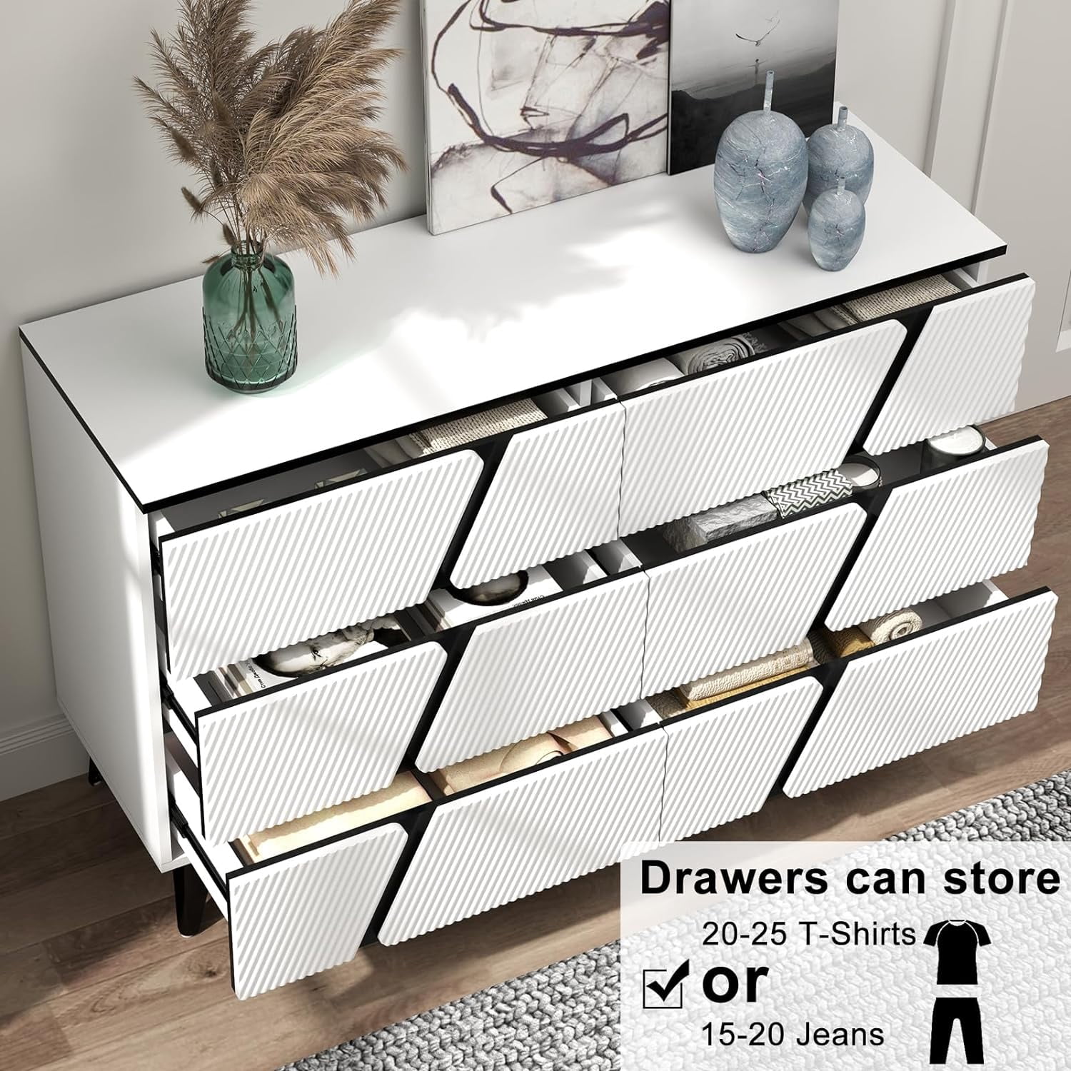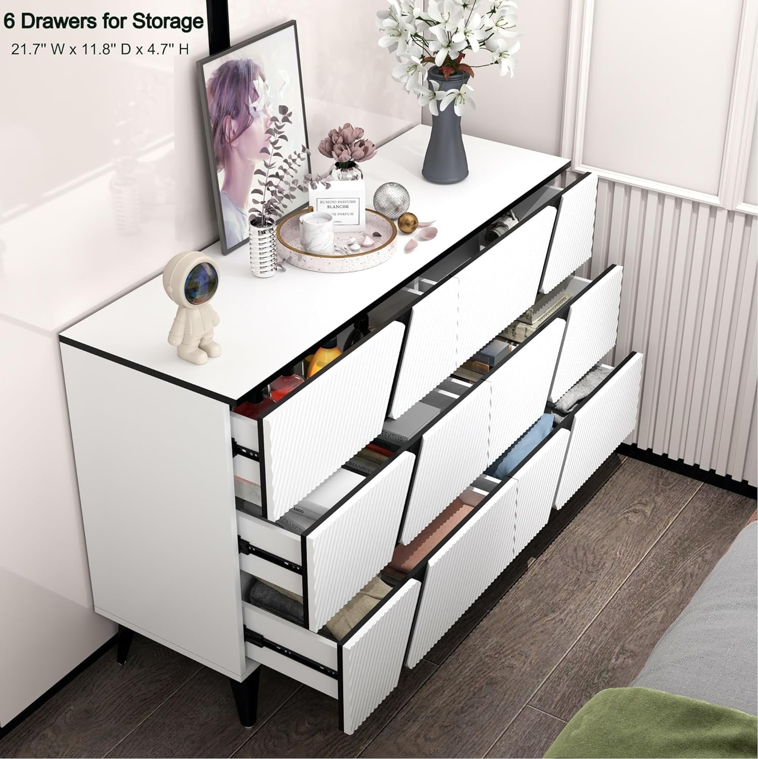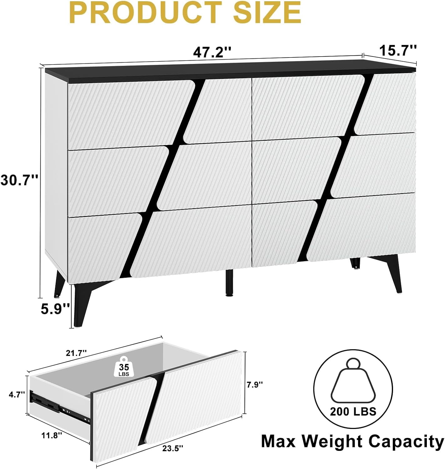 1.[Modern Fashion with Timeless Elegance] The overall surface of this white dresser features a unique diagonal pattern, giving it more texture and dimension. Meanwhile, the collision of white and black brings modern fashion and elegance to your bedroom. 2.[Multifunctional White Dresser] The white dresser with 6 drawers has external dimensions of 47.3”W x 15.7”D x 30.7”H. It comes with six large drawers, each measuring 21.7”W x 11.8”D x 4.7”H. Within these drawers, you can store clothes, cosmetics, jewelry, bedding, and more. The spacious tabletop can accommodate table lamps, decorative vases, and other items. Overall, it can effectively meet your storage needs. 3.[Textured, Stable, and Durable] This 6-drawer dresser is made of high-quality medium-density fiberboard. The surface of the dresser is crafted using advanced suction molding to create the diagonal pattern. Notably, the bottom of the white dresser is supported by sturdier metal legs with soft rubber pads, providing better load-bearing capacity and floor protection. 4.[Easy Assembly] Each component of our bedroom dresser comes with separate packaging and codes. Clear installation instructions allow you to immerse yourself in the game of assembling your own dresser. Two adults can complete this task within 1-2 hours. 5.[Multifunctional Usage] This drawer chest is ideal for use in various scenarios such as wardrobes, laundry rooms, bedrooms, living rooms, entrances, college offices, etc., making it the perfect choice for saving space and decorating your home.