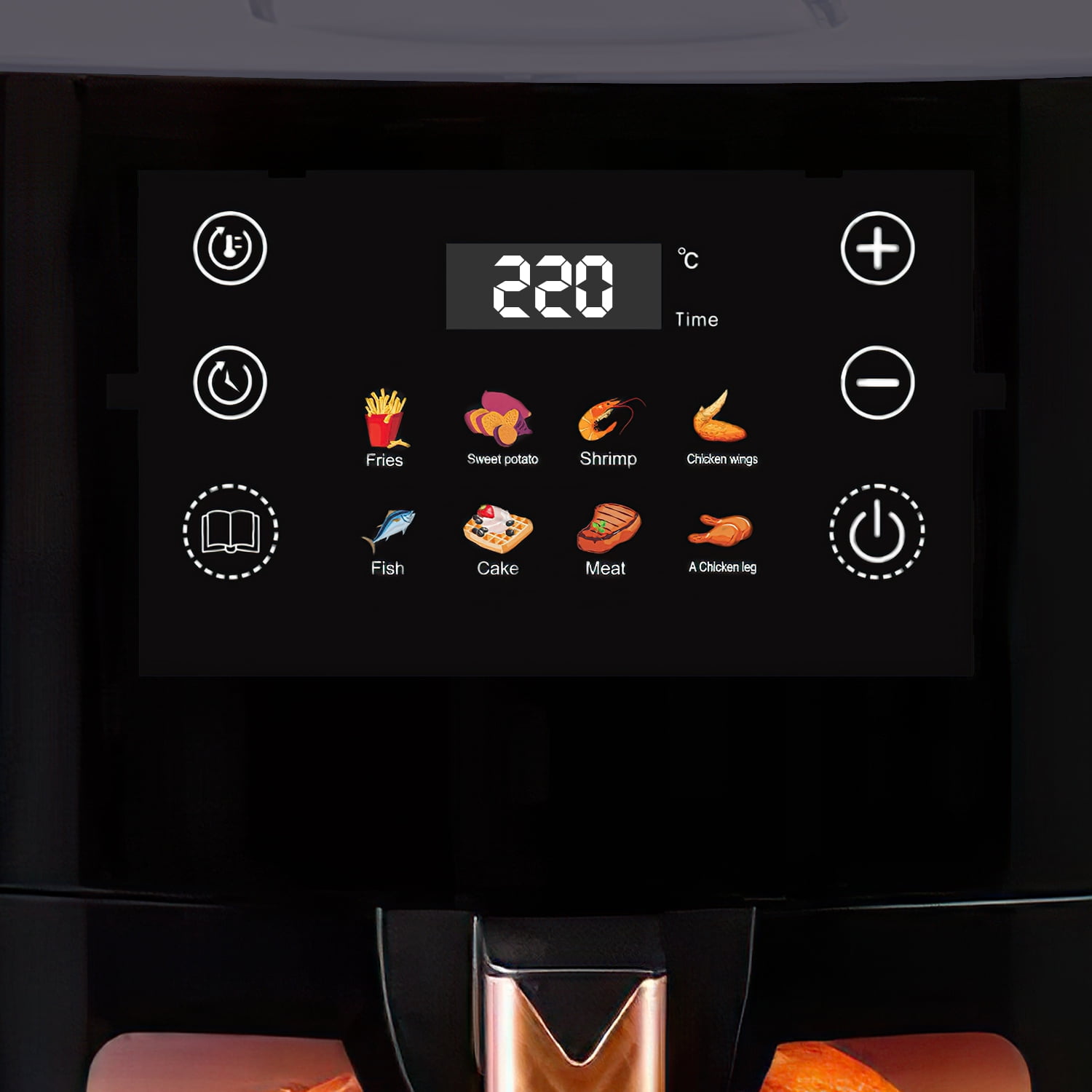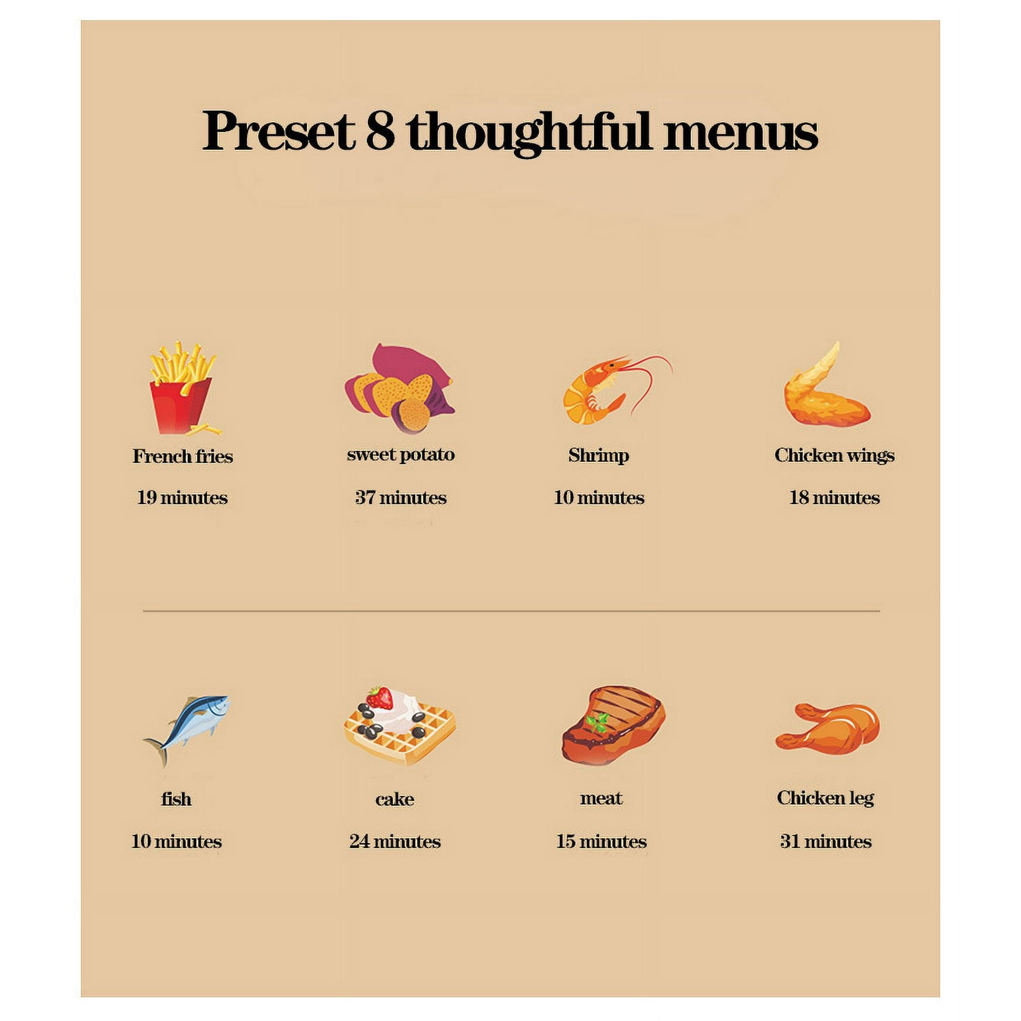 Hozodo Air Fryer with Visible Window is your all-in-one solution for healthier and more convenient meals. Equipped with a vibrant digital display, this air fryer brings a new level of convenience to your kitchen. its visible window design lets you monitor your food as it cooks, ensuring perfect results without the need to interrupt the cooking process. This high-tech kitchen workhorse features an impressive eight cooking functions in one sleek appliance, making Hozodo air fryer perfect for busy households and culinary enthusiasts alike. Specification: Item Name: 8 in 1 Air Fryer Non Toxic Material: Stainless Steel Color: Black, Navy Blue Watts: 1350W Capacity: 8L Dishwasher-Safe: Yes Nonstick: Yes Presets: 8 Temperature range:140ºF-400ºF Product Size: 33cm*33cm*26cm Function: All in One, One-Touch Presets, Non-Toxic, Nonstick, Oil-Less Frying, Temperature Control, Touch Screen, Visible Window, Cut Oil Intake by 90% 7.5Qt Air Fryer Package List: 1* Air Fryer 1* Fry Basket 1* Instruction