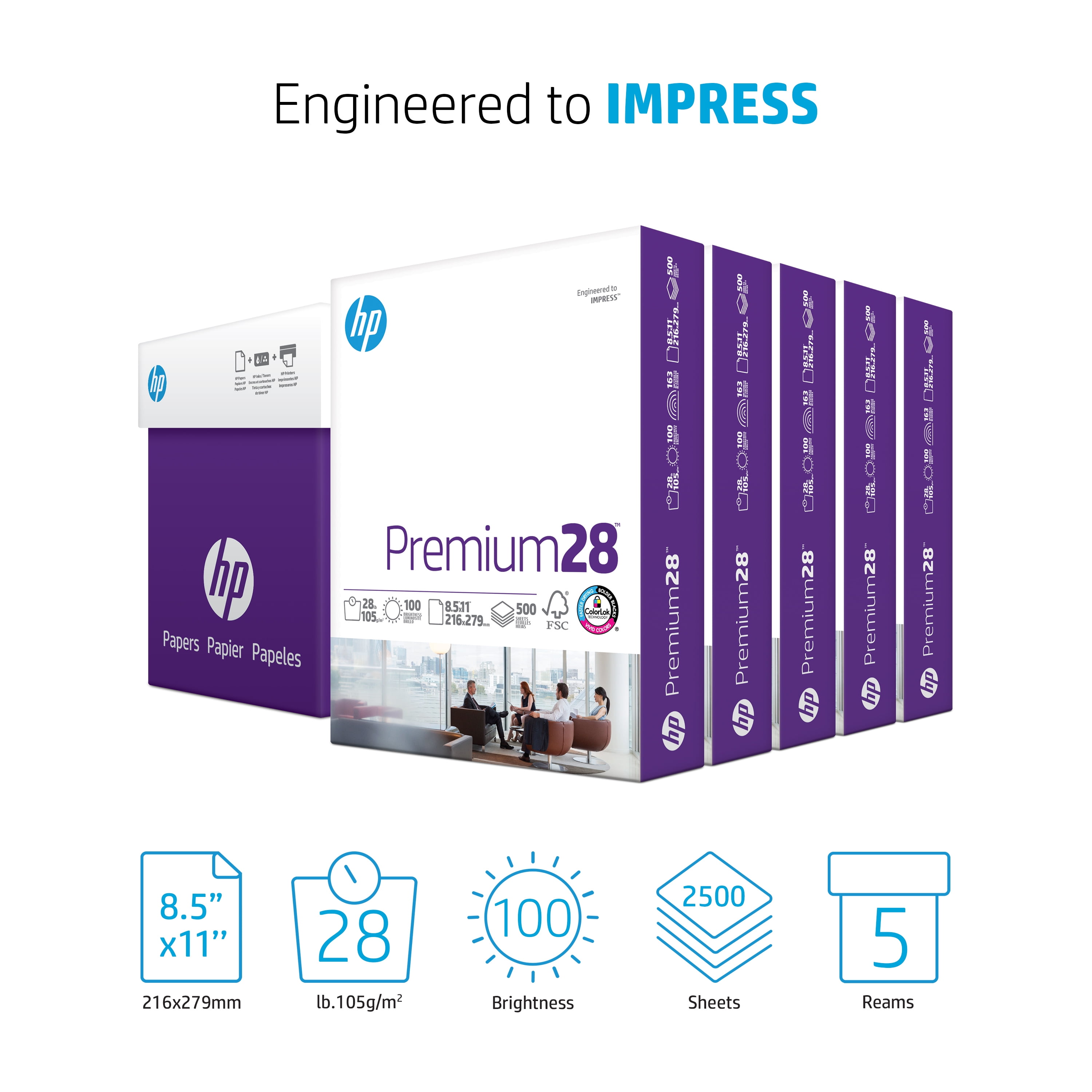 HP Printer Paper – Premium, 28 lb., 8.5″ x 11″, 2500 Sheets, White, 5 Ream