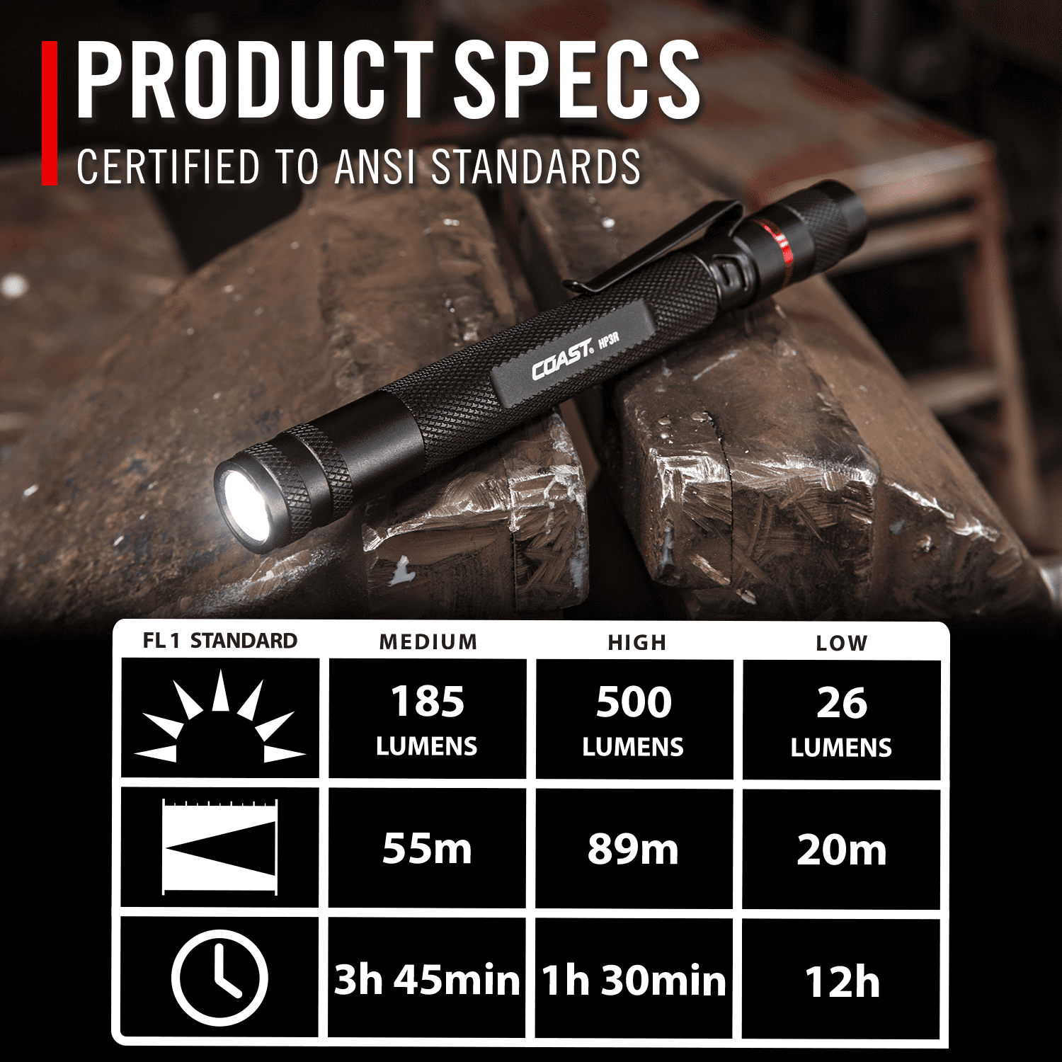 TWIST FOCUS OPTIC: The Simple Twist Focus System Goes From An Ultra View Flood Beam To Bulls-Eye Spot Beam BRIGHT: 500 Lumens In A Small Package Perfect For A Pocket And Every Day Carry For Medical Personnel, Law Enforcement, Pilots, Military, And More DUAL POWER: This Light Operates With Both Standard Alkaline Batteries And Our Custom Rechargeable Batteries. Battery Cartridge And Batteries Included TOUGH AND RELIABLE: IP54 rated design for water resistance and durable body for 1-meter drop protection. Backed by the COAST Lifetime warranty against defects in materials and workmanship HERITAGE: For 100 Years, And Three Generations Of The Brands Family, Coast Has Made Products That Make People’s Jobs And Recreation Easier, Safer And More Enjoyable Black